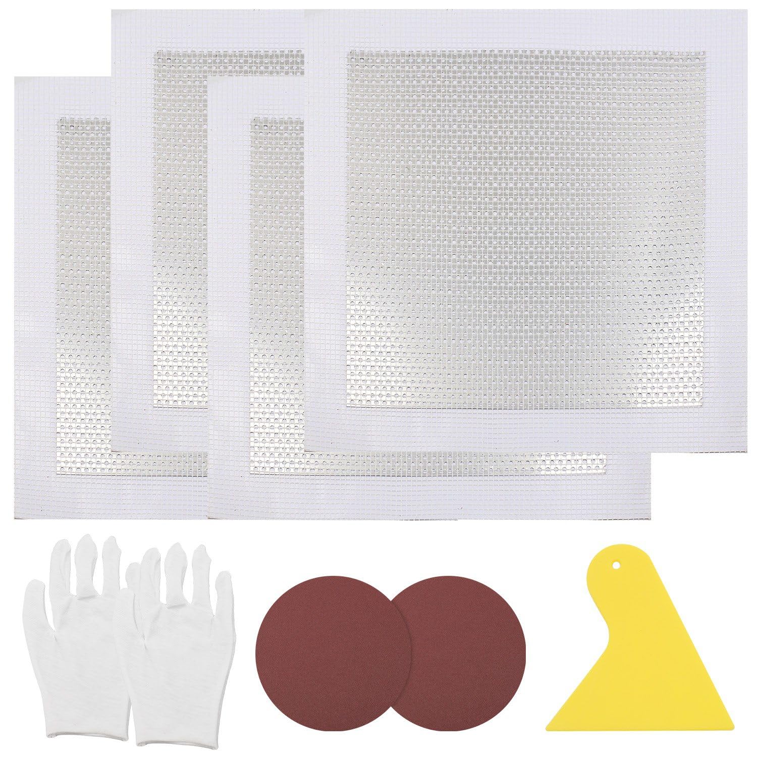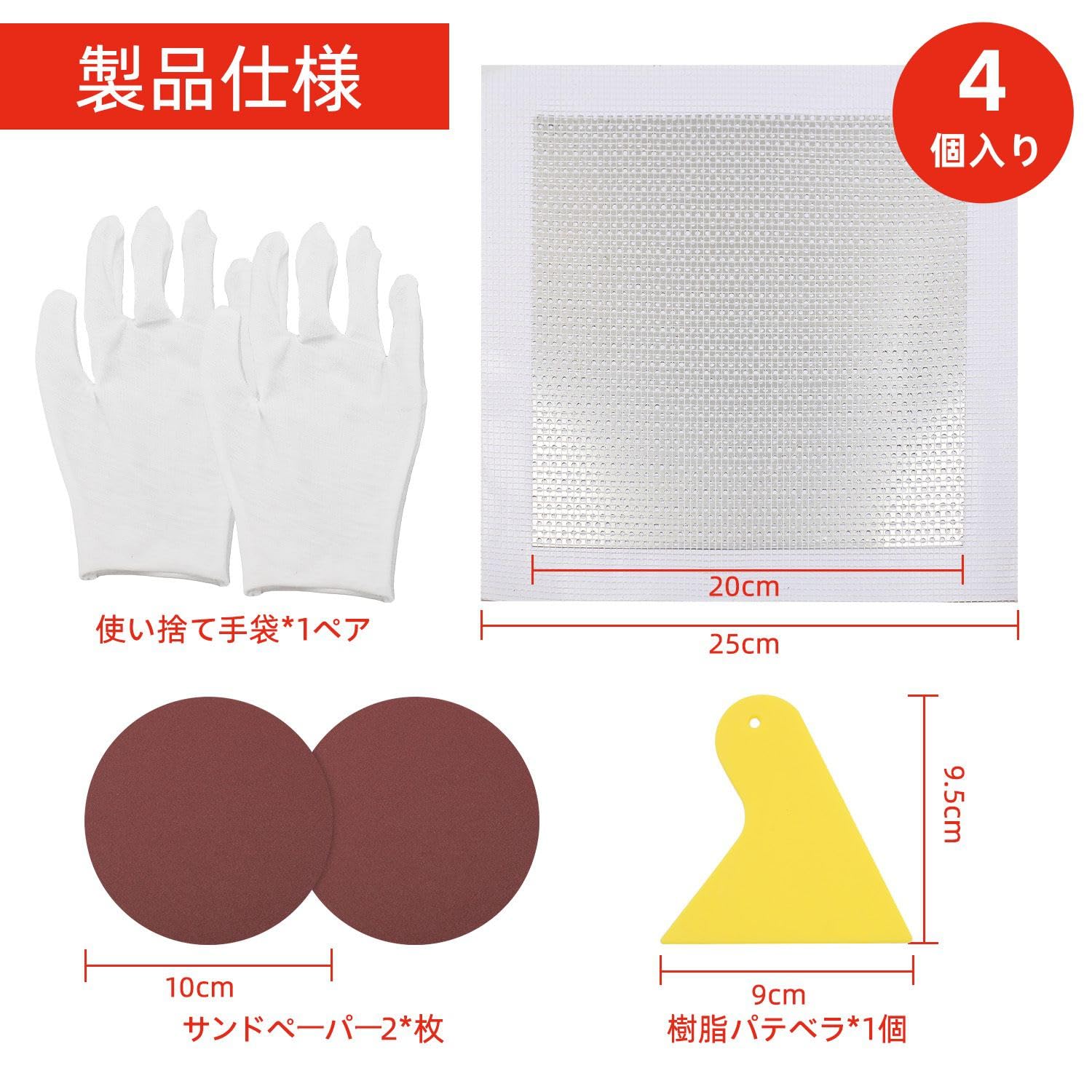 KKLM リペアプレート 4枚セット 壁穴補修キット 25*25cm アルミメッシュ枠20×20cm付き グラスファイバー&アルミ板使用 石膏ボード修理パッチ パテベラ 使い捨て手袋 サンドペーパー付き 穴埋め修理キット