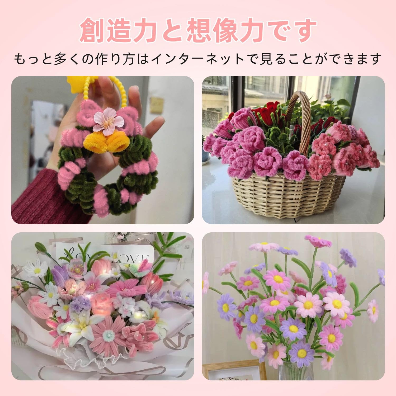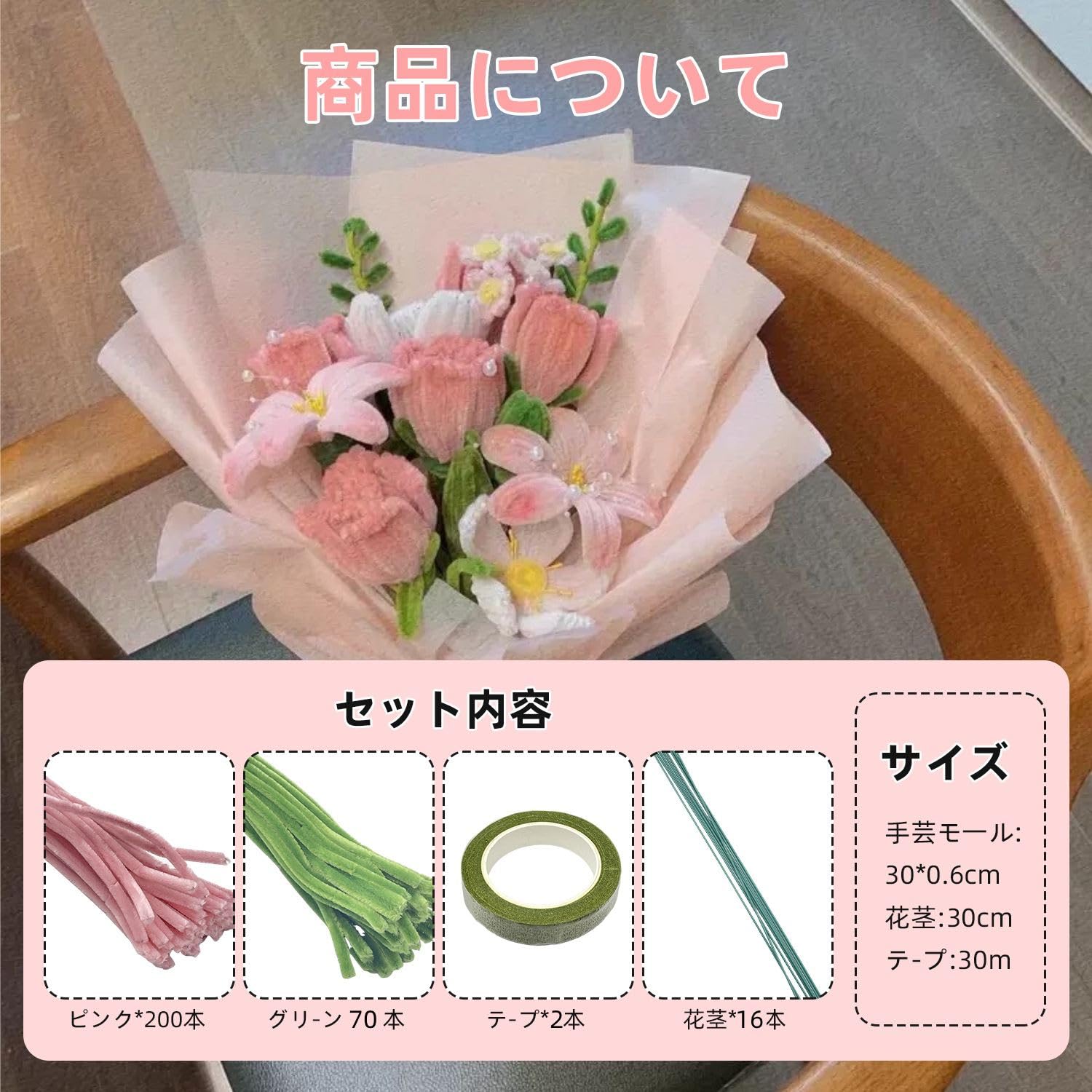手芸モール 工作 モール セット モール 造花 作成キット カラーモール 300本 花束 手作りキット 手芸素材 造花の茎 20本入とフラワーテープ 緑2巻と造花のおしべ約400個付き DIY 飾り物 学校 手芸用 誕生日 母の日 バレンタインデー 贈り物 (ピンクセット)