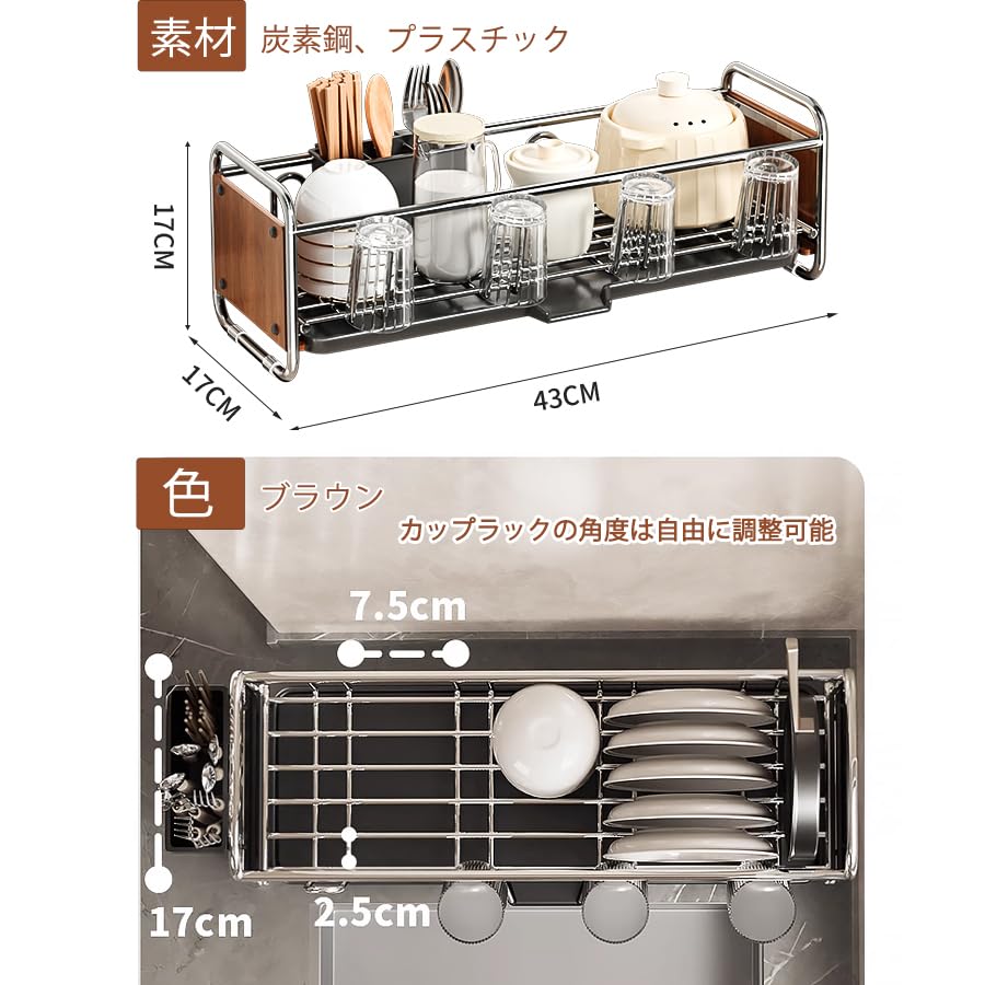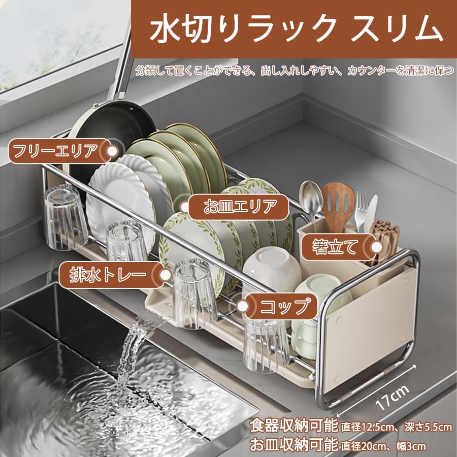 Zilnox 水切りラック スリム 食器 水切り かご シンク上 ラック 大容量 キッチン 箸立て 省スペース 食器乾燥 ブラウン 幅43*奥行17*高17CM