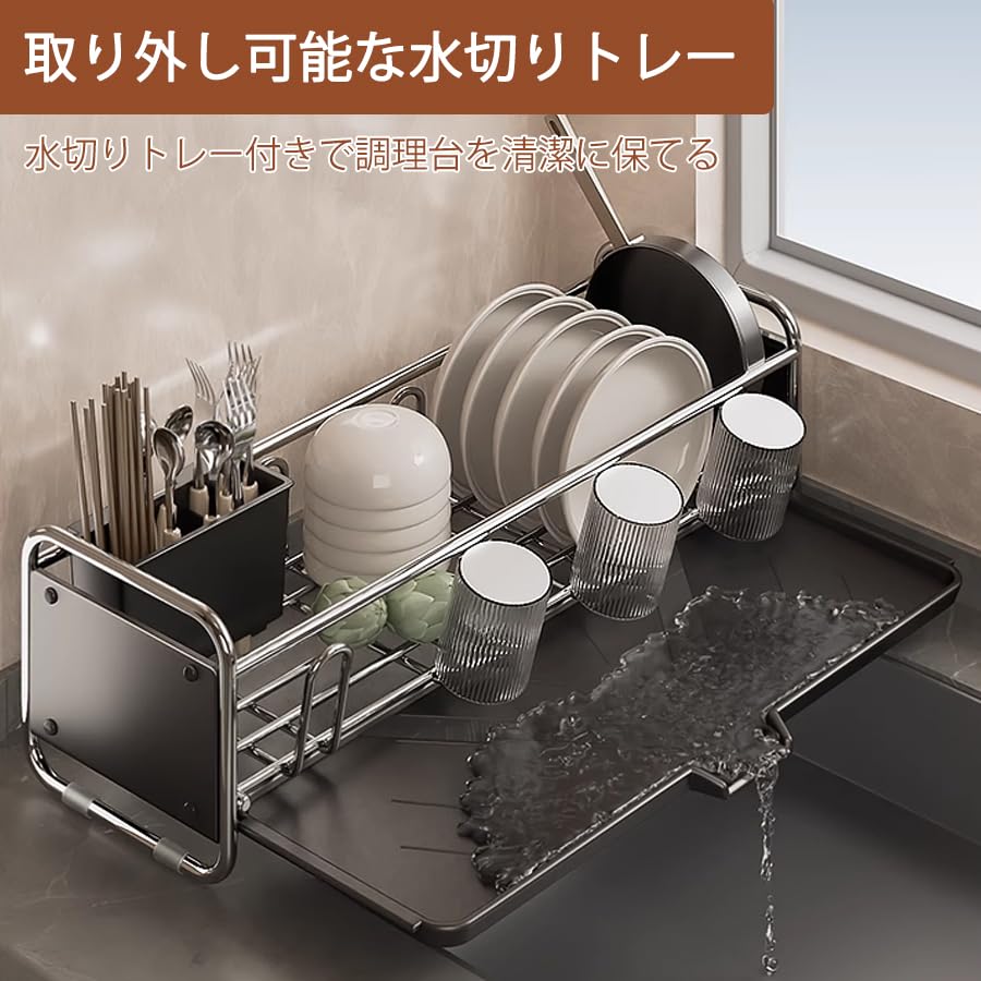 SANNO 伸縮水切りワイヤーバスケット ステンレス水切りかご 食器水切りラック スライド式キッチンラック 黒いカトラリーホルダー付き
