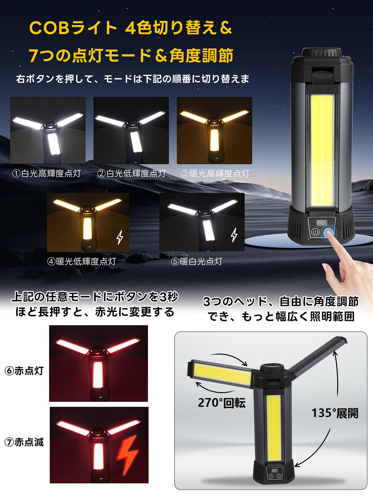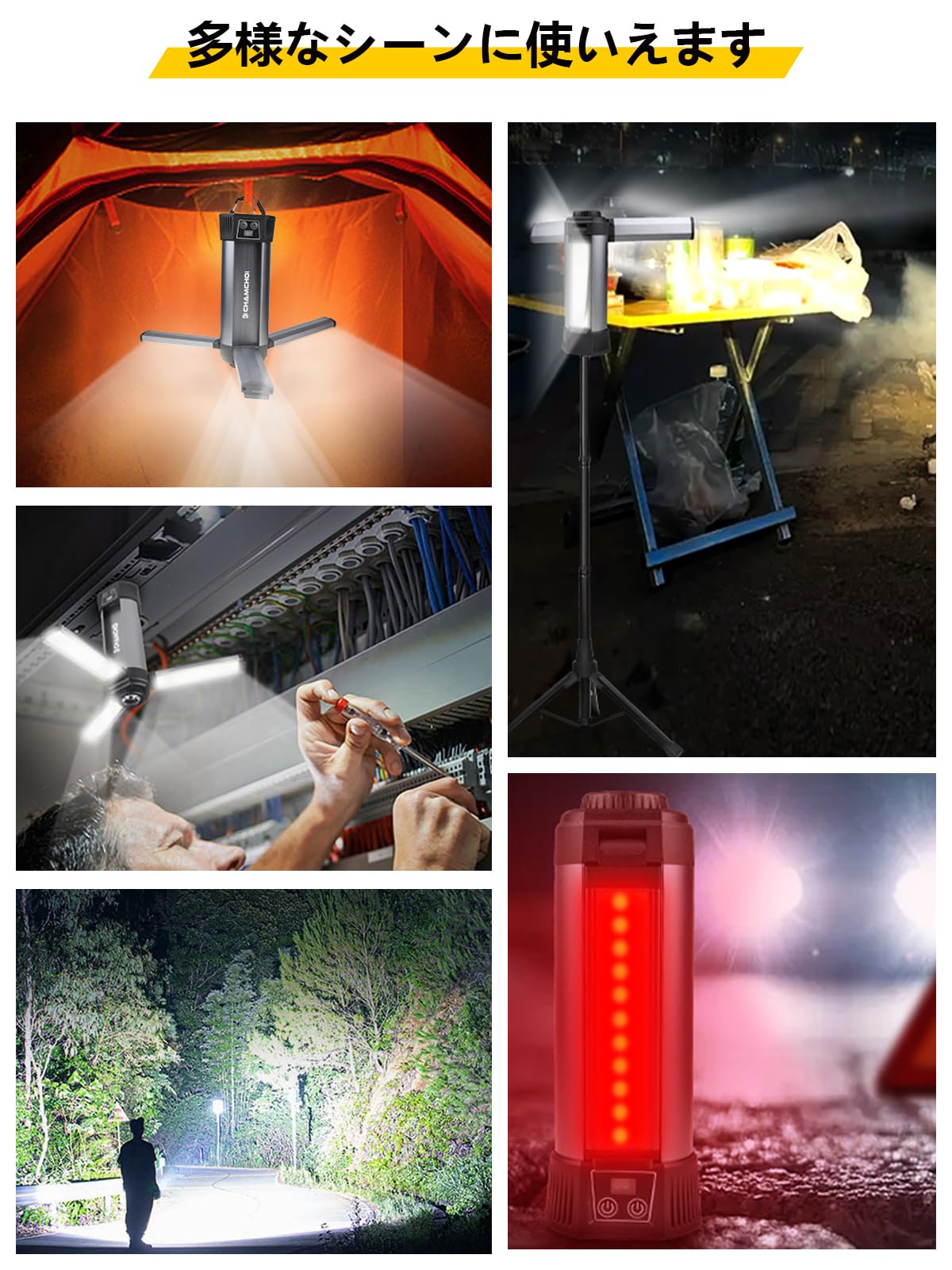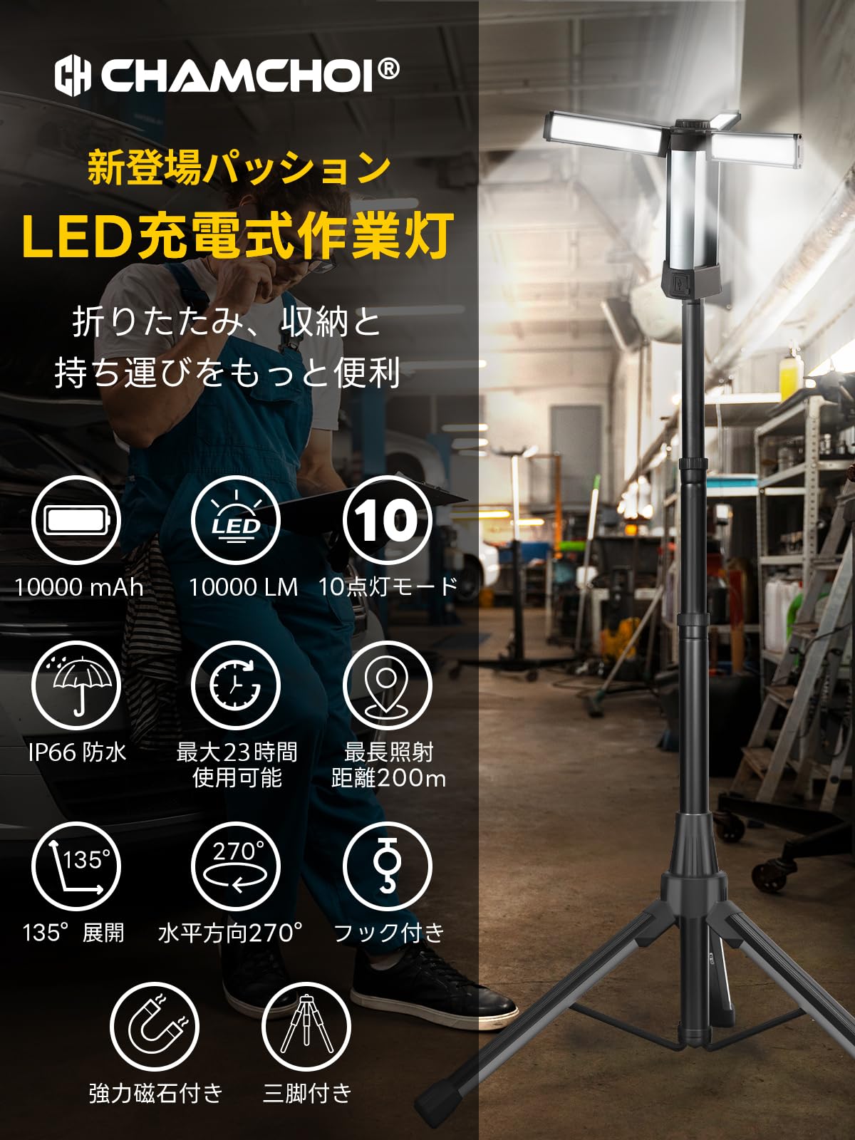 led作業灯 アップグレード版三脚付き 10000mAh大容量 10000LM 最大23時間連続点灯 ワークライト 10点灯モード 4色切り替え 屋外用 Type-c充電 270度方向調整 懐中電灯機能 ライト ハンディライト 高度調節可能 屋外照明/集魚灯/夜間工事/駐車場灯/アウトドア/キャンプ/停電対策/緊急照明