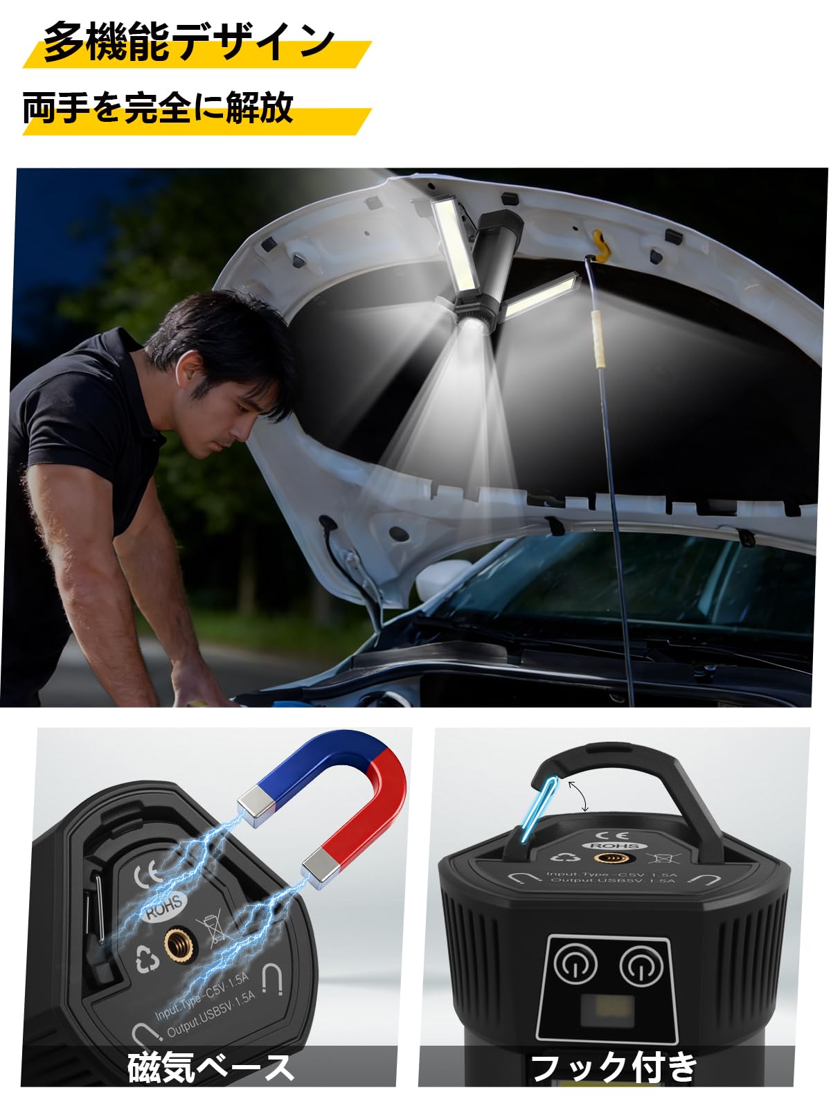 LEDライト マグネット USB充電式 5照明モード 調光3段階 SOS点滅 2200mAh 60W 超高輝度 室内/アウトドア/作業用/緊急対応/停電対策 携帯型 多機能 懐中電灯 防災 夜用品 車検 車中泊照明 機械修理 点検 多用途 キッチンライト 作業ライト