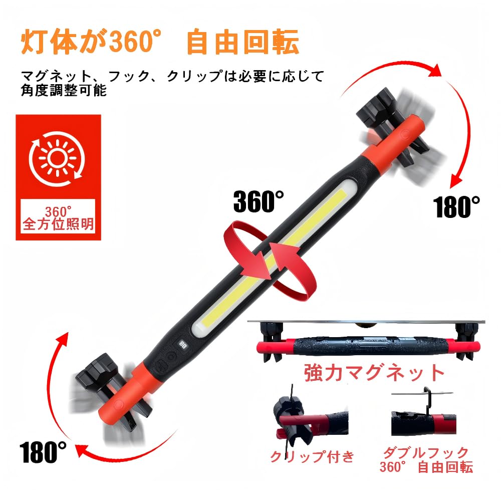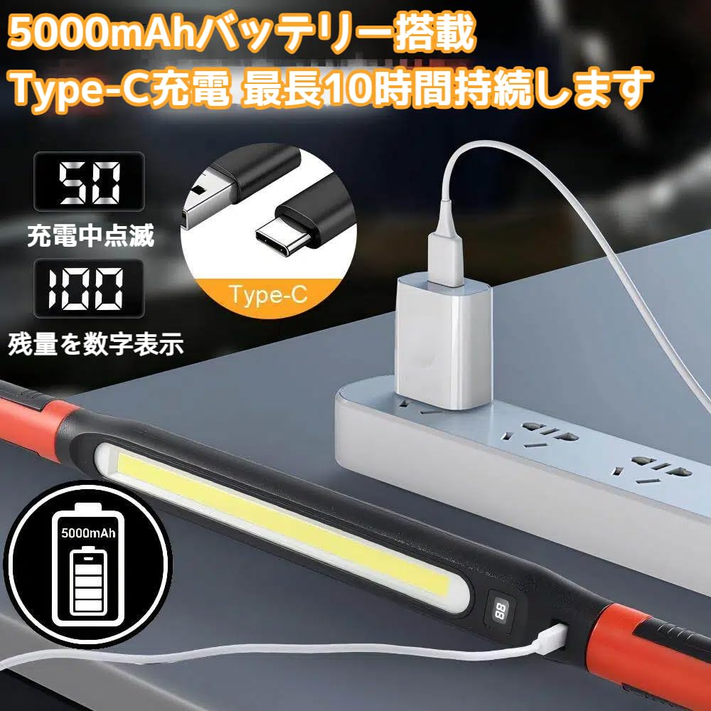 Benature 作業灯 LED ワークライト USB充電式 折り畳み式 懐中電灯 COBライト ハンディライト マグネット付き フック付き 7つの点灯モード 500ルーメン 360°回転 IPX6防水 緊急対応 自動車整備 夜間作業 夜釣り キャンプ用 アウトドア 小型