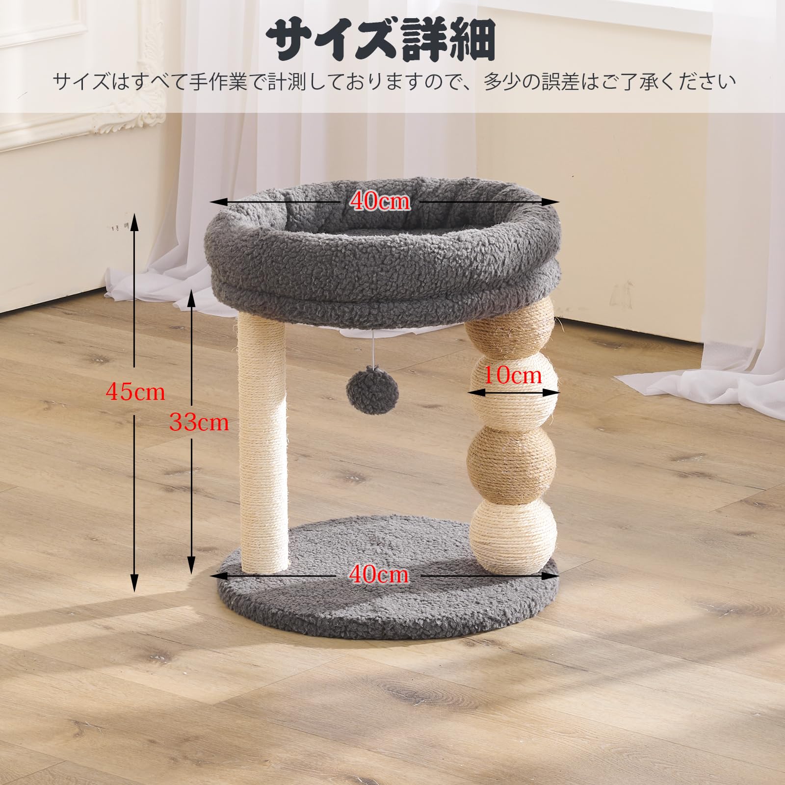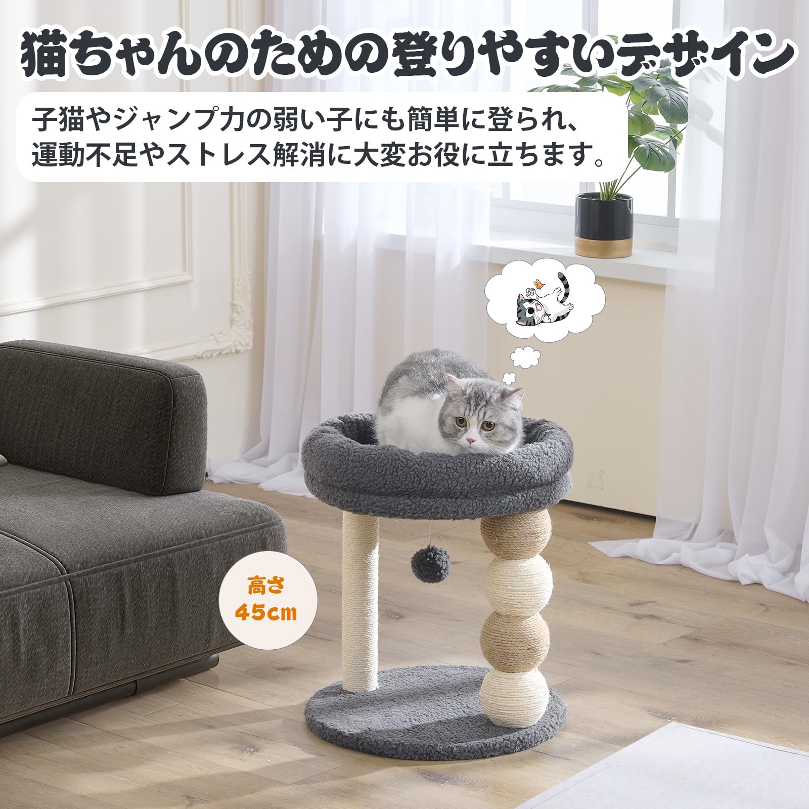 U-YocanPet キャットタワー ミニ 猫タワー 小型 低め 据え置き 省スペース 麻紐爪とぎ シンプル かわいい ボール型猫爪とぎ おもちゃ付き 大きい展望台 組み立て簡単 高さ45cm グレー