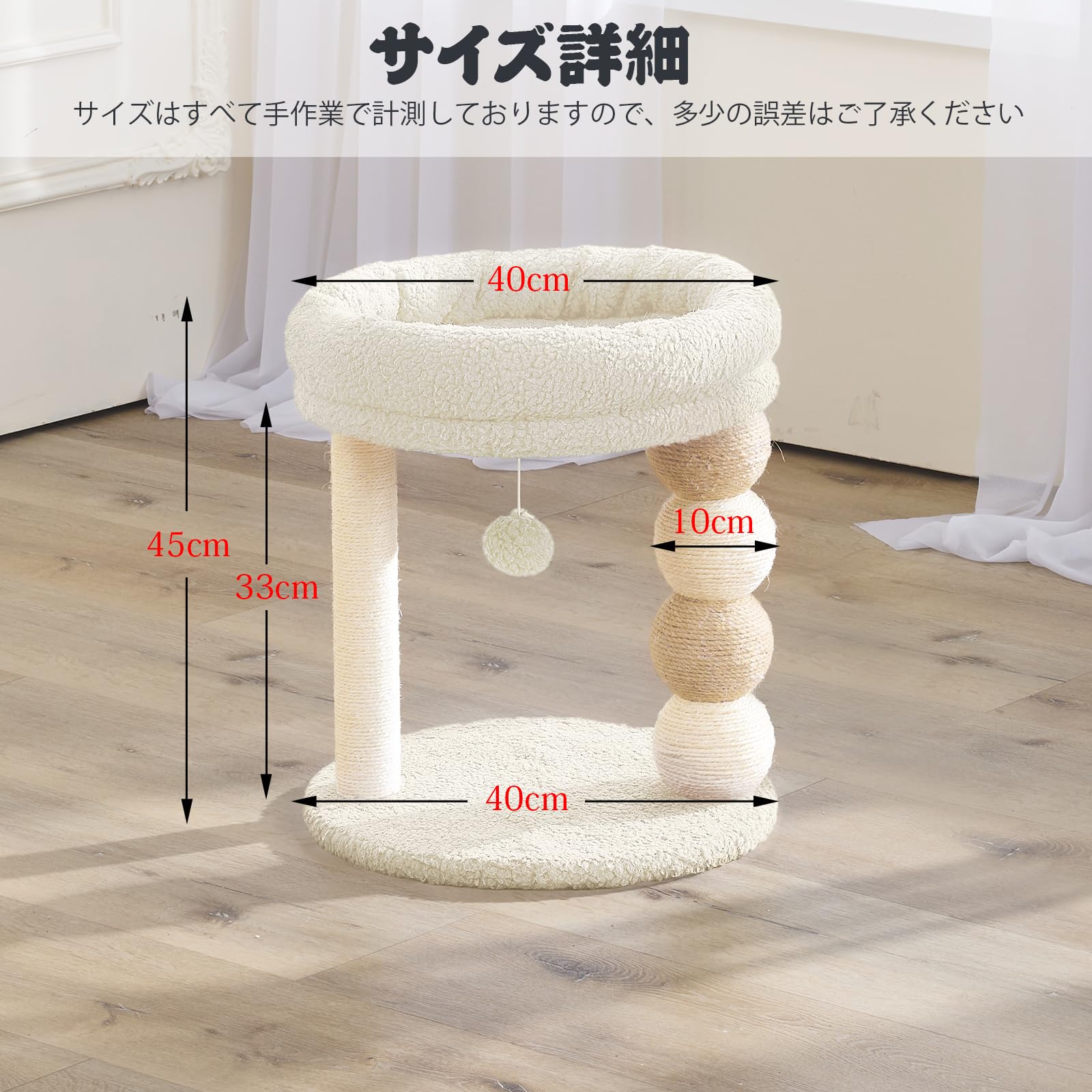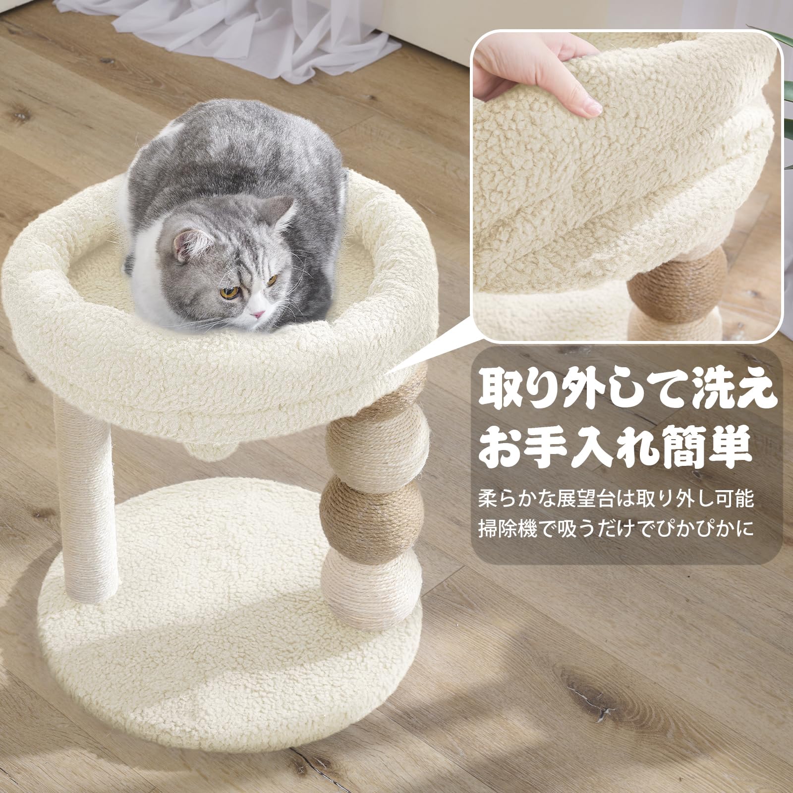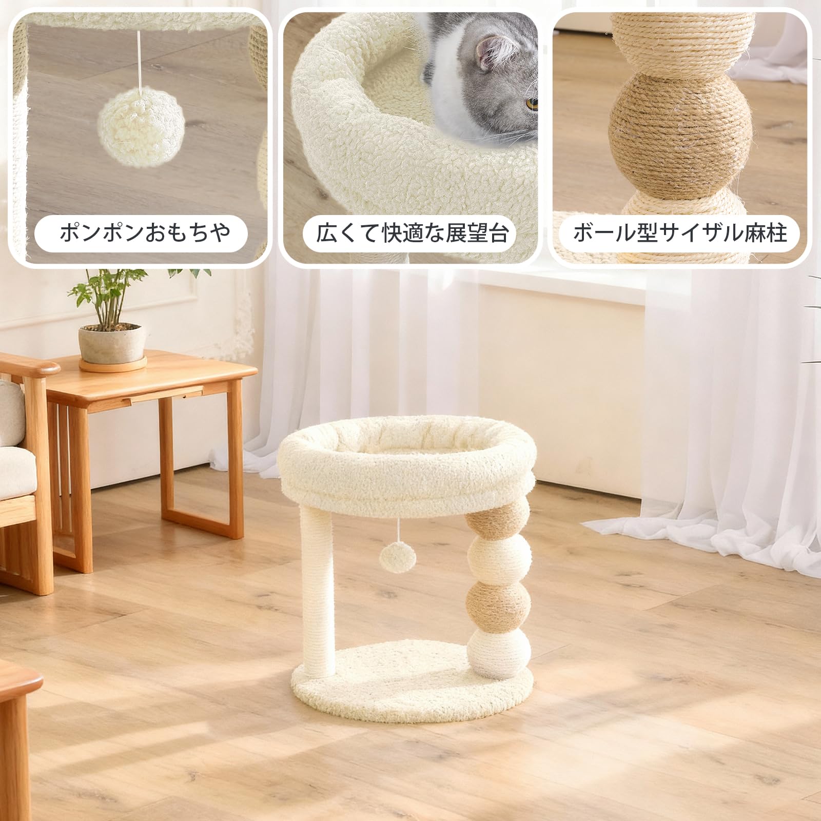 U-YocanPet キャットタワー ミニ 猫タワー 小型 低め 据え置き 省スペース 麻紐爪とぎ シンプル かわいい ボール型猫爪とぎ おもちゃ付き 大きい展望台 組み立て簡単 高さ45cm ベージュ