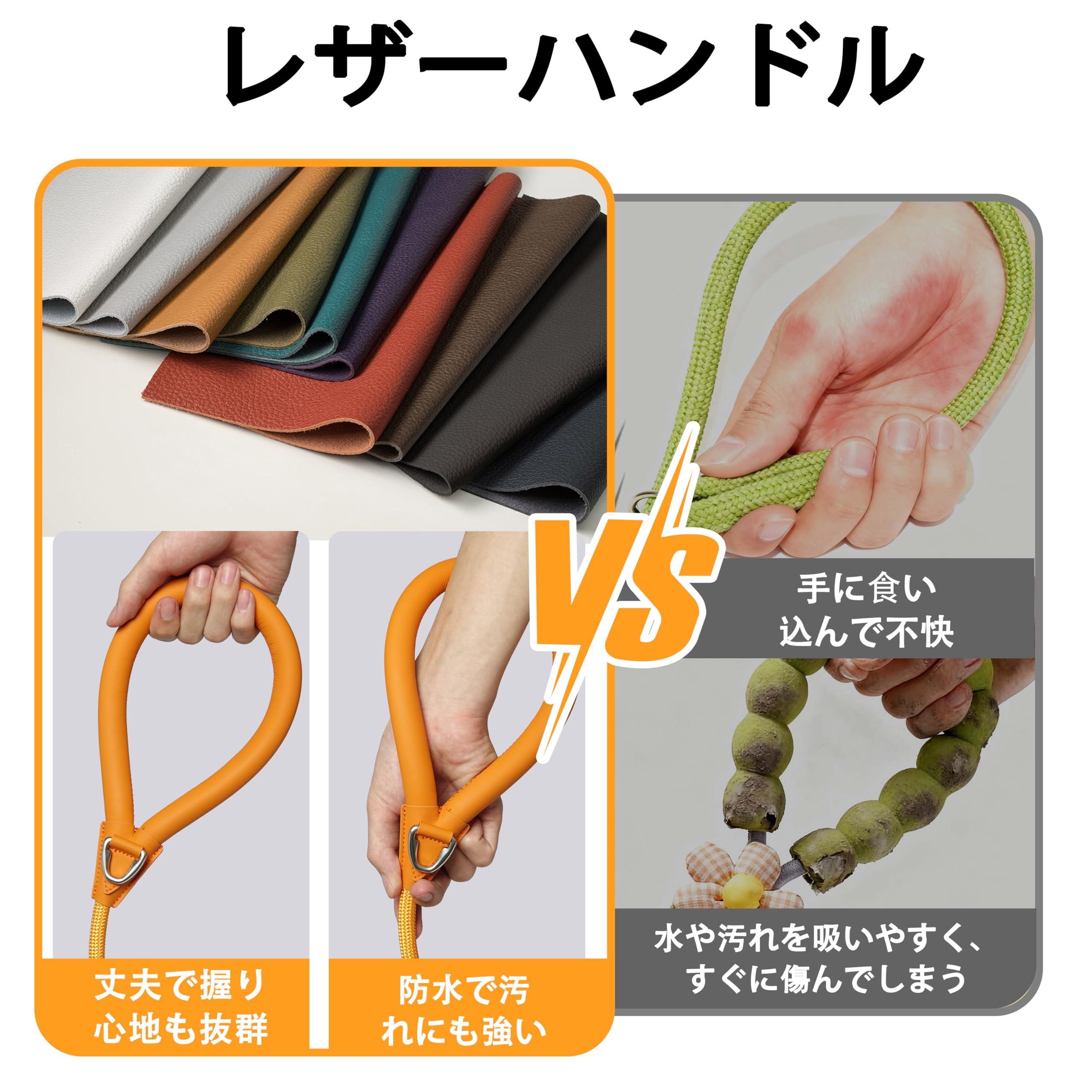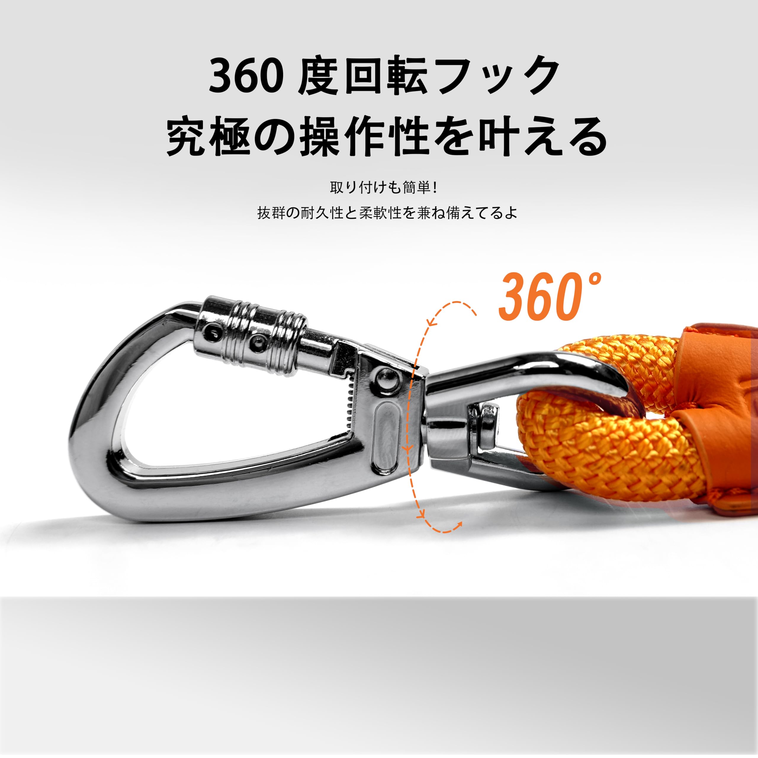 中型犬・大型犬向けに設計された、快適で丈夫な犬用リード この犬用リードは、快適性と耐久性を両立するために設計されています。手に優しいマイクロファイバーレザーのハンドルは柔らかく握りやすく、長時間の散歩でも手への負担を軽減します。さらに、クライミングロープ構造を応用した強化ナイロンロープを採用し、中型犬・大型犬の引っ張りにも耐える高い強度を実現しました。 360°回転ロック付きフックによりリードのねじれを防ぎ、散歩やトレーニング中もスムーズに使用できます。また、ハンドル近くのアルミ合金Dリングは、うんち袋や小物を取り付けることができ、毎日の散歩をより便利にします。 快適な握り心地、優れた耐久性、使いやすさを兼ね備えたこの犬リードは、中型犬・大型犬との日常の散歩やアウトドア、トレーニングに最適です。