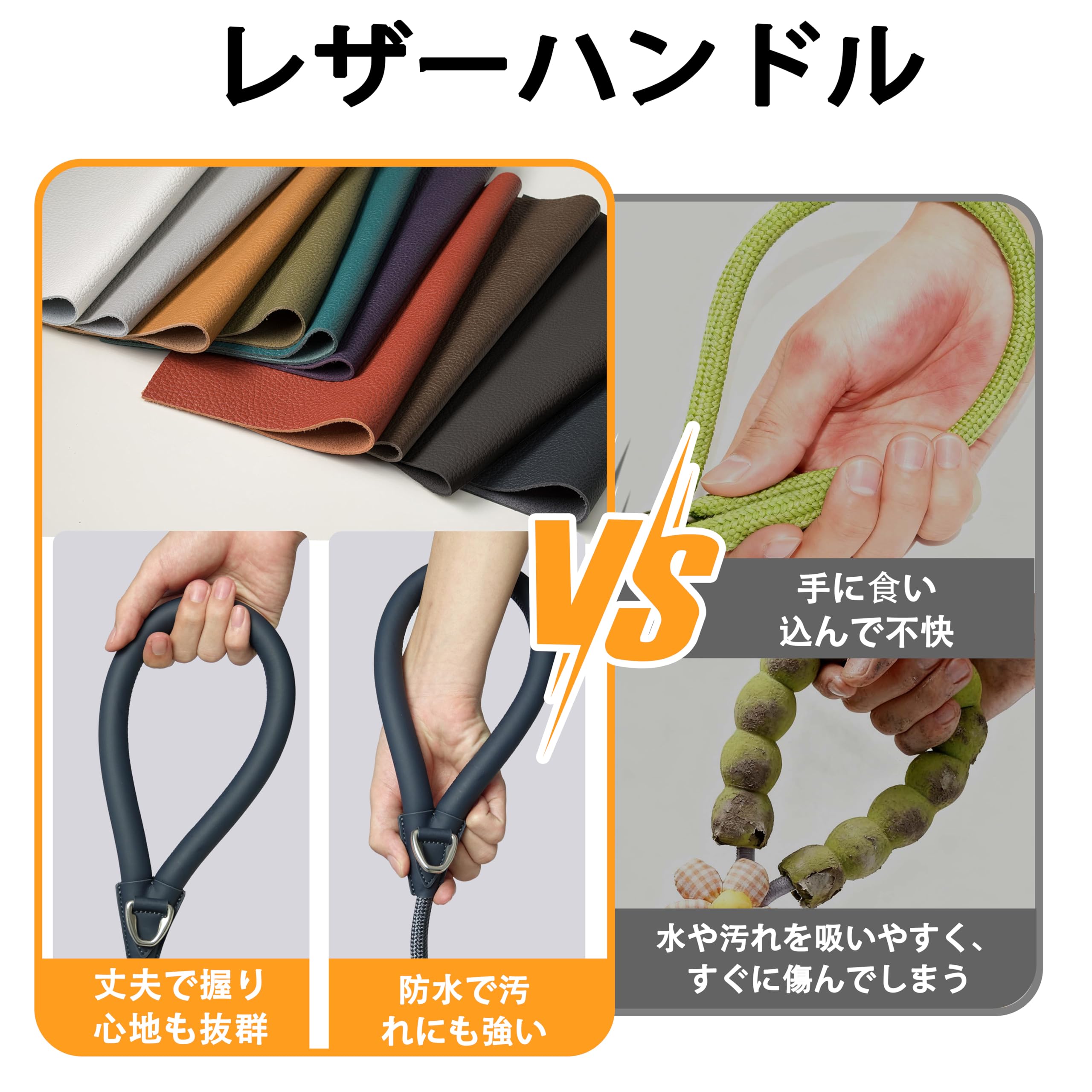 中型犬・大型犬向けに設計された、快適で丈夫な犬用リード この犬用リードは、快適性と耐久性を両立するために設計されています。手に優しいマイクロファイバーレザーのハンドルは柔らかく握りやすく、長時間の散歩でも手への負担を軽減します。さらに、クライミングロープ構造を応用した強化ナイロンロープを採用し、中型犬・大型犬の引っ張りにも耐える高い強度を実現しました。 360°回転ロック付きフックによりリードのねじれを防ぎ、散歩やトレーニング中もスムーズに使用できます。また、ハンドル近くのアルミ合金Dリングは、うんち袋や小物を取り付けることができ、毎日の散歩をより便利にします。 快適な握り心地、優れた耐久性、使いやすさを兼ね備えたこの犬リードは、中型犬・大型犬との日常の散歩やアウトドア、トレーニングに最適です。