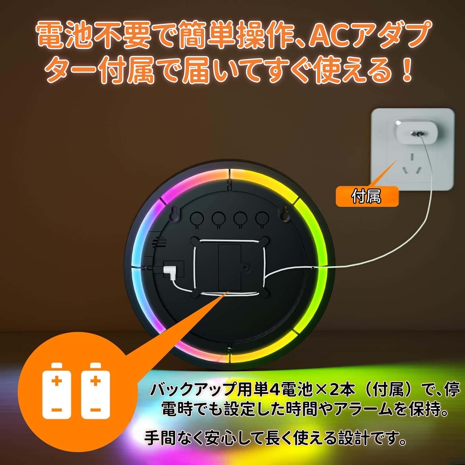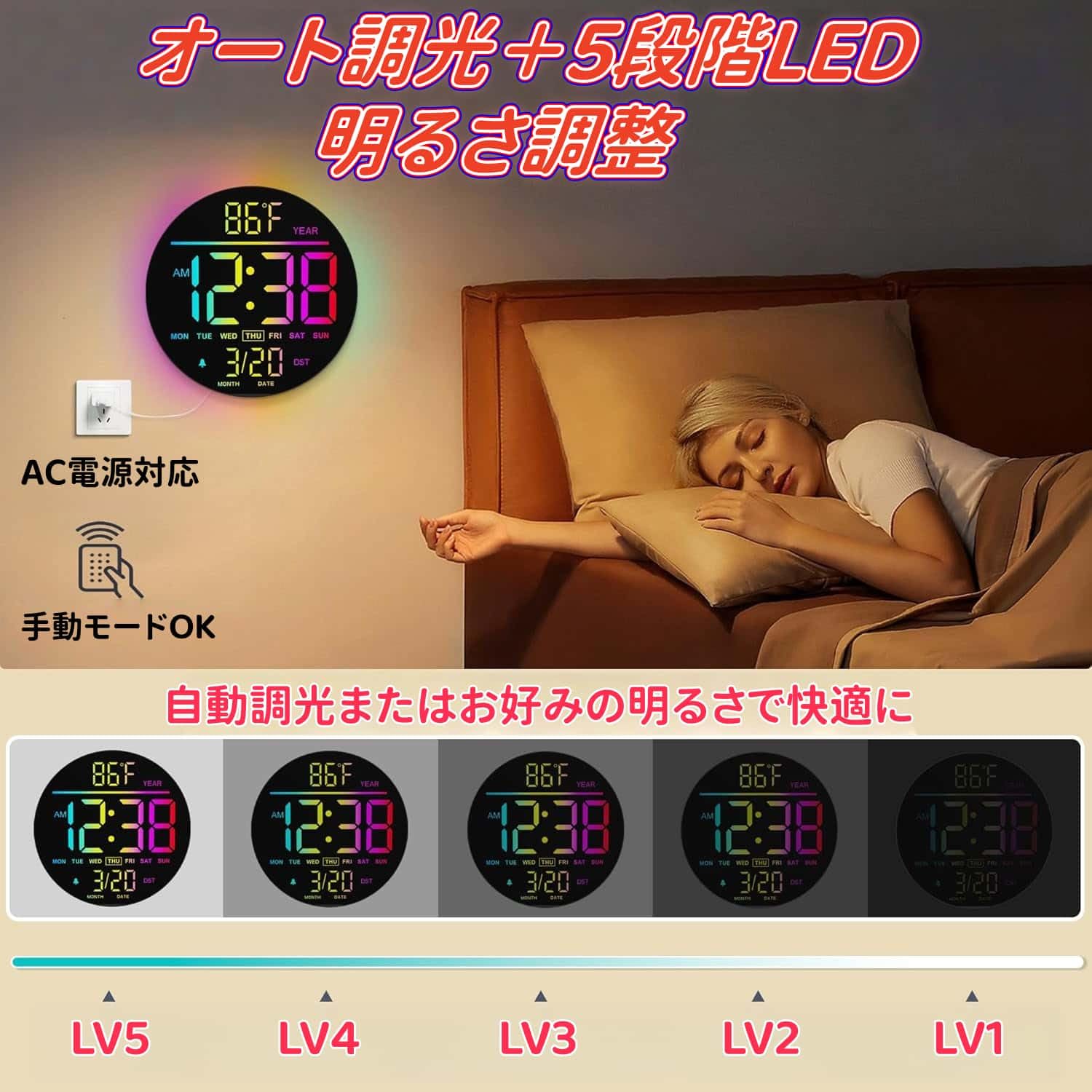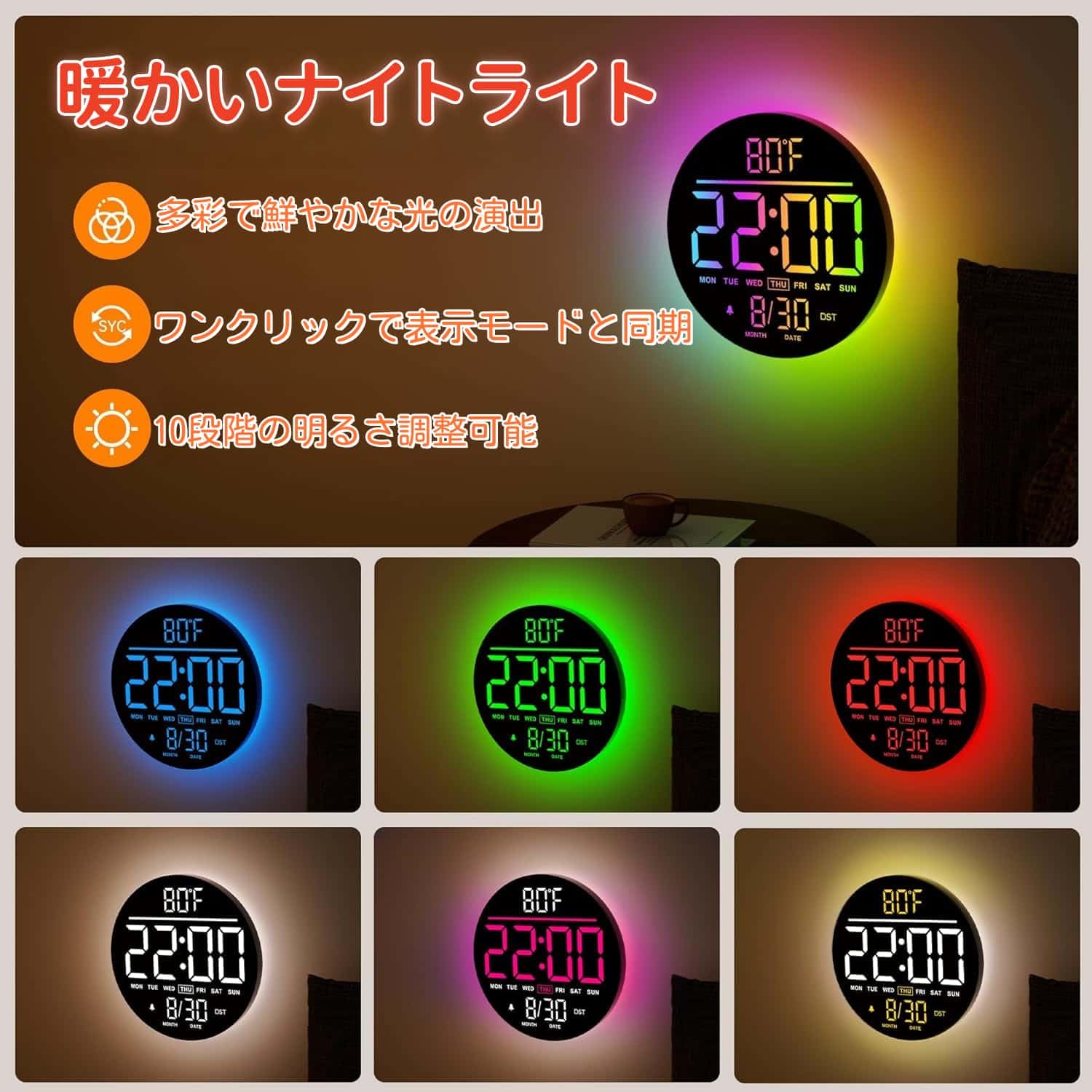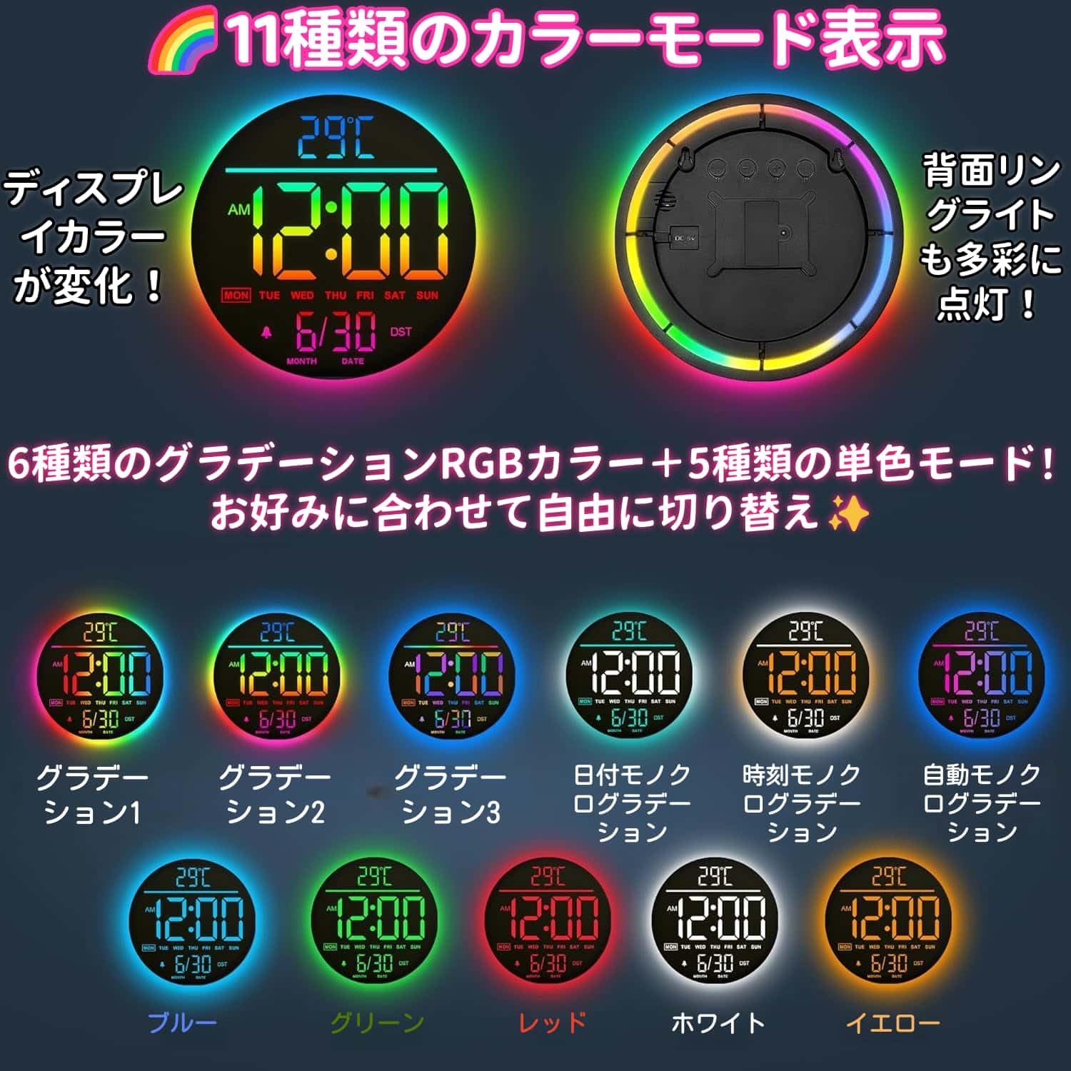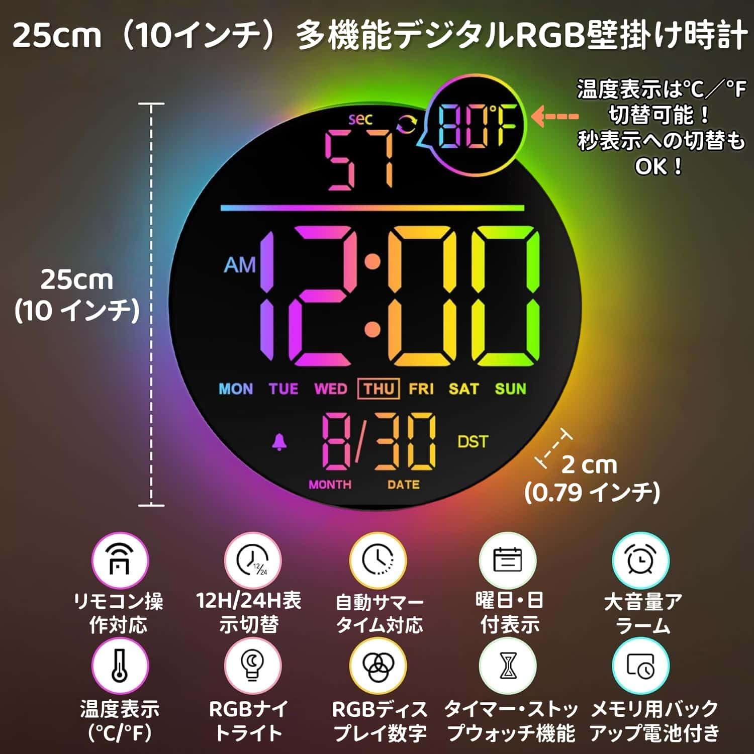 25cm(10インチ)大画面LEDデジタル壁掛け時計 リモコン付き RGB&単色表示 自動調光 アラーム カウントダウンタイマー ストップウォッチ 温度計 曜日・日付表示 秒表示 寝室・リビング・オフィス・教室・ジム用 クリスマス・誕生日ギフト RGBグラデーションナイトライト USB給電式 アダプター付属 (ブラック)