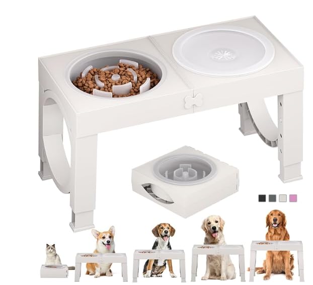 Aystkniet犬 食器台 ペット 餌台 ステンレスボウル 食器 エサ台 4段階 高さ調節可能 餌入れ 犬 ご飯台 フードボウル 台 お皿 中型犬 大型犬 ペット用品 食器 フードスタンド付き ステンレス製 ペット皿 滑り止め 給餌容器 給水容器 コンパクト ボウル 取り外し可能 ボウル2個 給餌 水やり 折り畳んで収納 洗いやすい (早食い防止犬 食器台 白い)