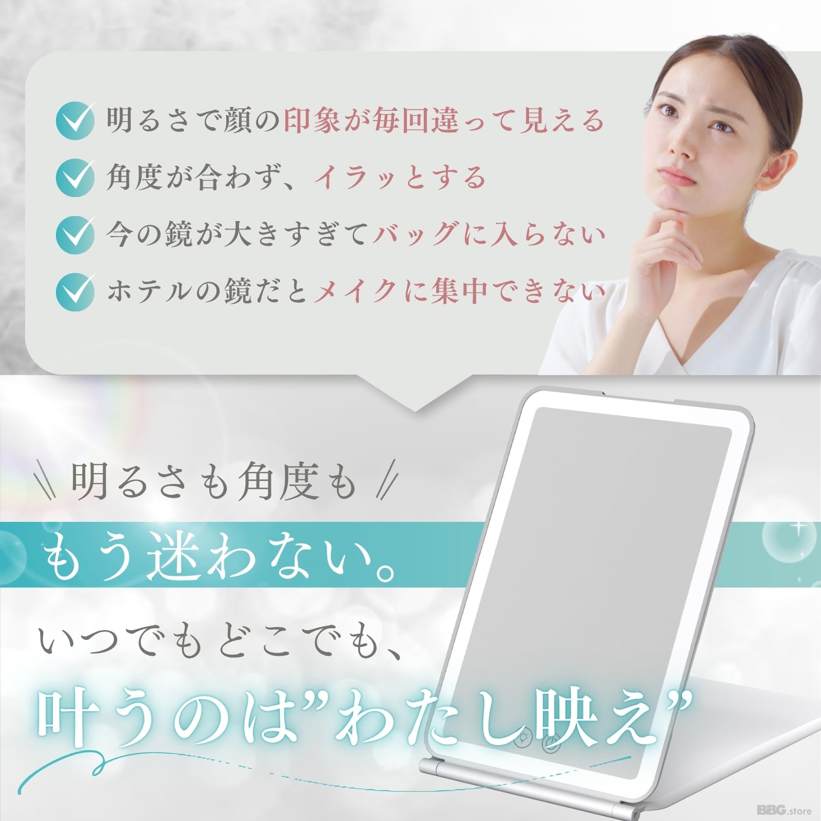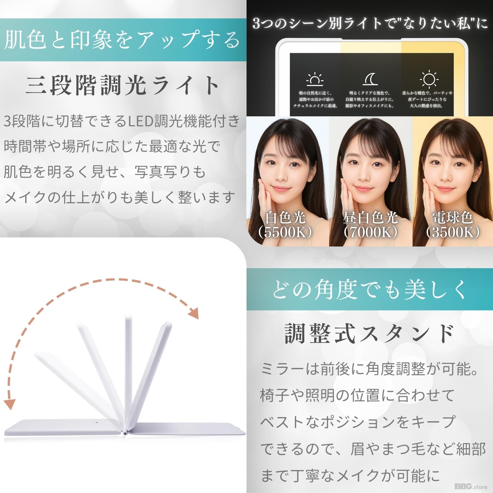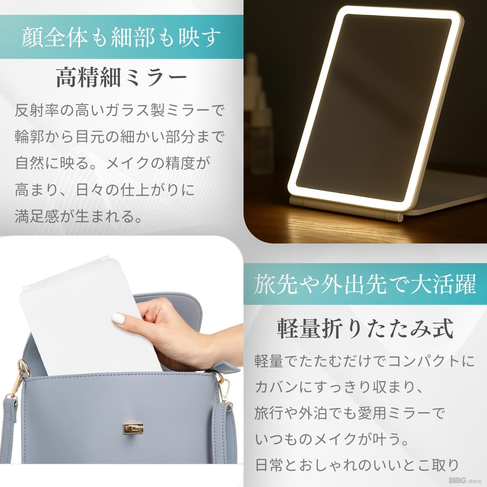 BBG.store 女優ミラー 卓上鏡 LEDライト付き 化粧鏡 折りたたみ式 軽量 メイク用 旅行用 コンパクト 自立式 小型鏡 明るさ調整 スタンドミラー