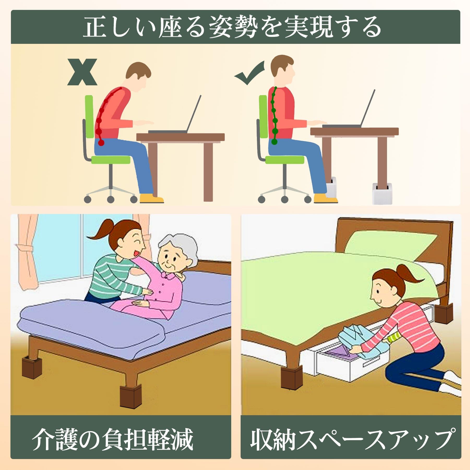 Umelee テーブル 高さ調整 12.5cmかさあげ 家具脚・家電足の高さ調節器具 8.1cm大足に対応 コタツ ソファ ベッド 机 テーブル 脚 継ぎ足し 滑り止め 床に傷防止 1000kg耐荷重 4個入り(ベージュ)