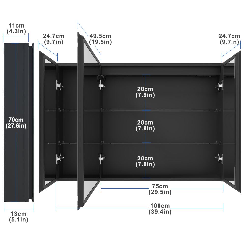 KWW LEDライト付きバスルーム薬キャビネットソケット&USB、曇り止め、調光可能、3色ライトメイクアップミラー、取り付け簡単、壁掛けキャビネット (75.1 x 70 cm)