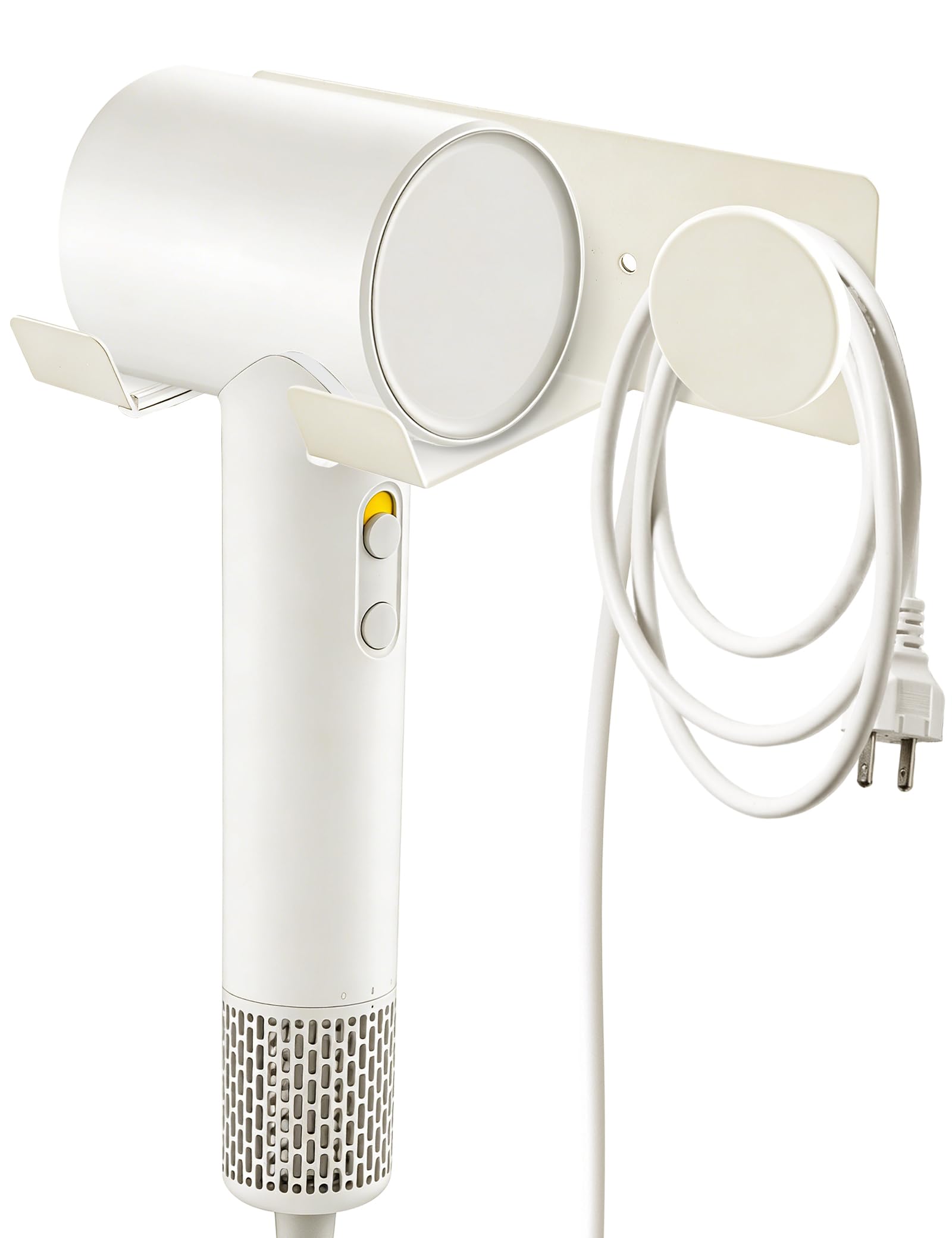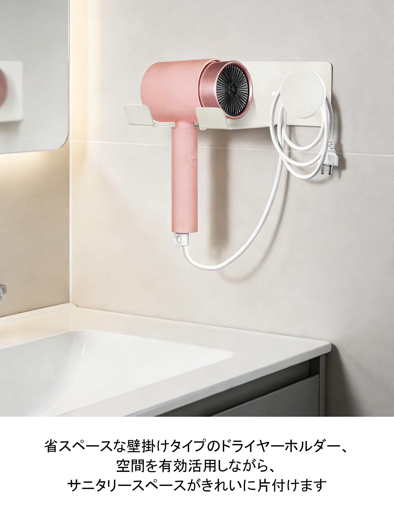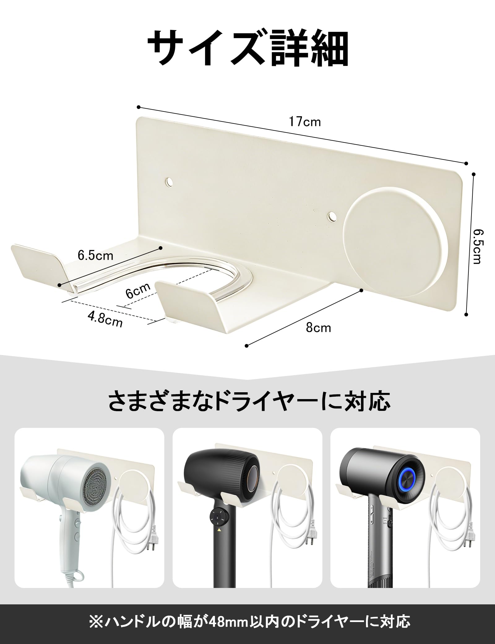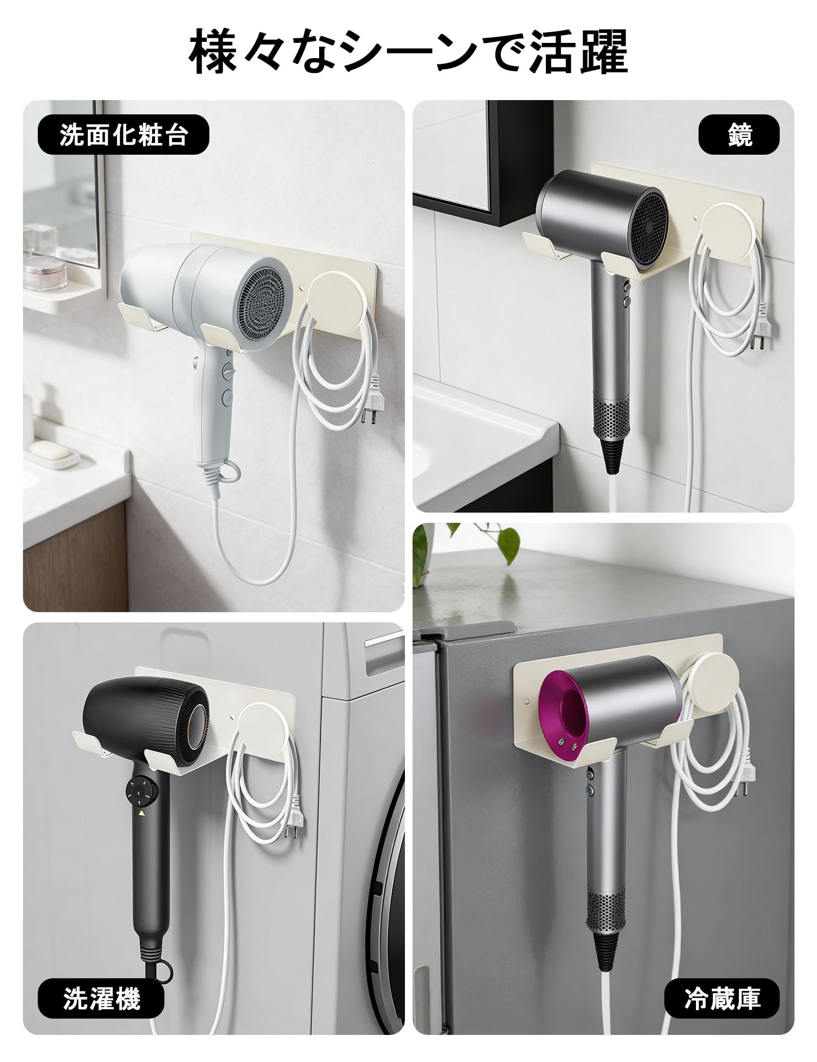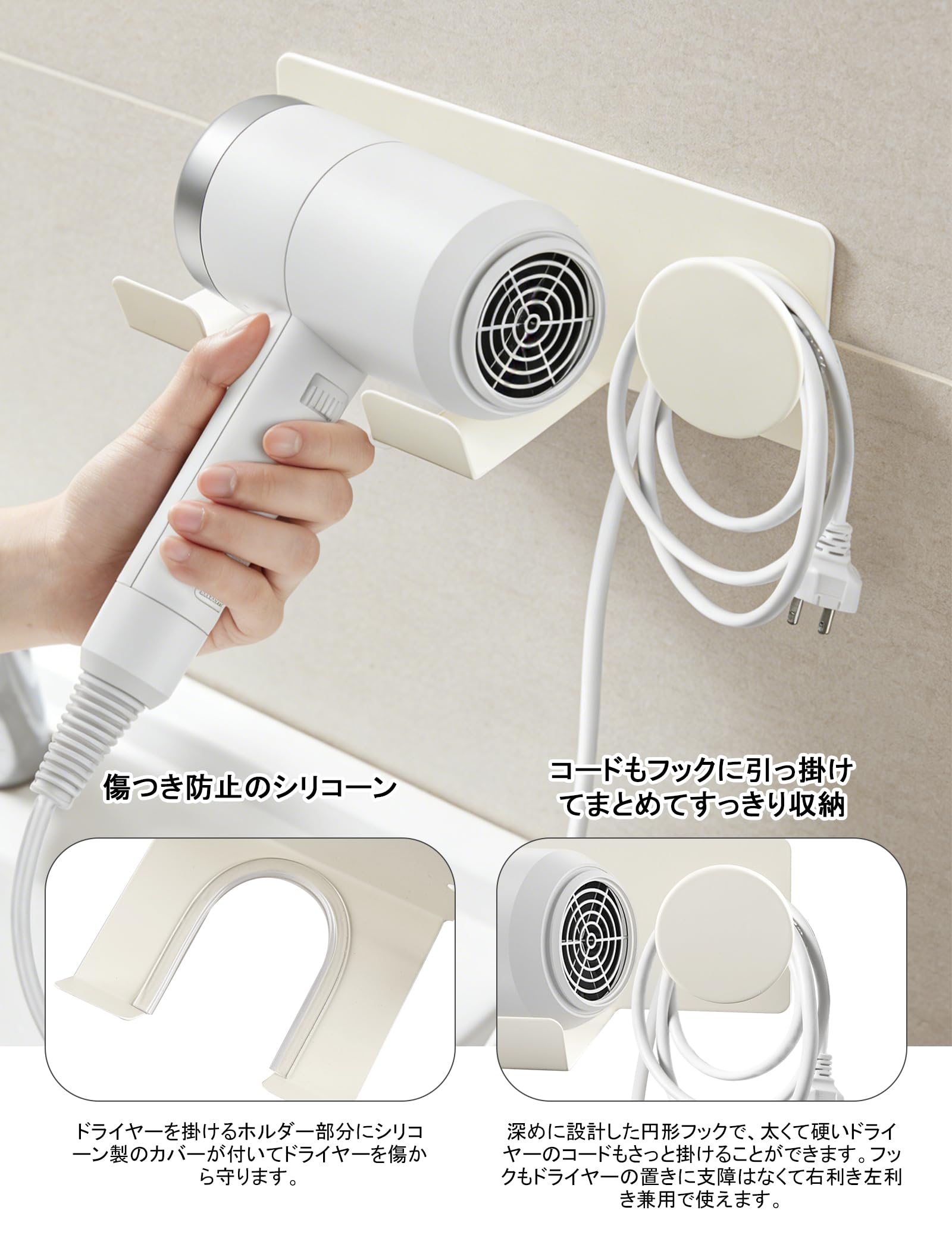 ドライヤーホルダー マグネット ヘアドライヤースタンド 壁掛け 洗面所/浴室/バスルーム/洗濯機にかける収納 ウォールハンガー ドライヤー置き コードまとめて収納フック付き (アイボリー)