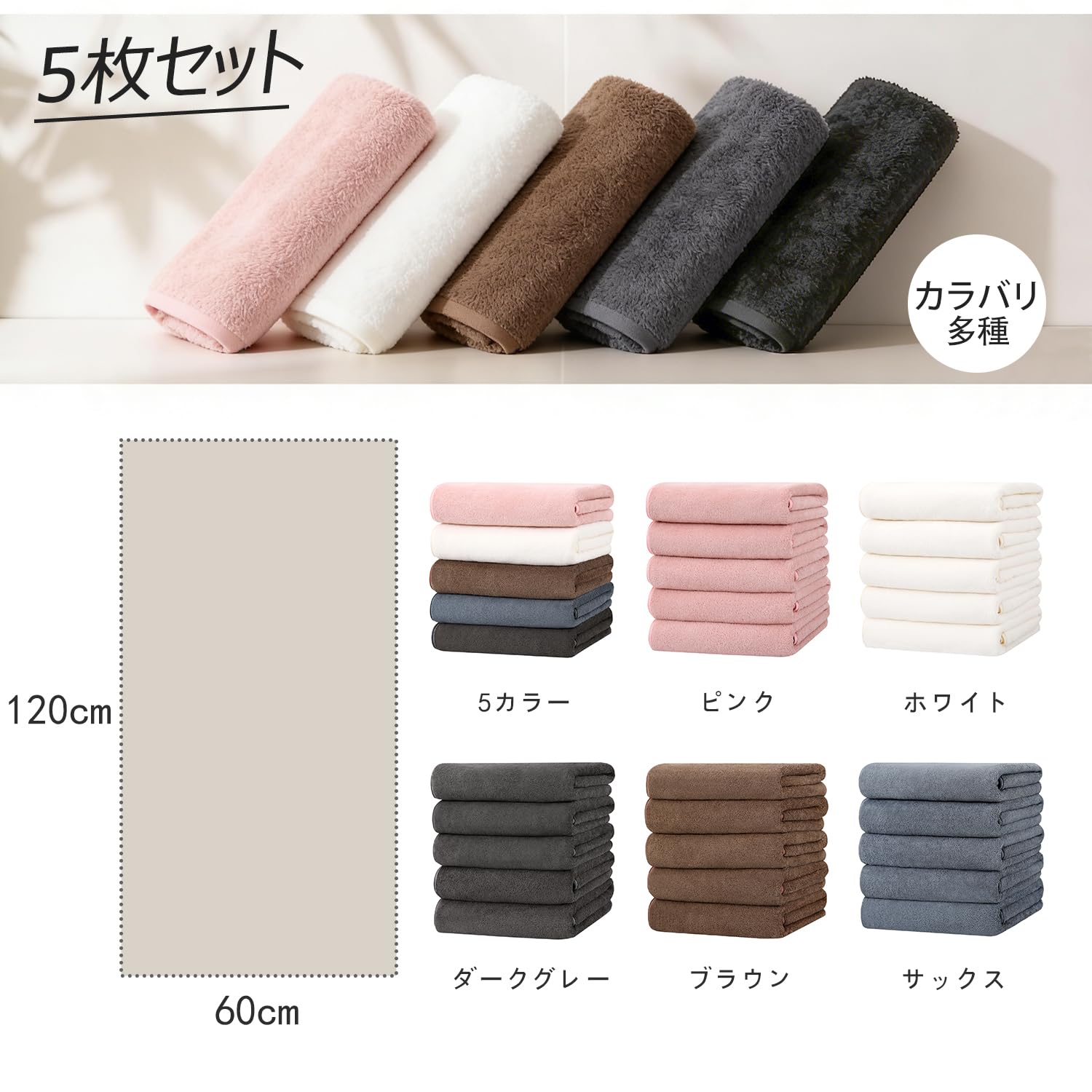 バスタオル マイクロファイバー 5枚セット タオル ホテル仕様 大判 60x120cm ふわふわ 瞬間吸水 速乾 耐久性 家庭 業務用 エステ サロン バス用品 新生活 ギフト (5色)