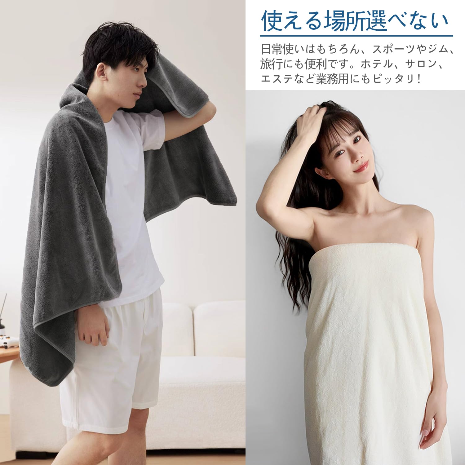 HOMEXCEL バスタオル 薄手 2枚セット 大判 マイクロファイバータオル ジム プール 温泉 ビーチ 枕 タオル, 吸水速乾 毛羽たたない バス用品, 約138×69cm (グレー)