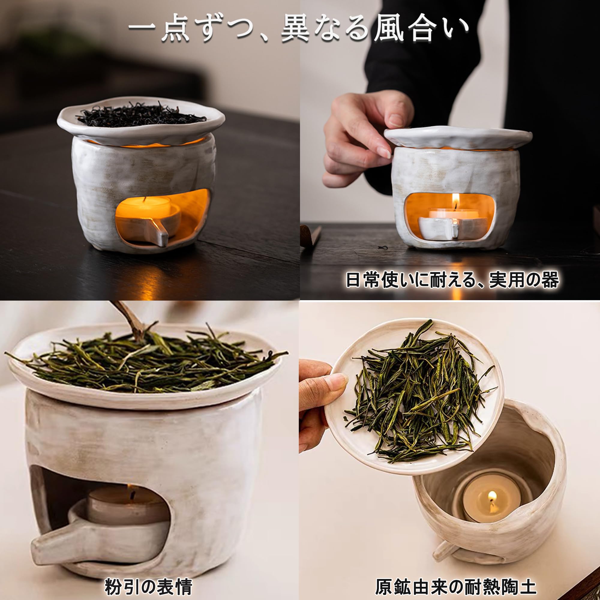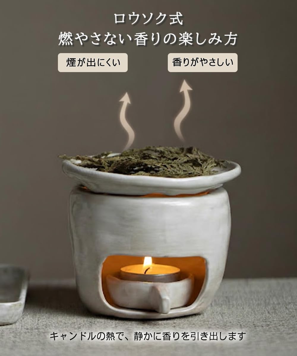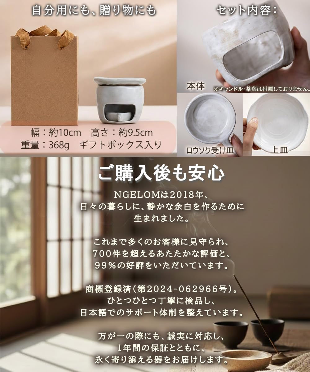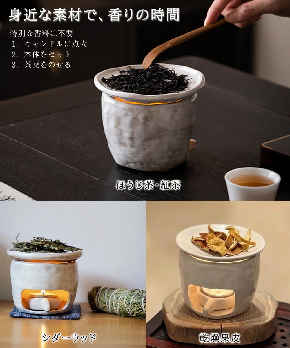 茶香炉 アロマポット 陶器 職人の粉引刷毛目仕上げ 原鉱耐熱土 乾焼き対応 キャンドル式 精油/茶葉/ハーブ対応 温香炉 煙が出にくい おしゃれ ギフト NGELOM (白・粉引き)