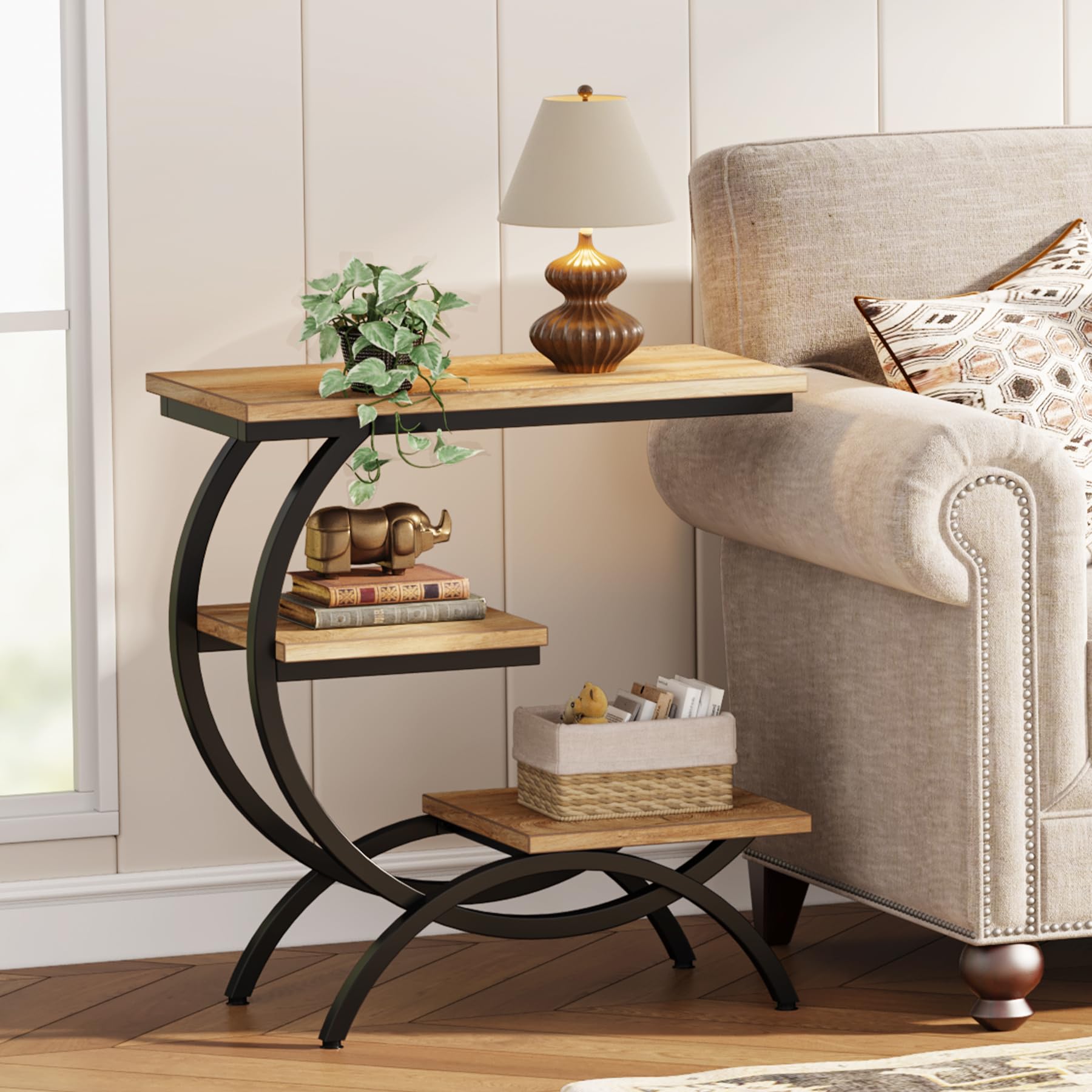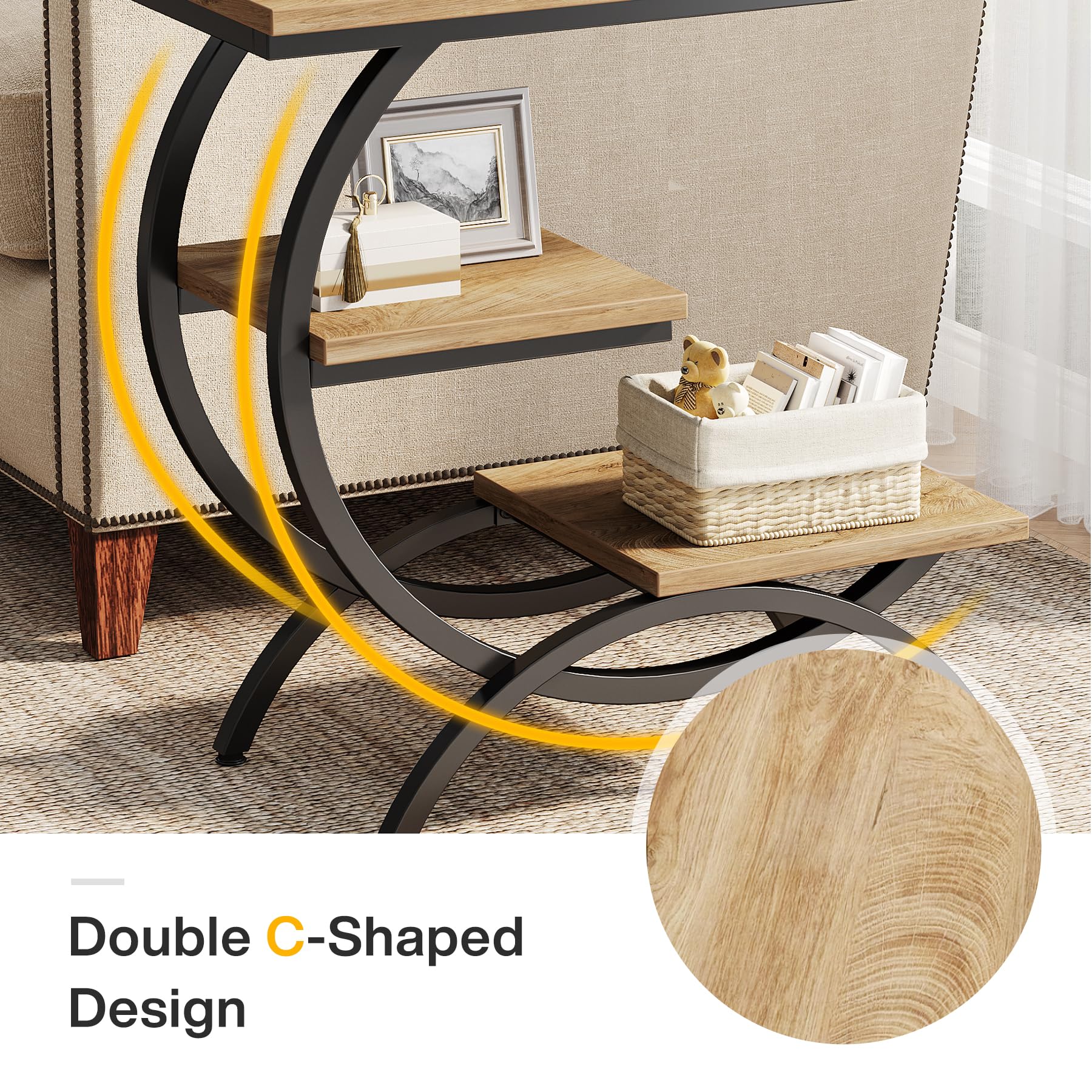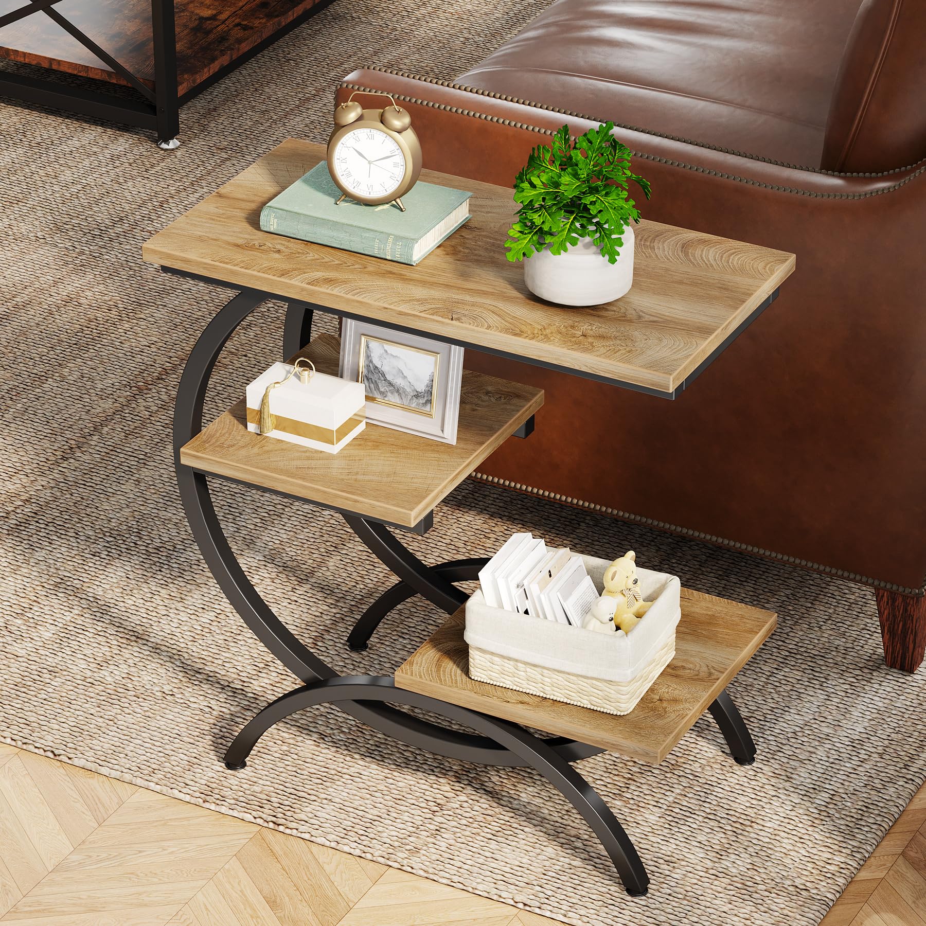 Tribesigns C型エンドテーブル 工業用 3段 小型サイドテーブル カウチ用 木製 ベッドサイドテーブル スナックサイドテーブル 収納棚付き リビングルーム 小スペース用 ライトブラウン