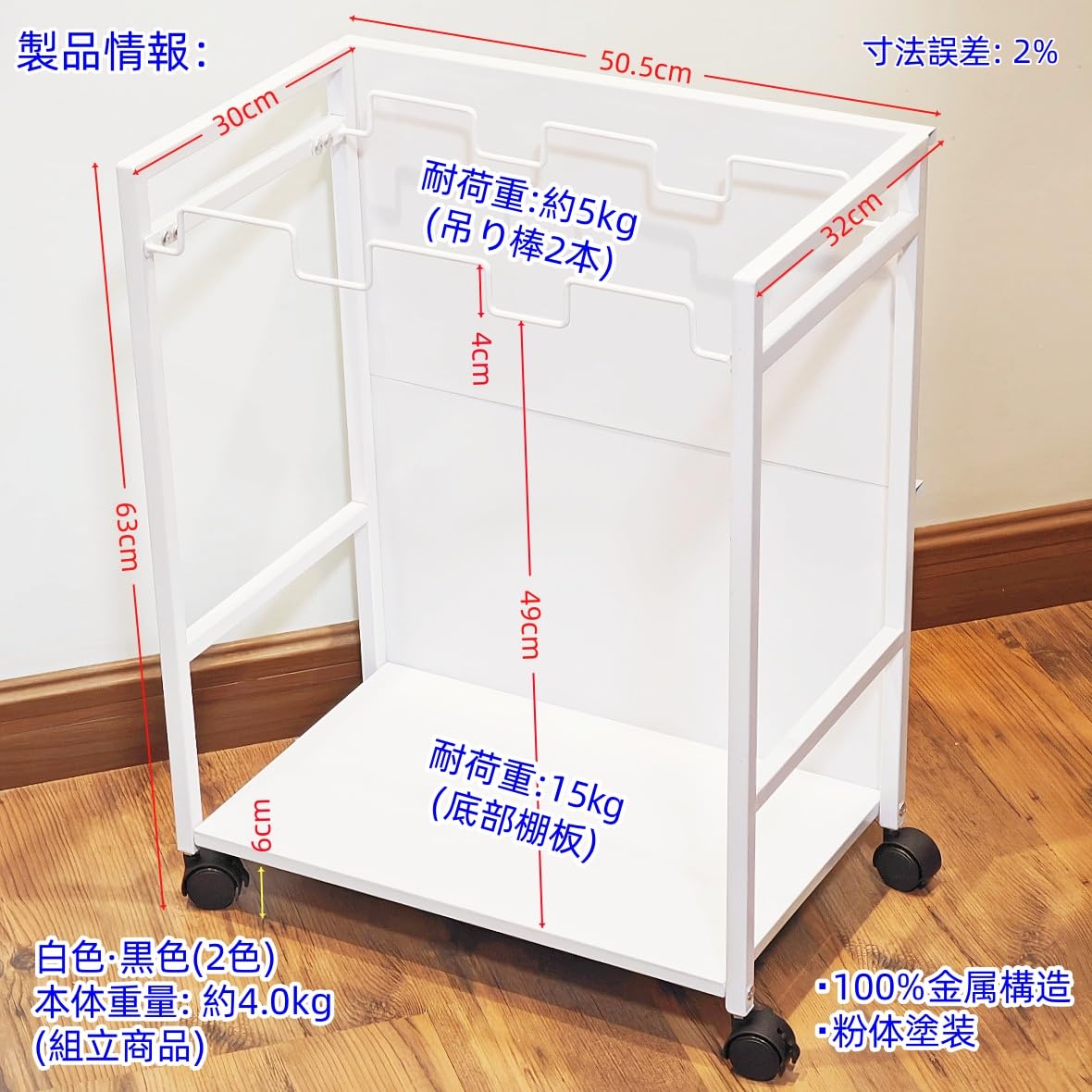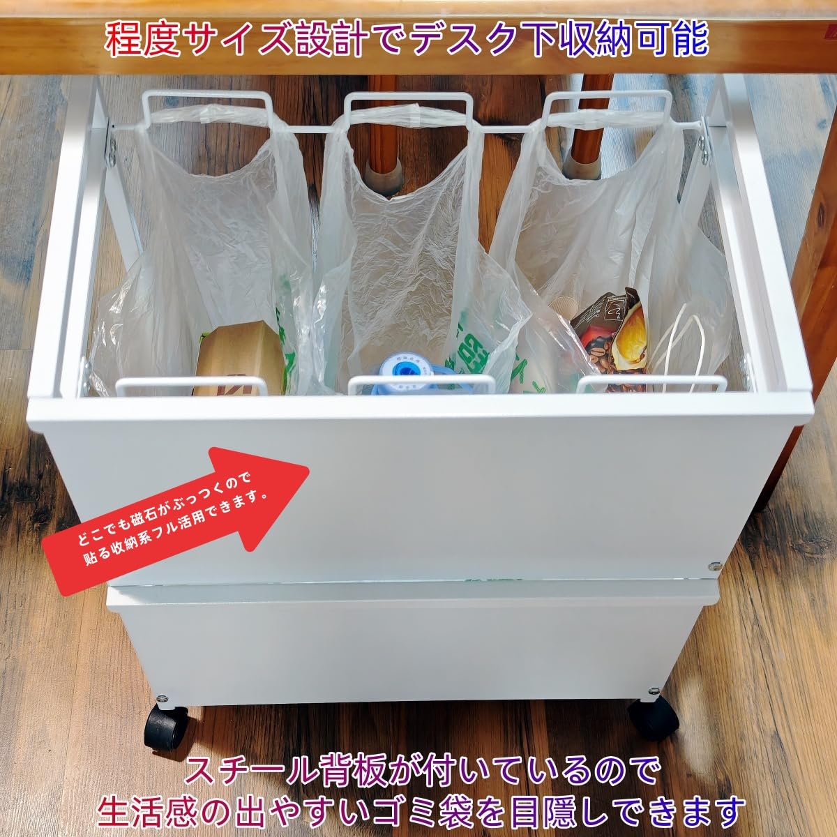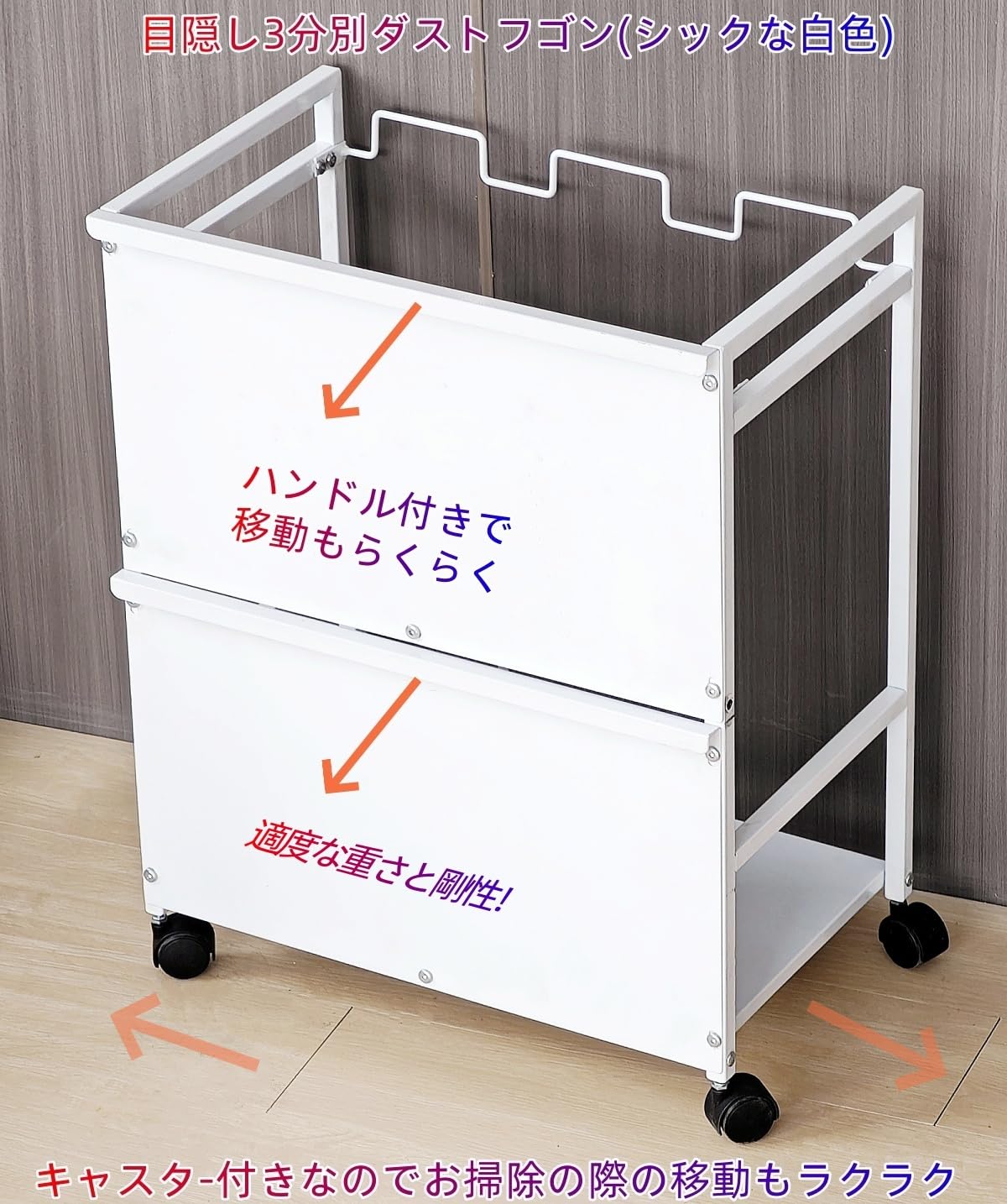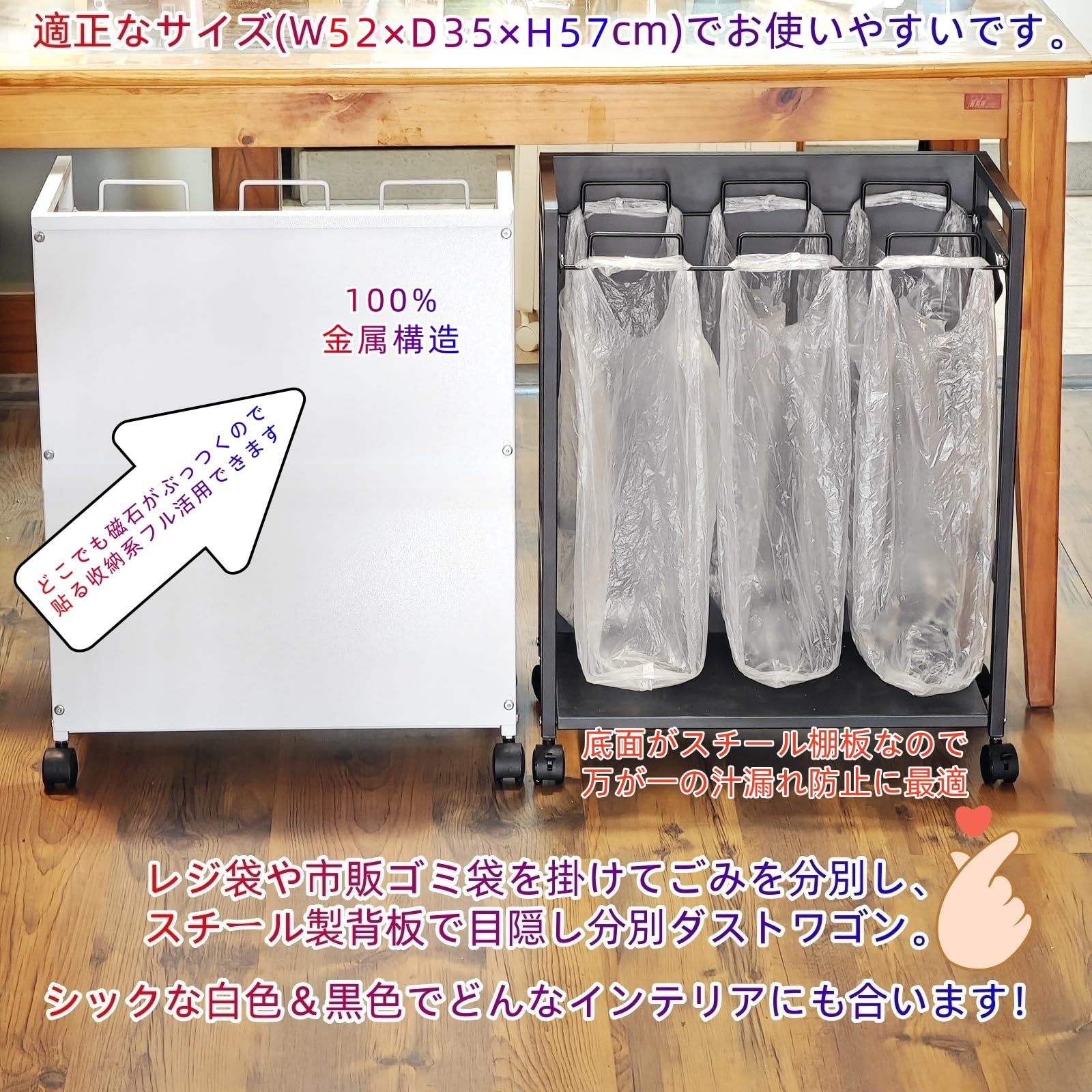 Secchuu 目隠し分別ダストワゴン 3分別 スチール製 ゴミ袋ホルダー W50.5XD32XH63cm ゴミ袋スタンド タワーゴミ箱 キャスター付き スタイリッシュ ダストボックス 手軽さ おしゃれ 掃除しやすさ 組立商品 フタなしゴミ箱 ペットボトル 缶と瓶 プラの分別 (白色)