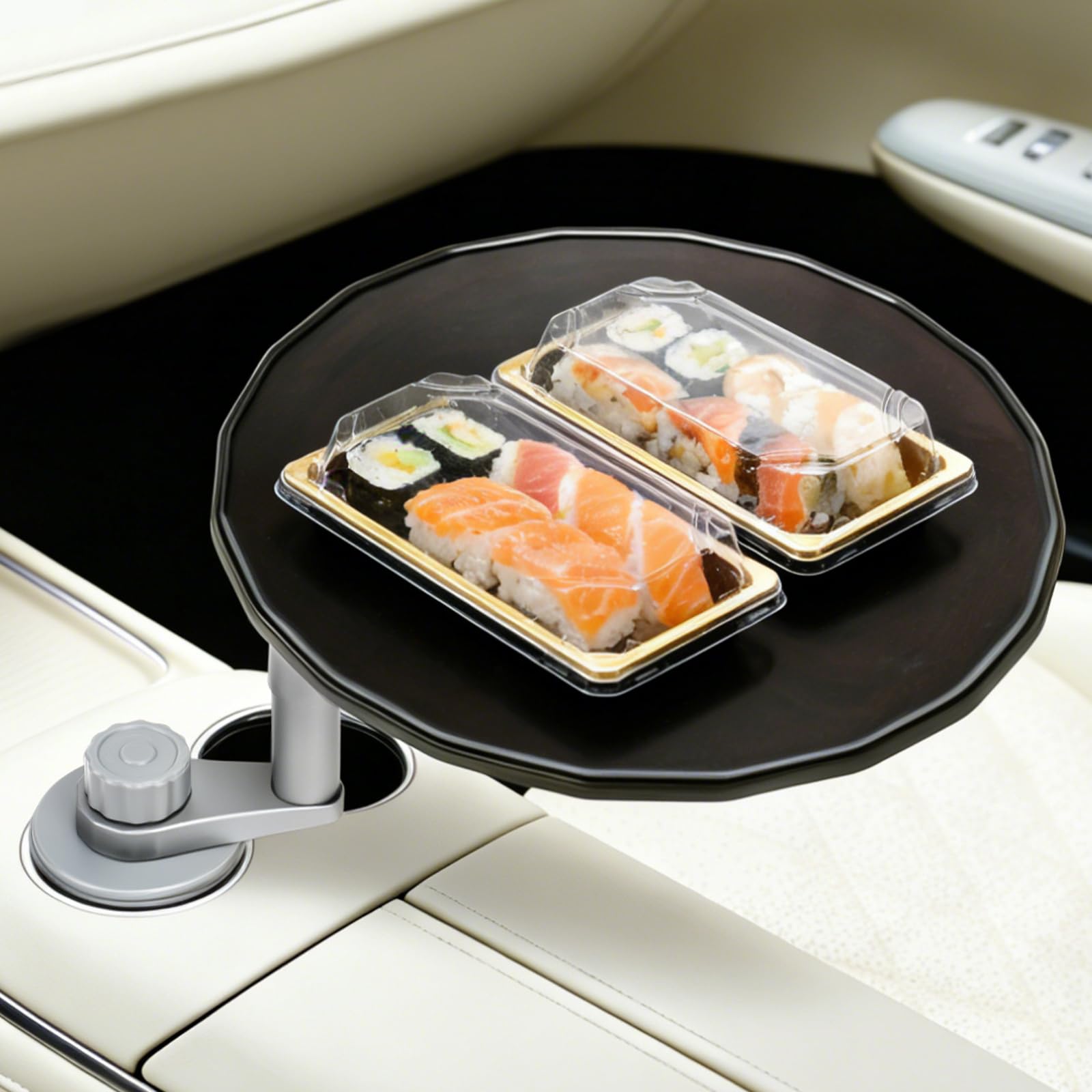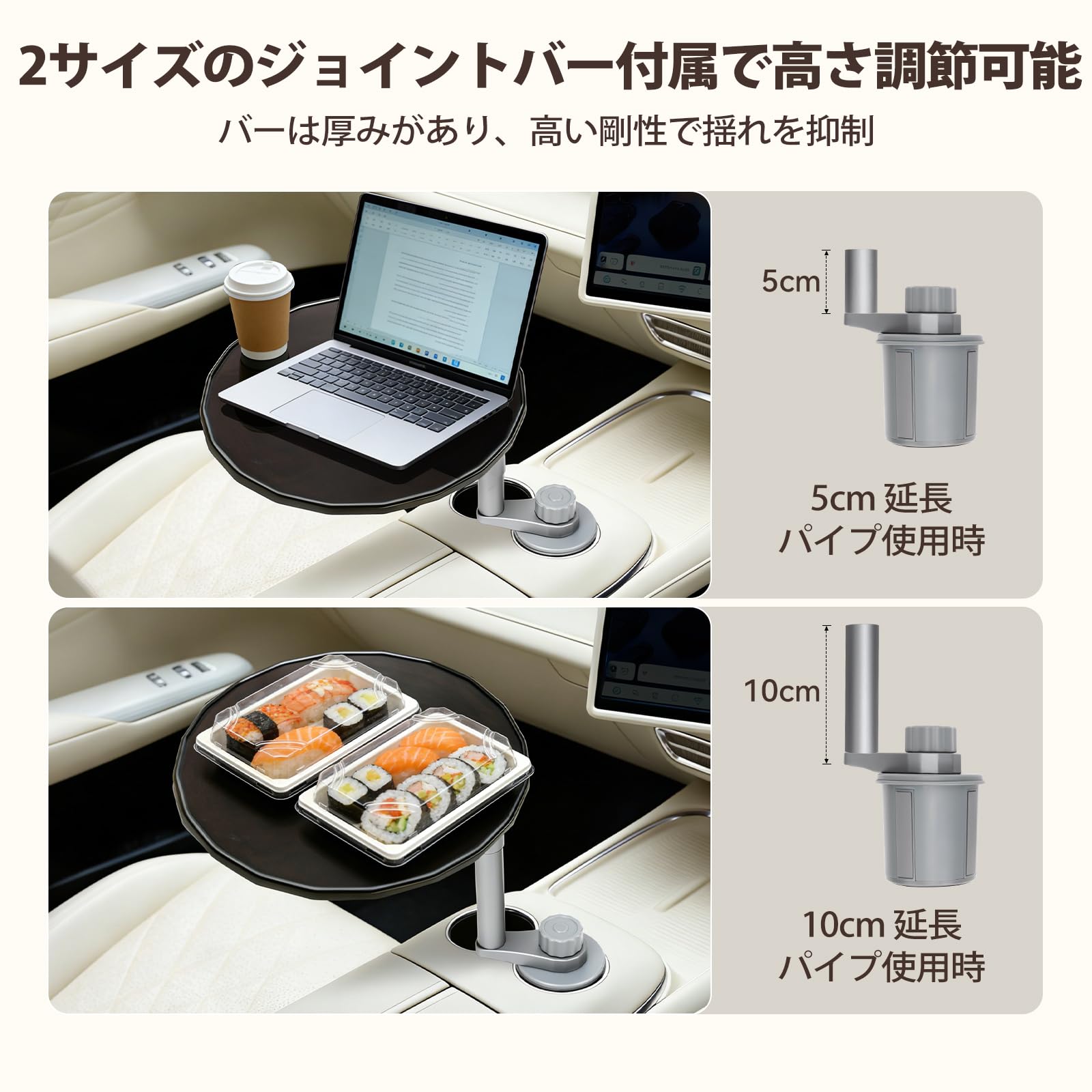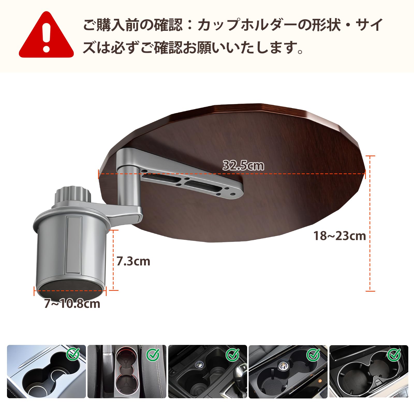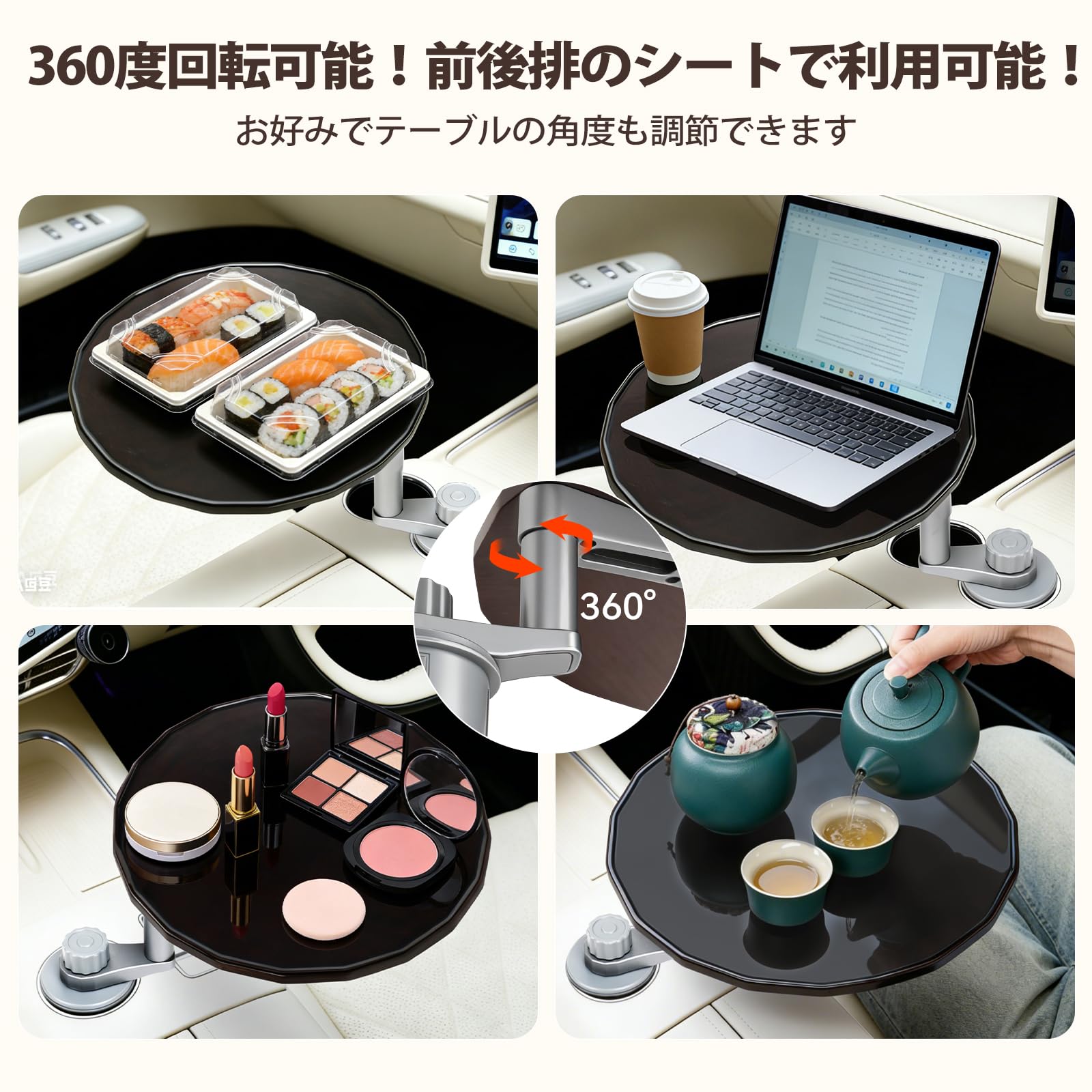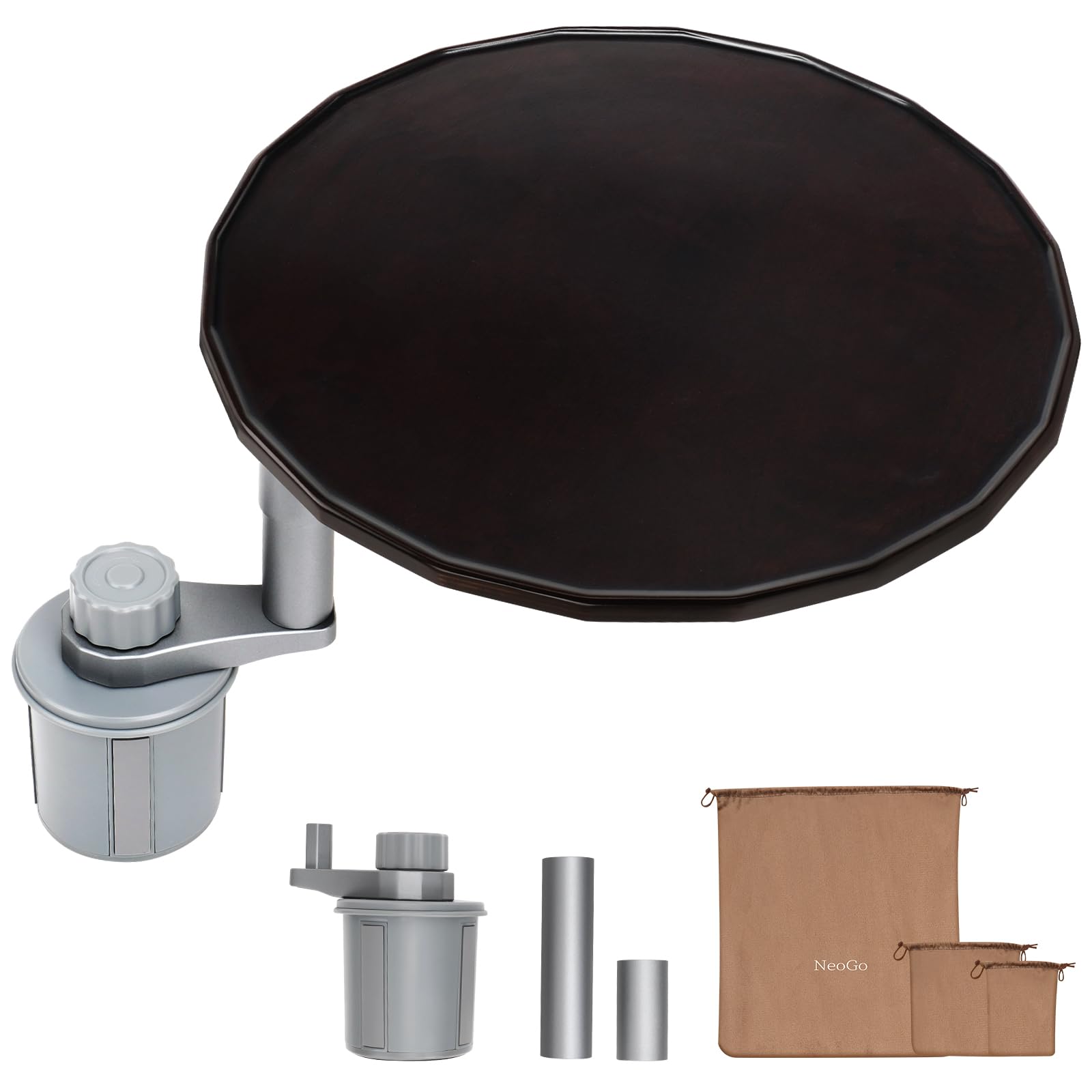 NEOGO 車載テーブル 360度回転 カップホルダー固定 天然木(バーチ材)×高強度アルミ製 耐荷重5kg 車内テレワーク 食事 休憩 2段階高さ調節 運転席 助手席 後部座席 汎用 収納袋付 (ウォールナット)