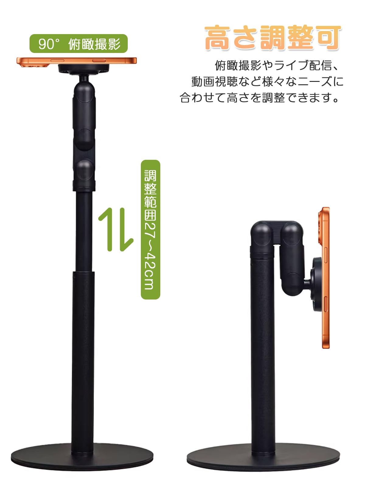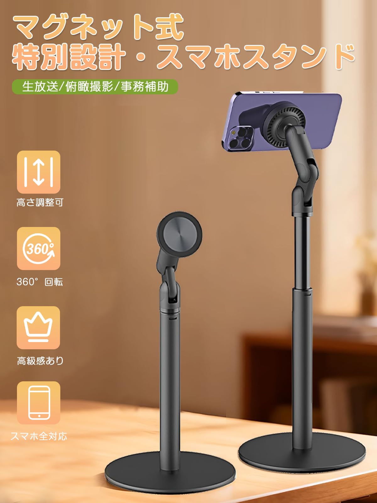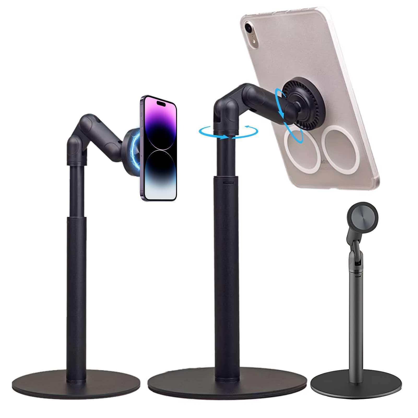 【2026 特別設計】 スマホスタンド マグネット MagSafe対応 360度回転 おしゃれ マグネット式 安定性 卓上スタンド 高さ調整 携帯 ホルダー 角度調整 (27cm-42cm) 伸縮性 折りたたみ スマホ撮影 生放送 マグセーフ対応 強力 アームスタンド