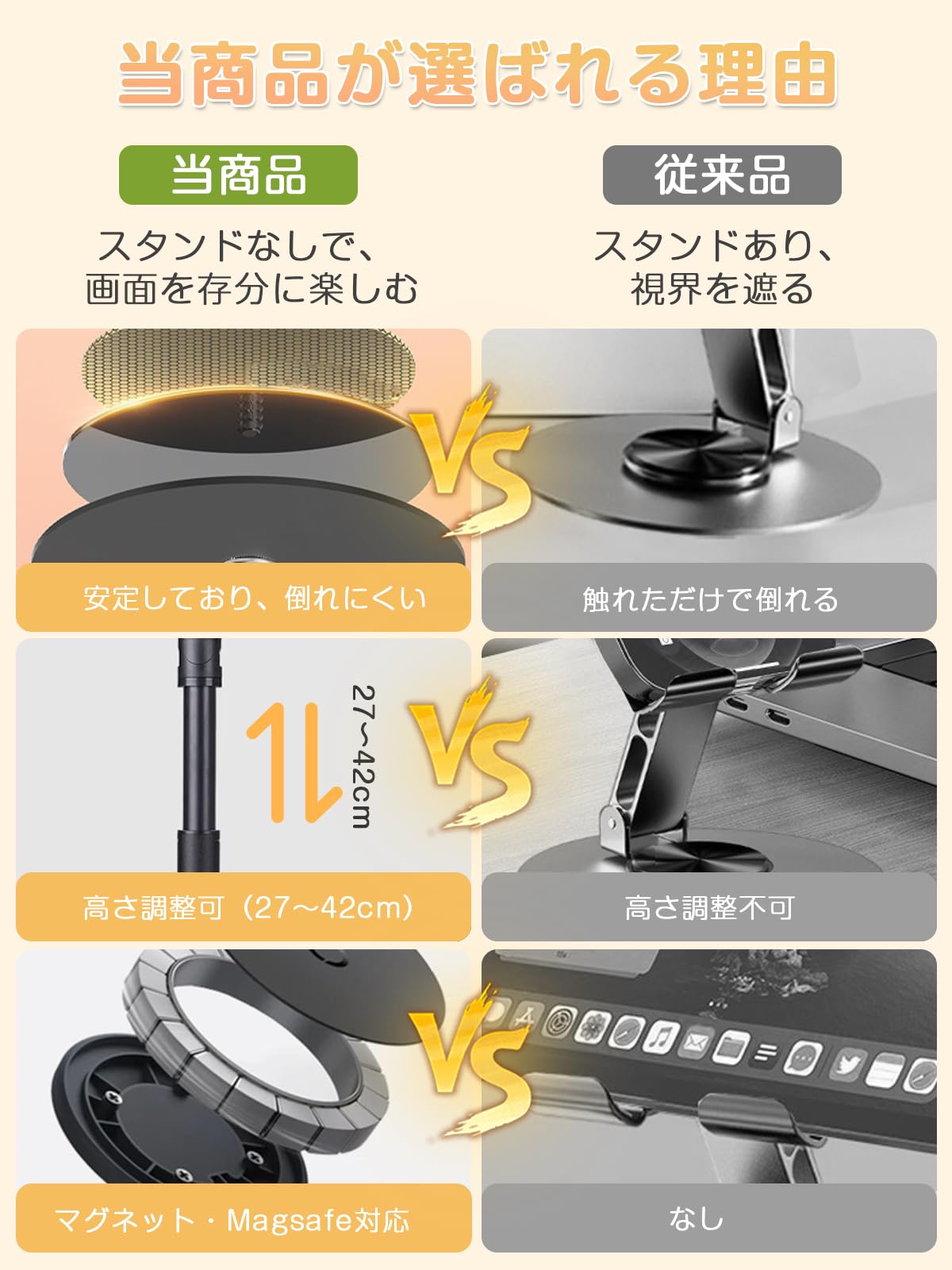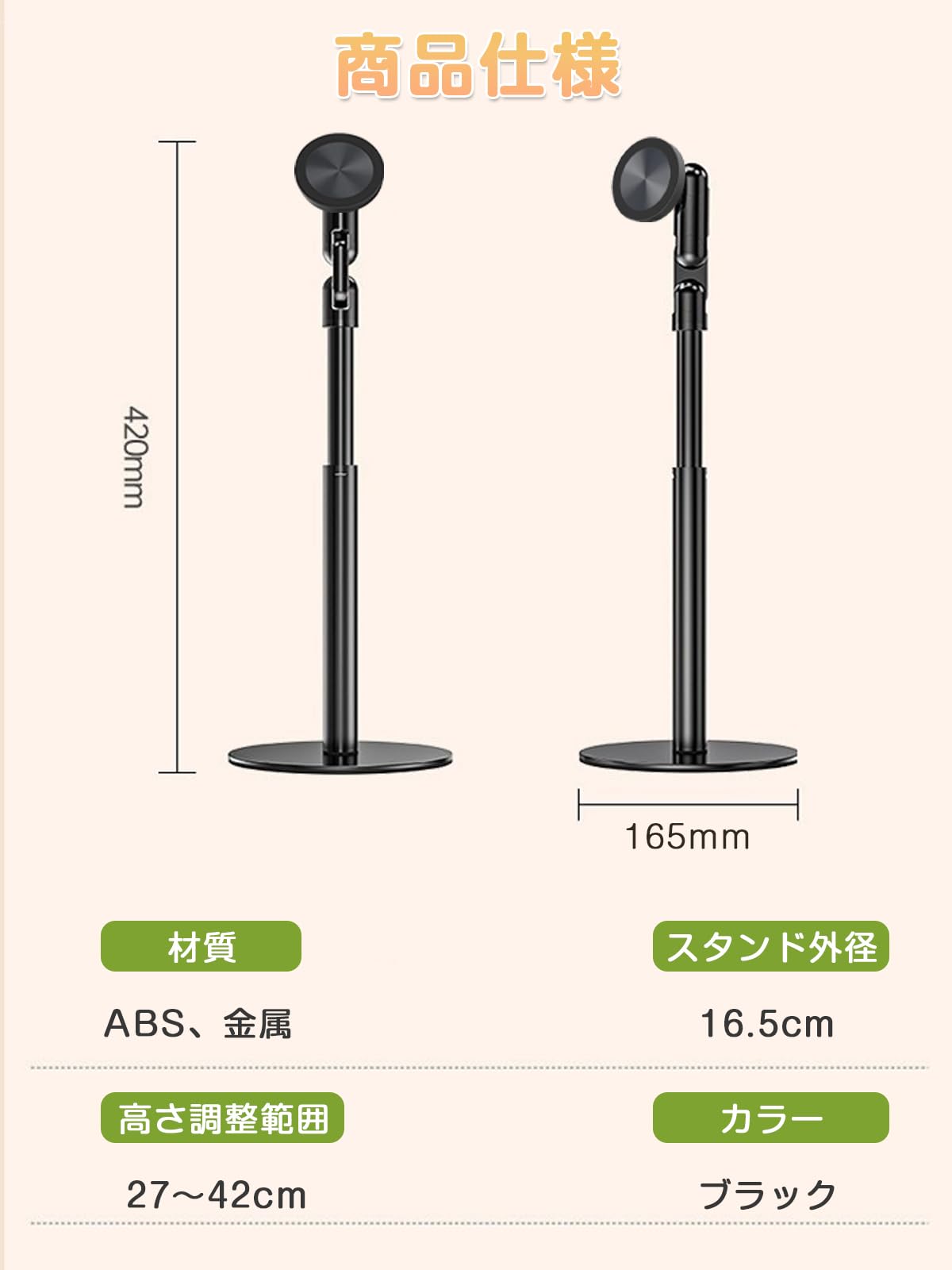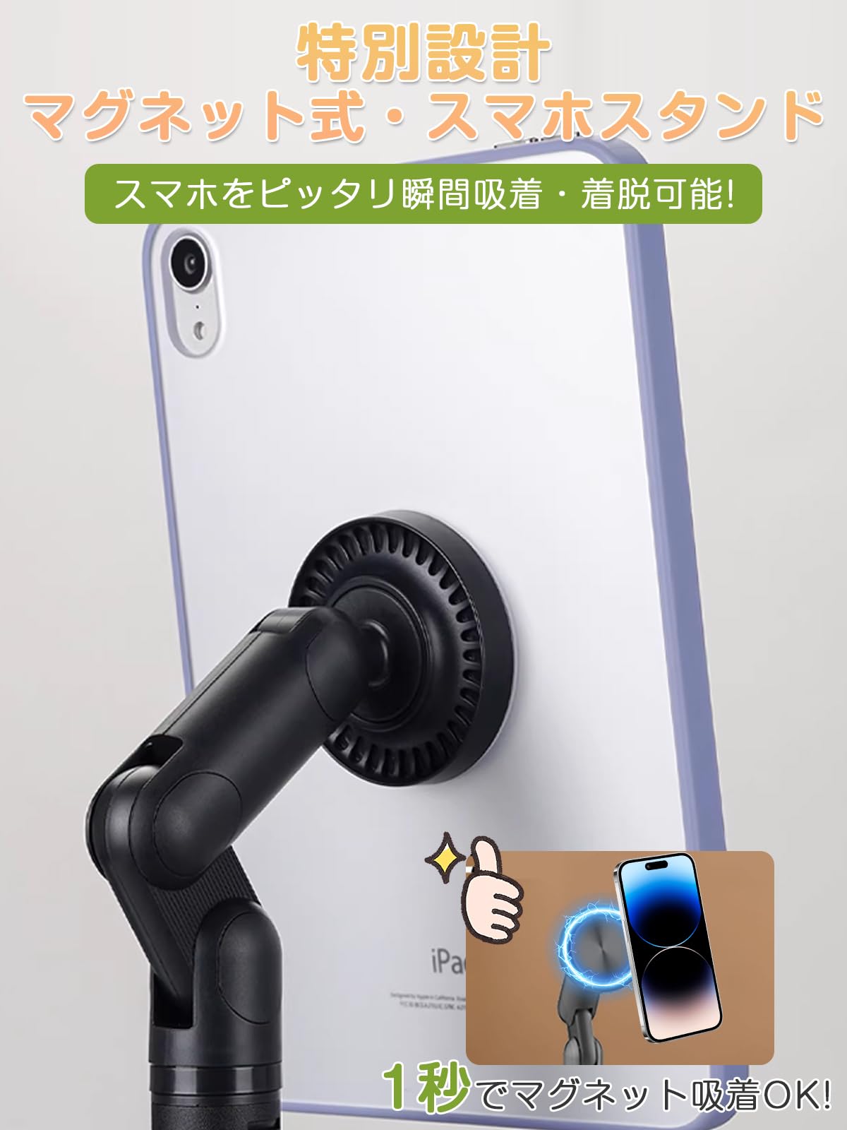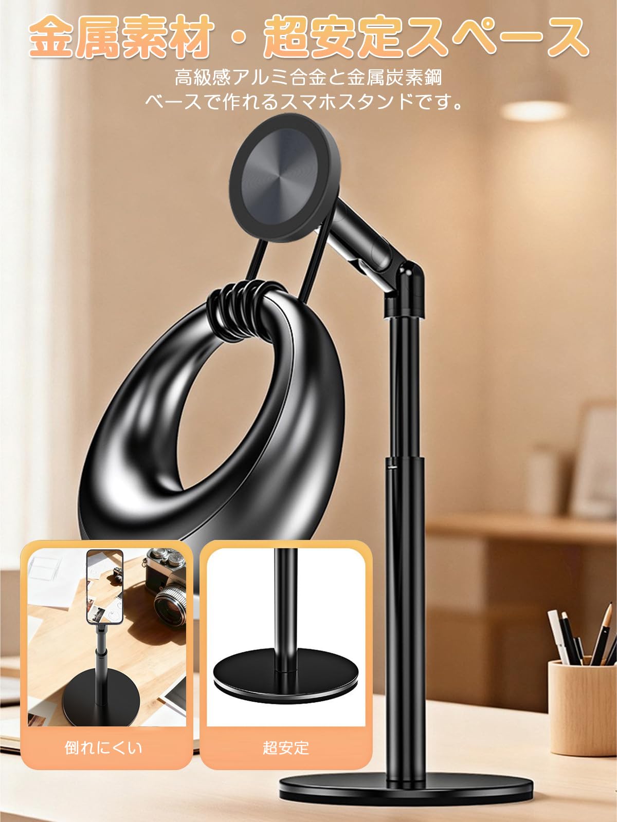 【2026 特別設計】 スマホスタンド マグネット MagSafe対応 360度回転 おしゃれ マグネット式 安定性 卓上スタンド 高さ調整 携帯 ホルダー 角度調整 (27cm-42cm) 伸縮性 折りたたみ スマホ撮影 生放送 マグセーフ対応 強力 アームスタンド