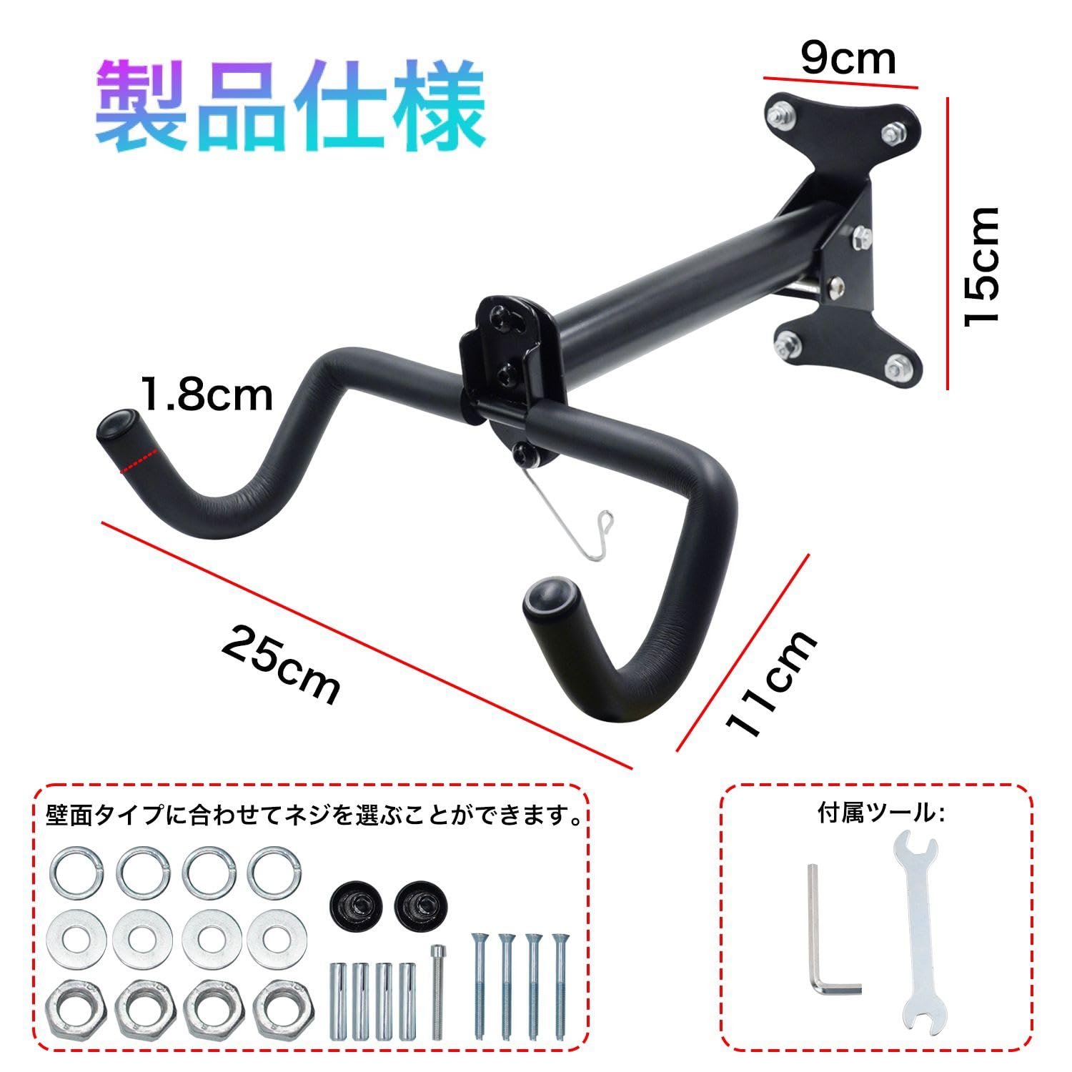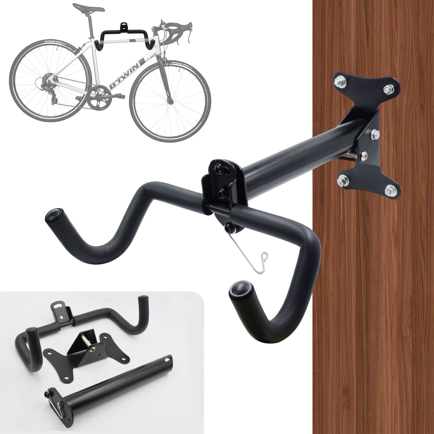 BULLSPANN 壁掛け自転車ラック、長さ調節可能な自転車屋内収納ラック、ストラップとレンチ付き、サイクリング壁掛けホルダーフック1セット、ガレージ用、ブラック