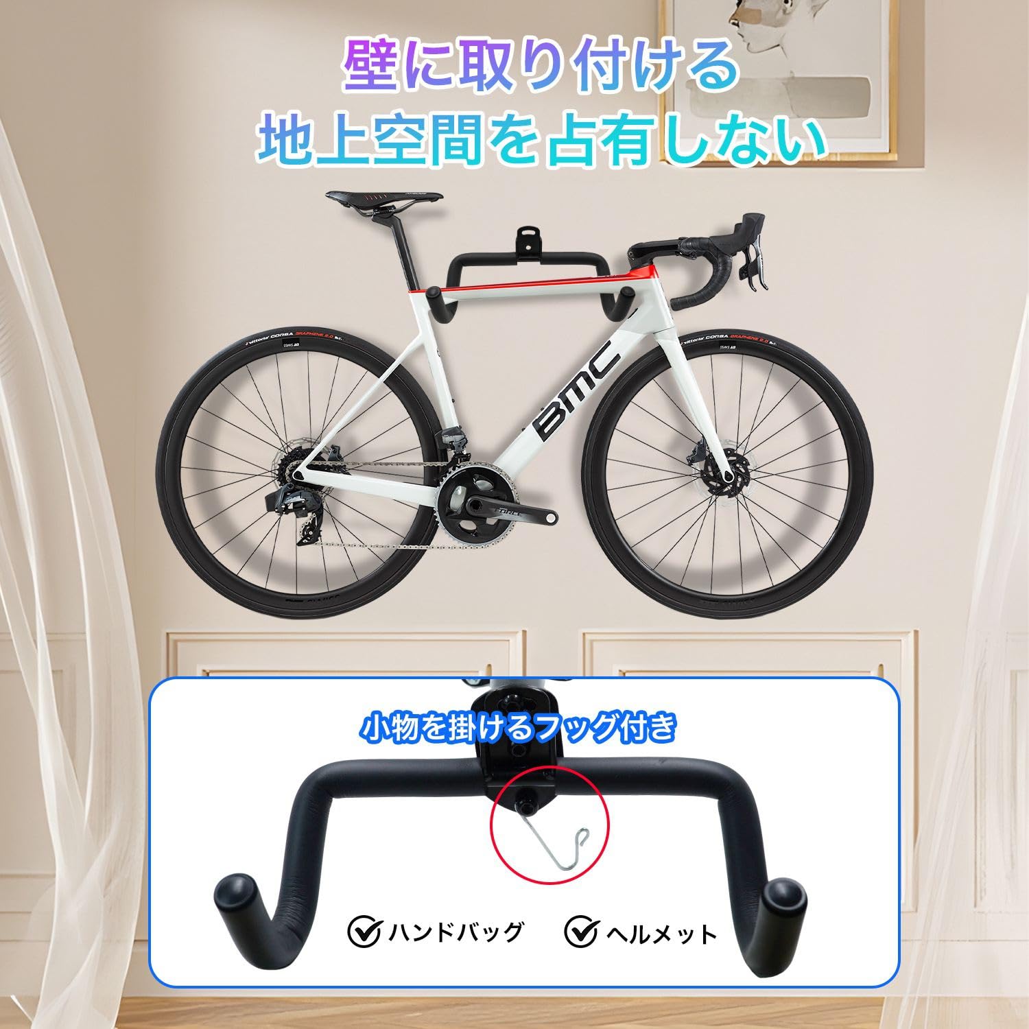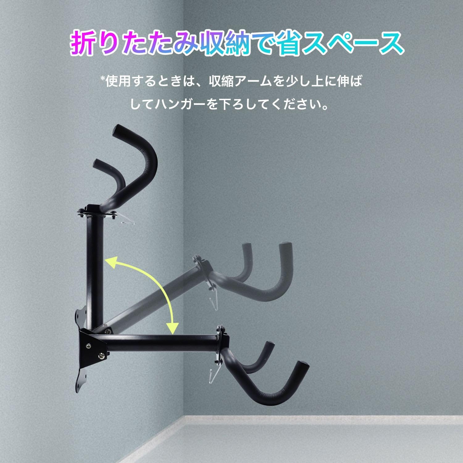 KKLM 壁掛け式自転車フック バイクハンガー 自転車ディスプレイスタンド 耐荷重30kg 自転車用スタンド 壁に取り付け可能なヘルメットフック付き 角度調節機能 折りたたみ式で収納に便利 傷防止設計 長さ調整が可能でマウンテンバイクやロードバイクに適応 転倒を防ぐ安全設計 省スペースかつ頑丈