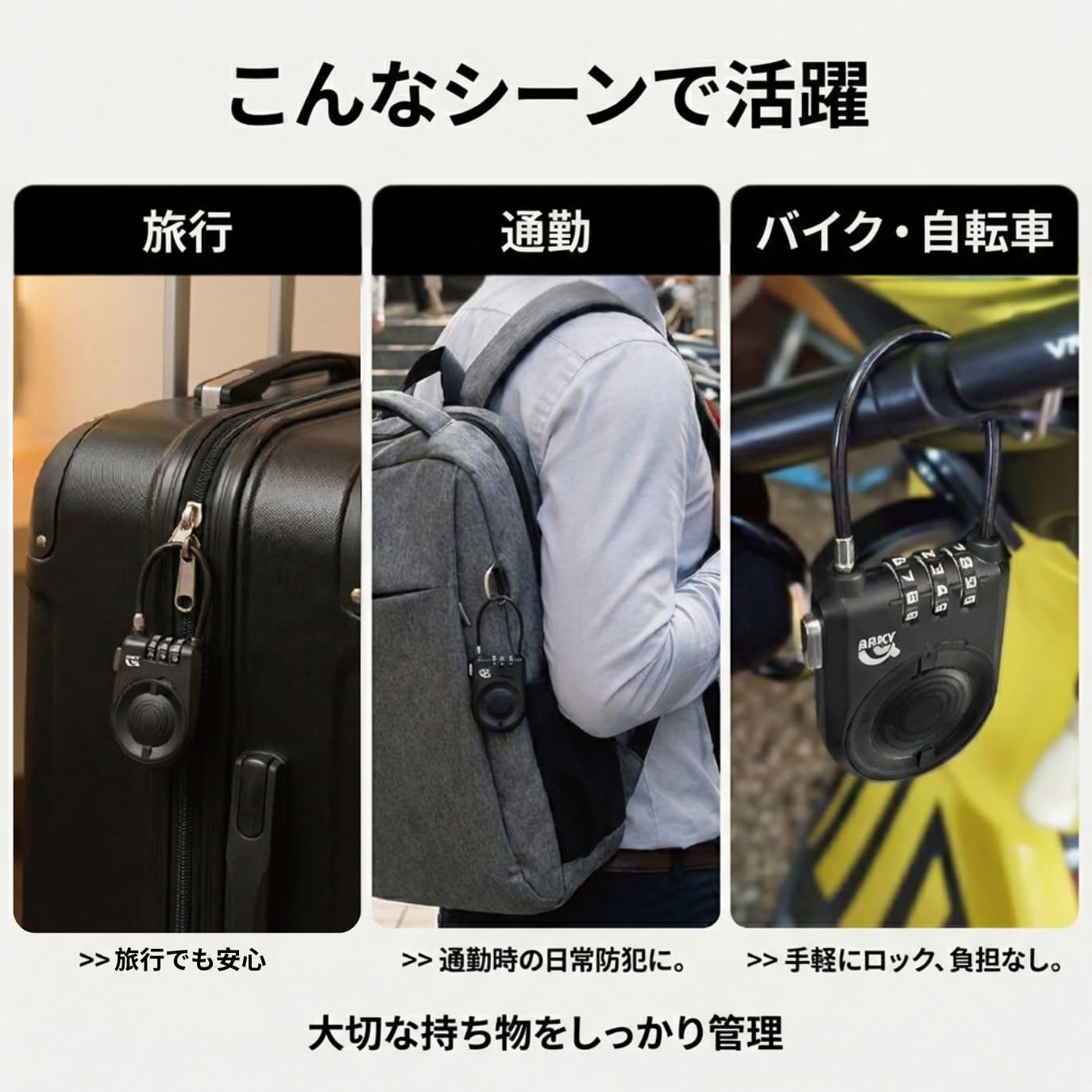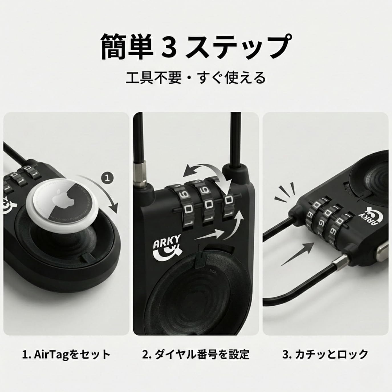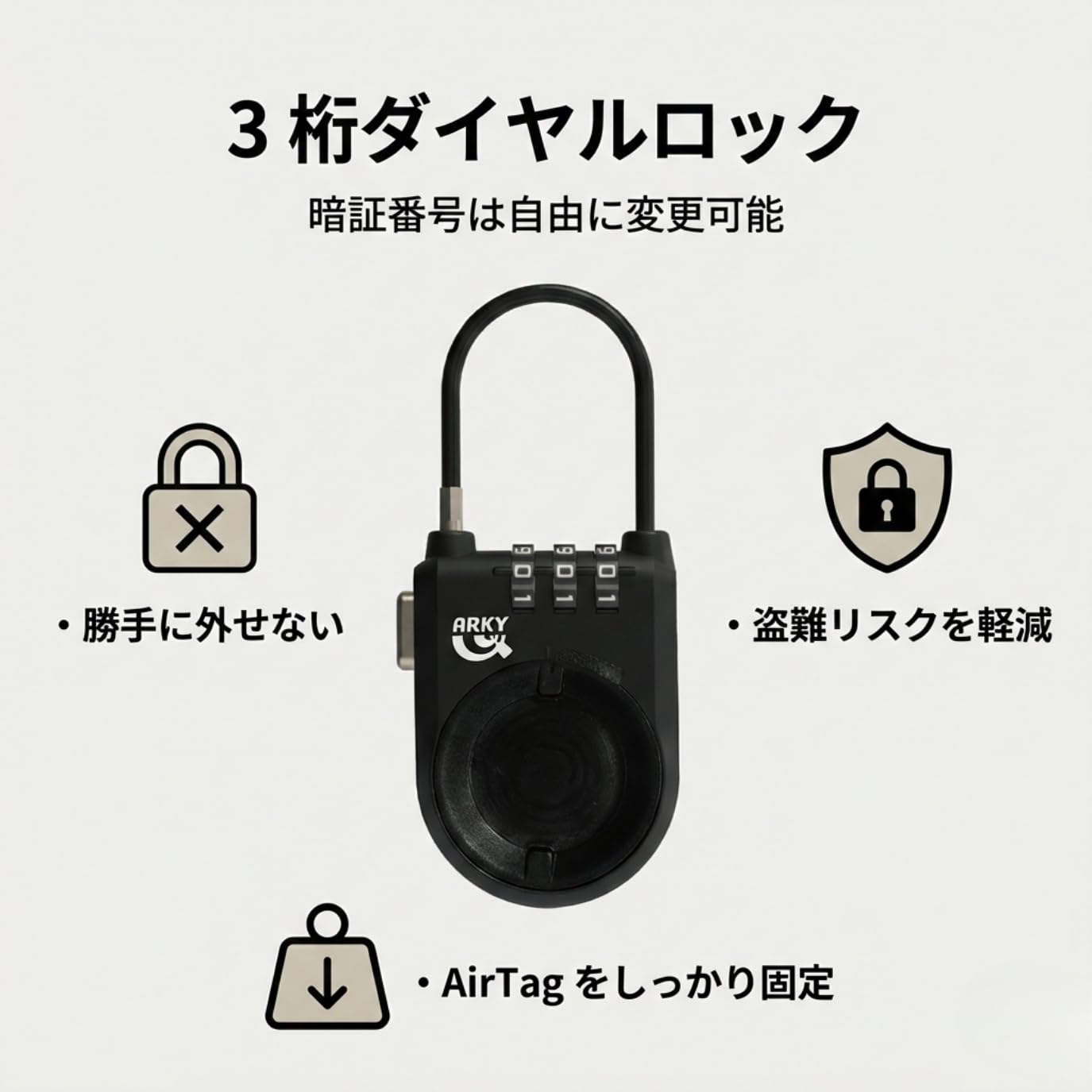 ARKY Good Lock Air – AirTag専用 ダイヤル式 セキュアロック エアタグ用 ワイヤーケーブル付き コンビネーションロック 紛失防止 盗難防止 アクセサリー