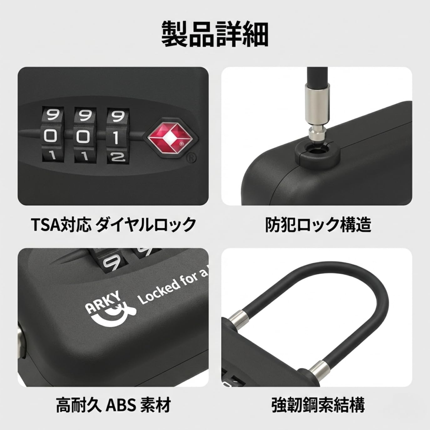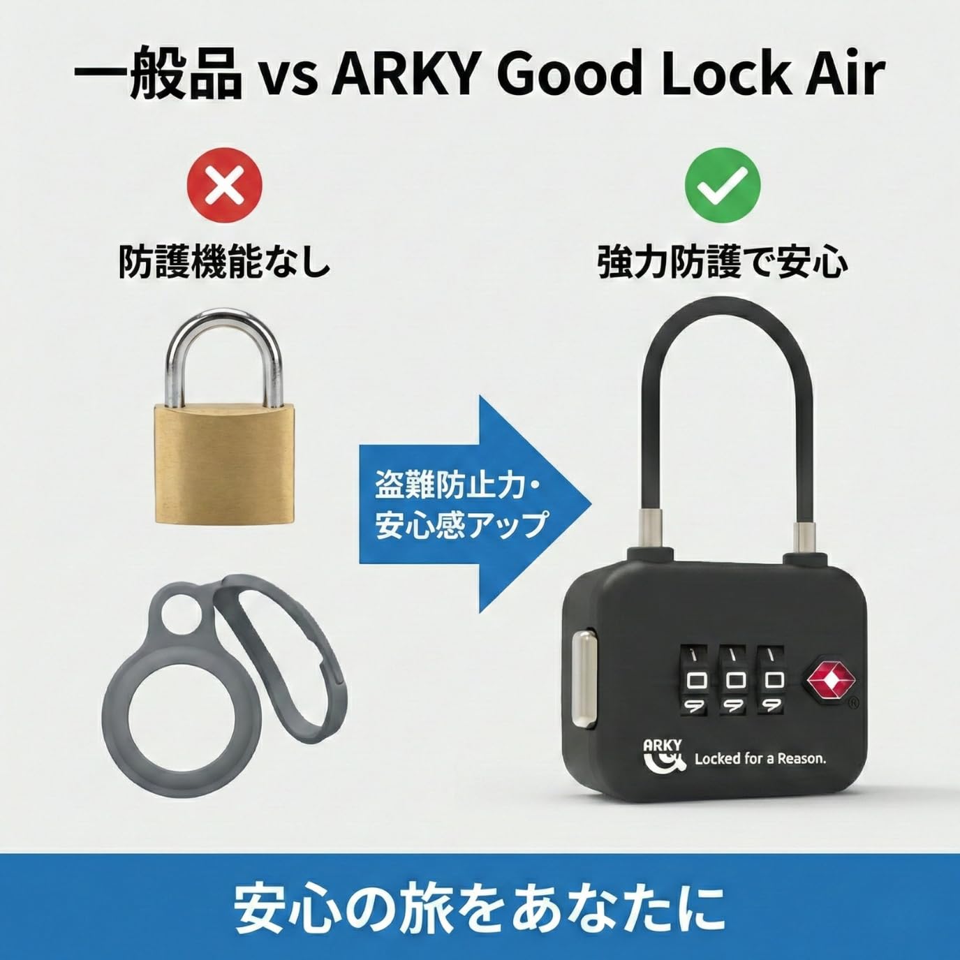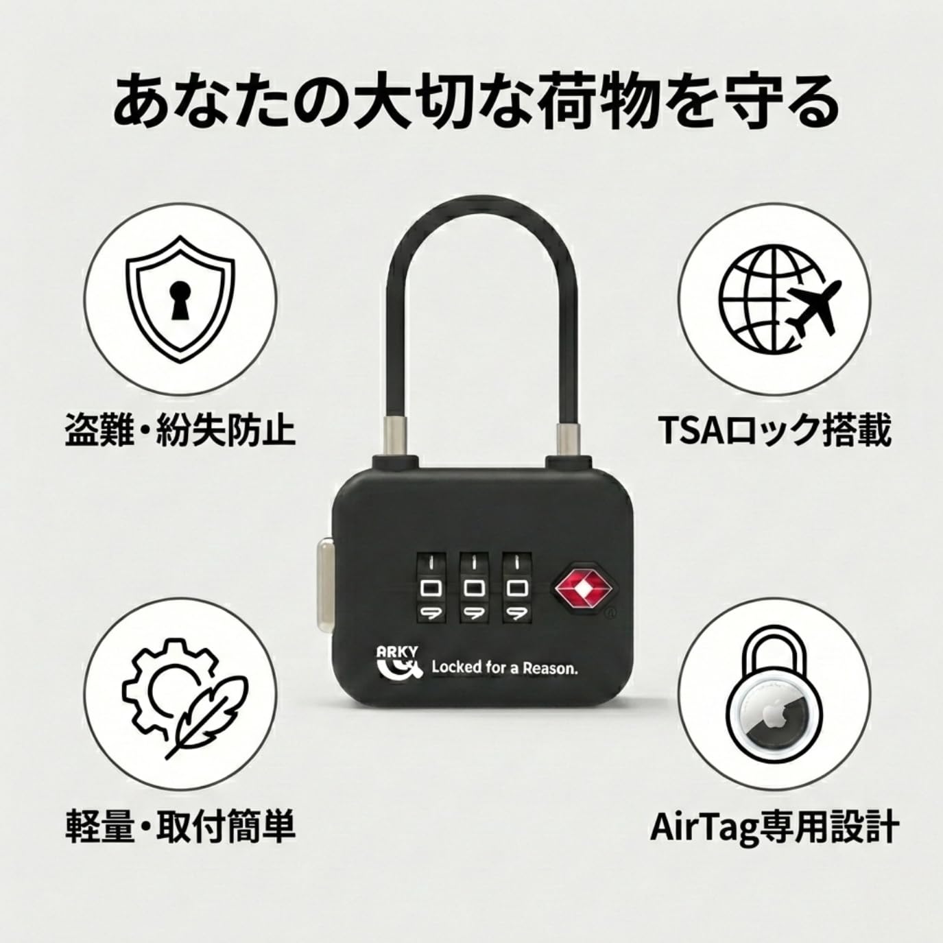 **ARKY Good Lock Air TSA – AirTag 専用 海関防護ロック** は、AirTag を持ち運びする際の盗難・紛失リスクを大幅に軽減するために設計された専用アクセサリーです。 TSA(米国運輸保安庁)や各国の空港セキュリティチェックにも対応し、AirTag を安全にスーツケースやバッグに固定できます。 **■ 海外旅行でも安心の防護設計** AirTag をセットしてから **3 桁のダイヤルロック** で固定するだけで、不正な取り外しや盗難行為を予防。空港検査でも対応可能な設計です。 **■ 軽量で頑丈、日常からトラベルまで活躍** ABS 素材採用で耐久性と携帯性を両立。カバン・スーツケース・アウトドアギア・バイク・自転車など、あらゆるシーンにマッチします。 **■ 簡単操作で初心者でも安心** 工具不要で AirTag を装着。ダイヤル番号は自由に変更でき、家族や旅行メンバーと共有する際も便利です。 **※ AirTag 本体は付属しません。** **対応機種:Apple AirTag1、2**