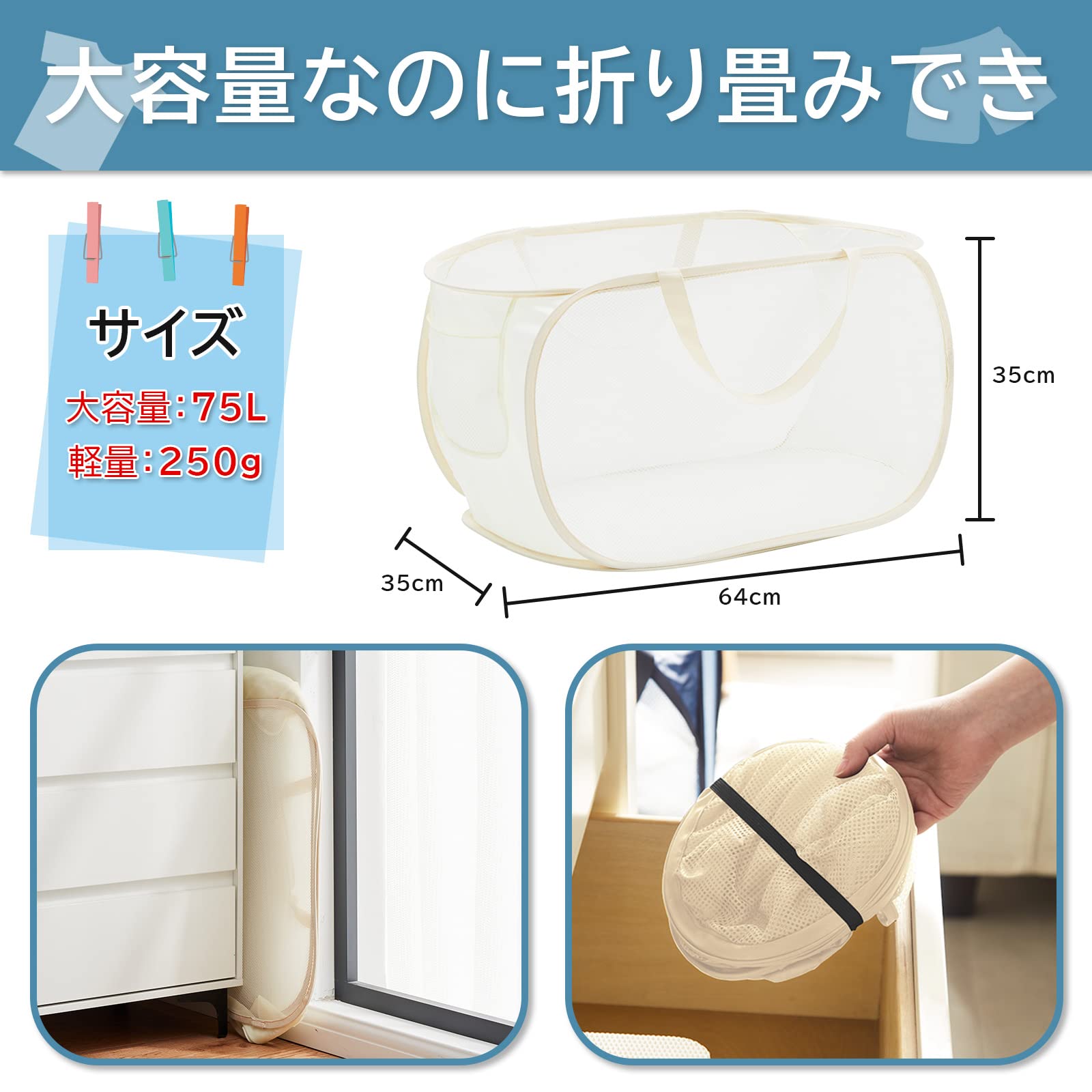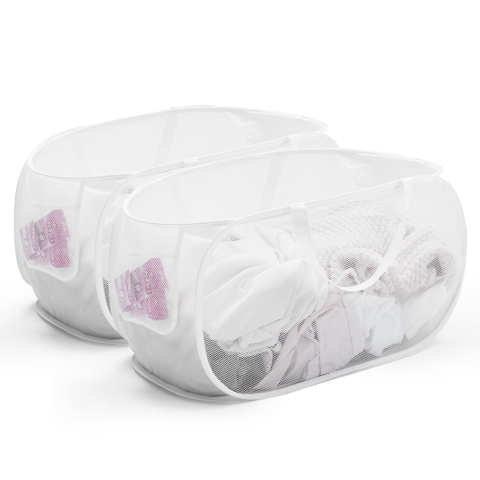 TECHMILLY ランドリーバスケット 横型 洗濯カゴ 折りたたみ 大容量 メッシュ 収納 洗濯物 袋 かご 持ち運び可能 軽量 旅行 ゴミ箱 長さ64CM幅さ35CM高さ35CM (ホワイト、2PCS)