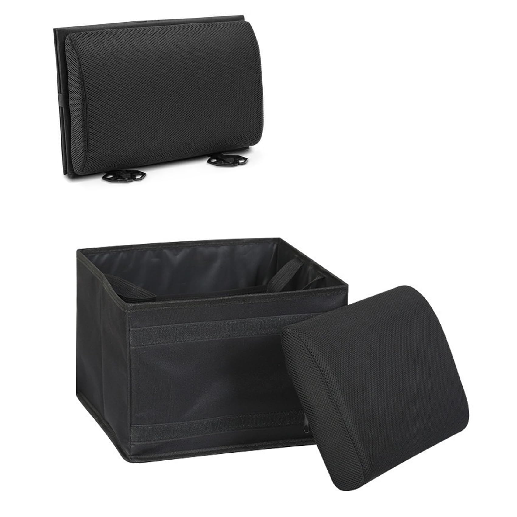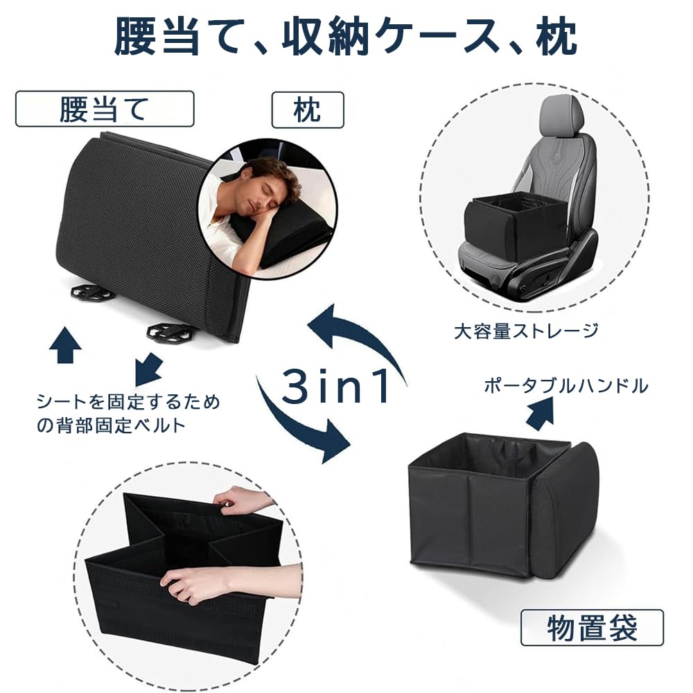 YFFSFDC シートボックス 腰クッション 30L大容量 2WAY |車内収納ボックス+運転席/助手席用低反発背当てクッション|シエンタ・ハイエース・n-box対応|折りたたみ式・洗えるカバー付き(ブラック)