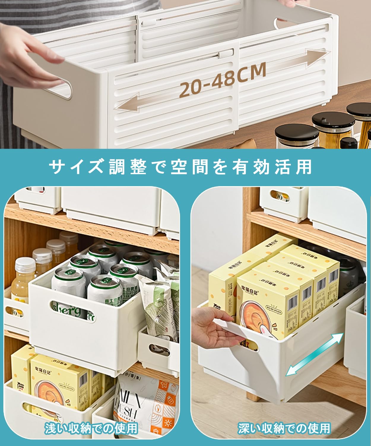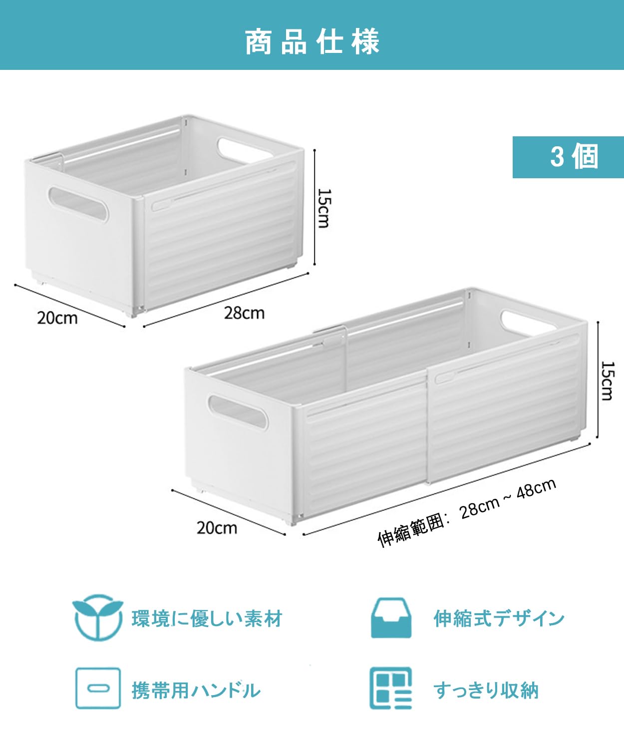 TerraShine 伸縮収納ケース 3個セット 収納ボックス 引き出し 多目的収納ケース 伸縮式 調整可能 仕切り 省スペース クローゼット/冷蔵庫/押し入れ用(白-L)