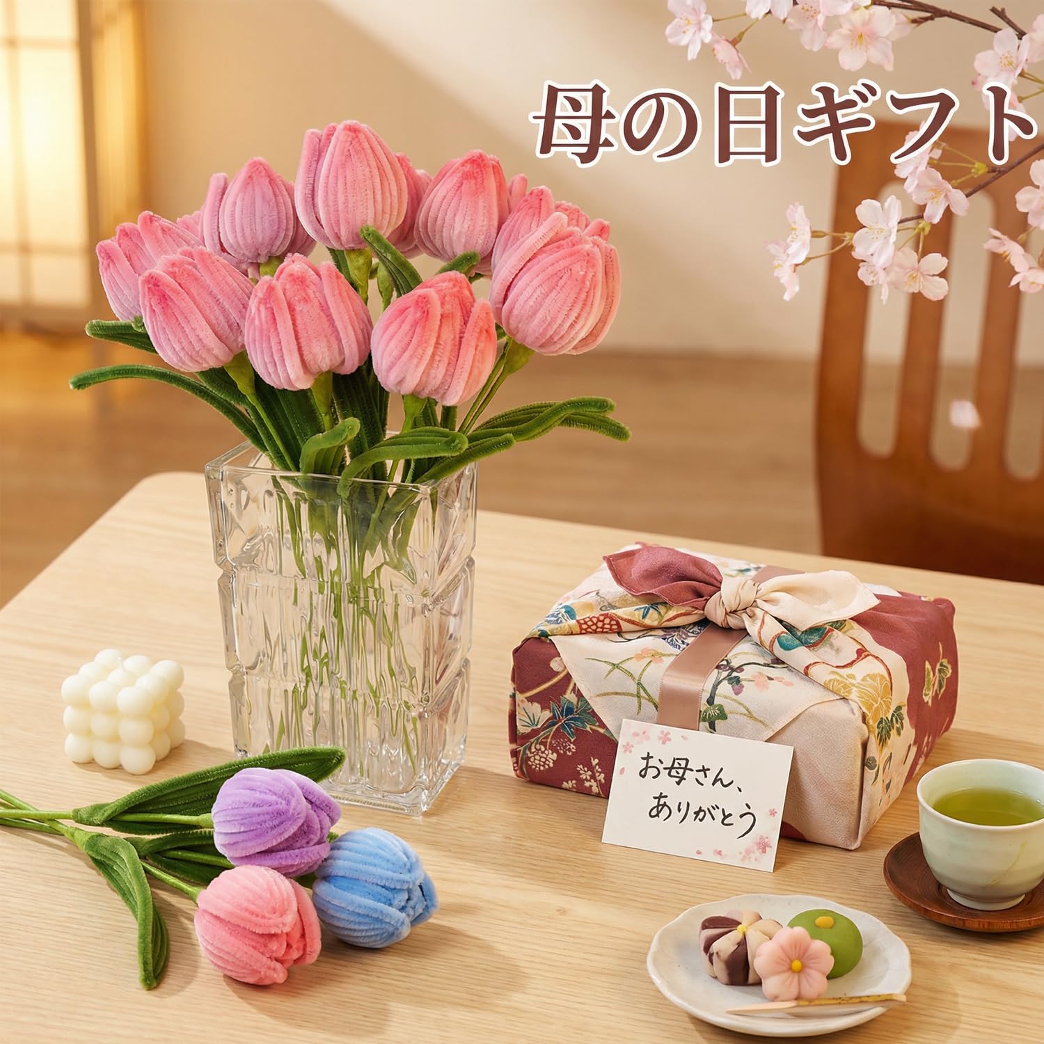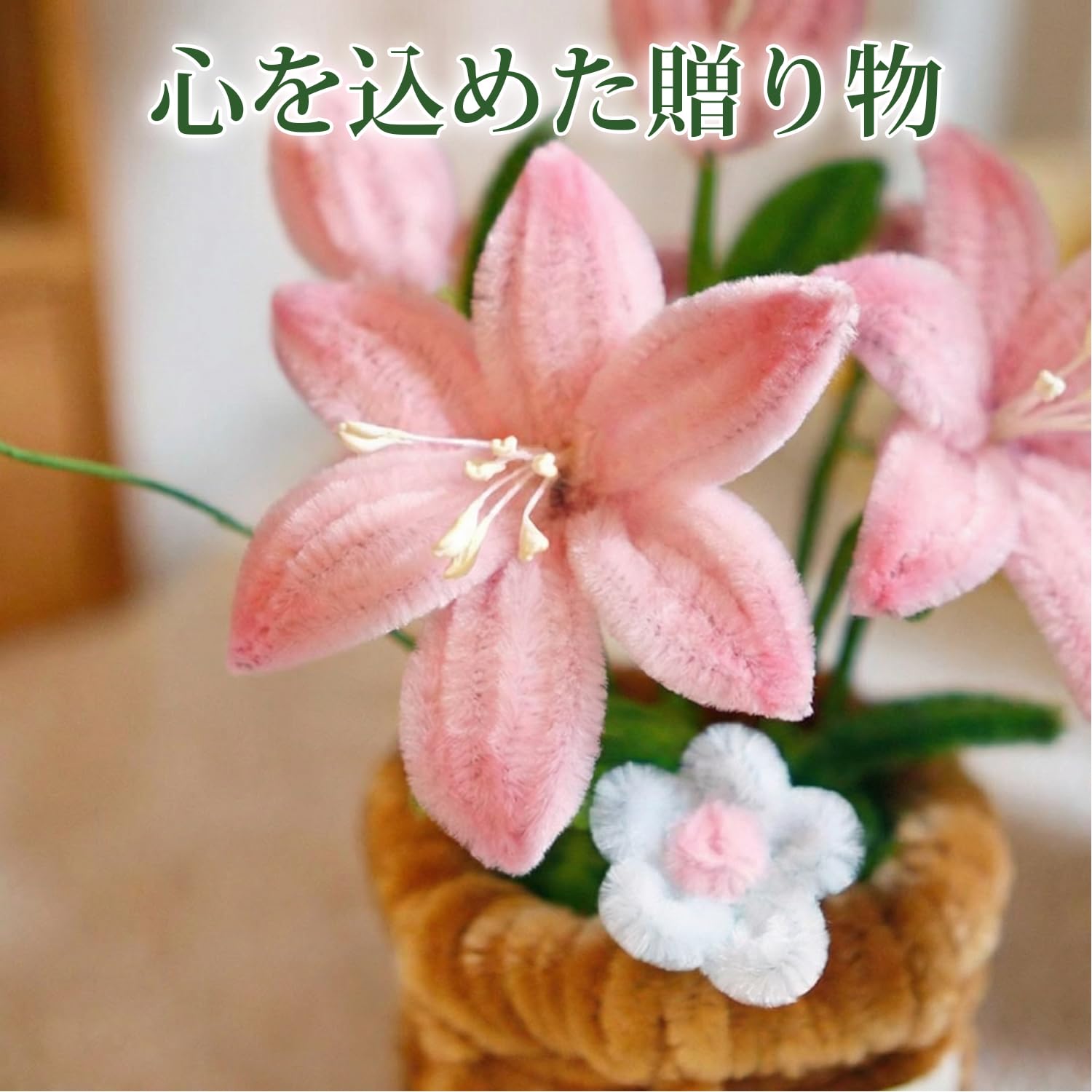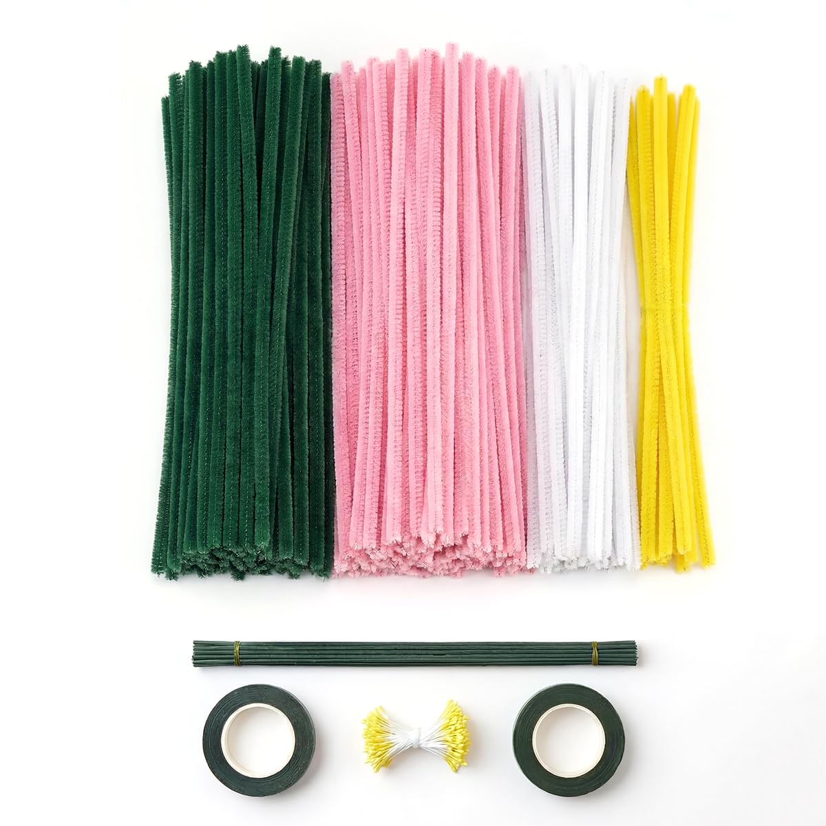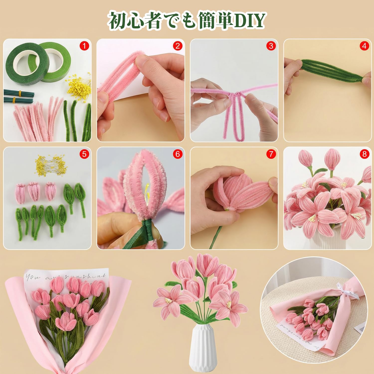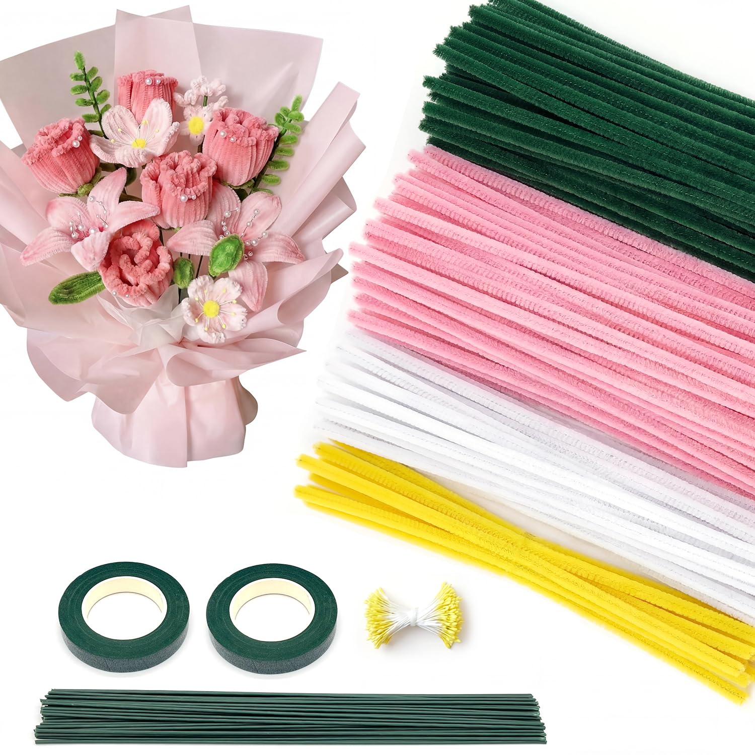 RRUIZE・モールフラワー 手作りキット ピンク 造花DIY|手芸モール120本 ふわふわ高密度|地巻ワイヤー・双頭花おしべ・フローラテープ2巻|枯れない花束 ブーケ 卒業式/入学式/母の日 ギフト (ピンク)