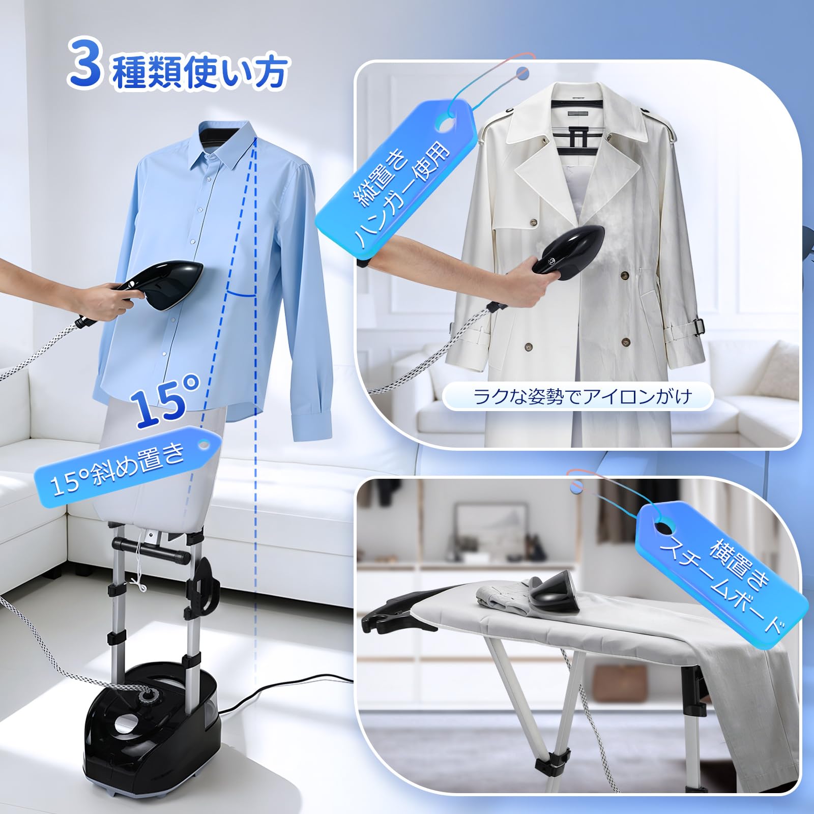 Hapyvergo 衣類スチーマー ハンガースチーマー スチームアイロン 1500W作動 ハンガーにかけたまま 3L大容量タンク 2段階スチーム コード付き 置型 腕が楽 省スペース プロ仕様