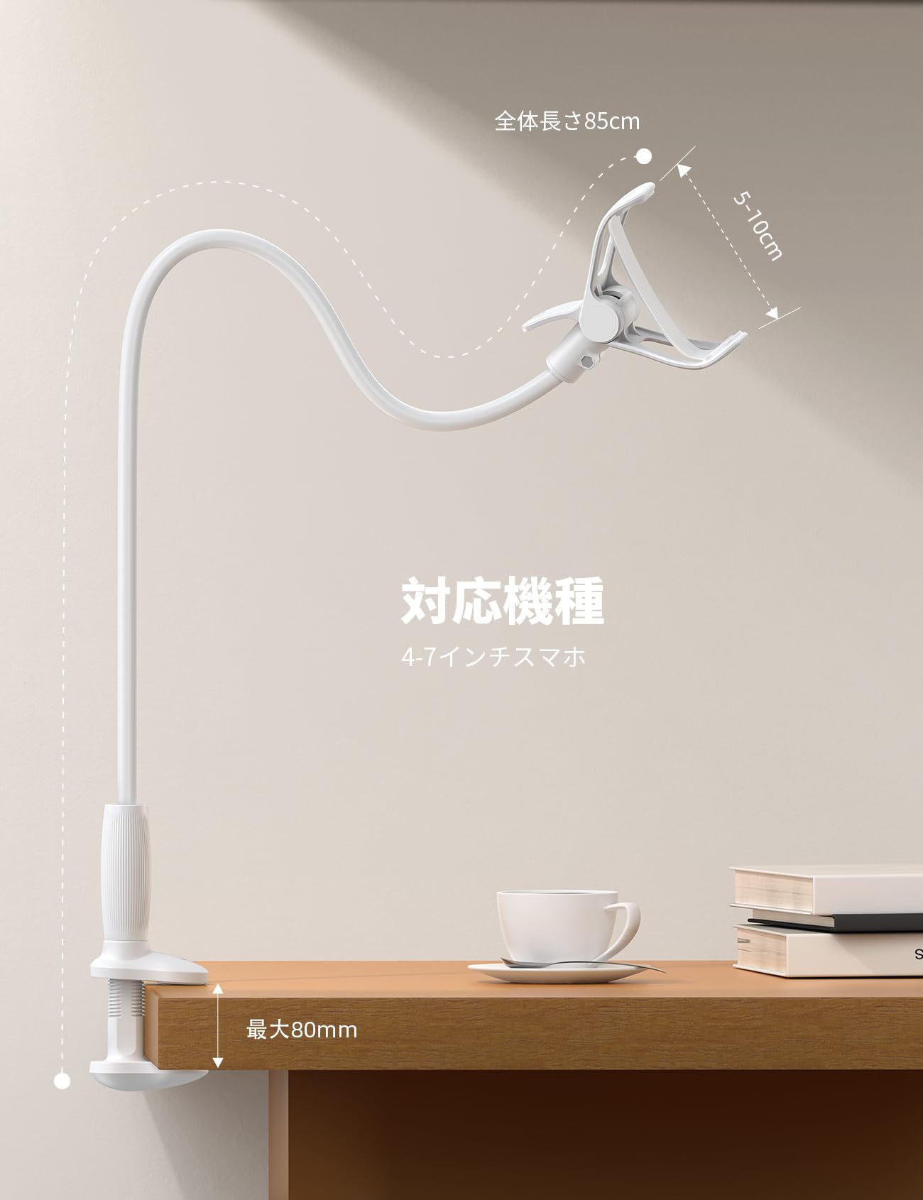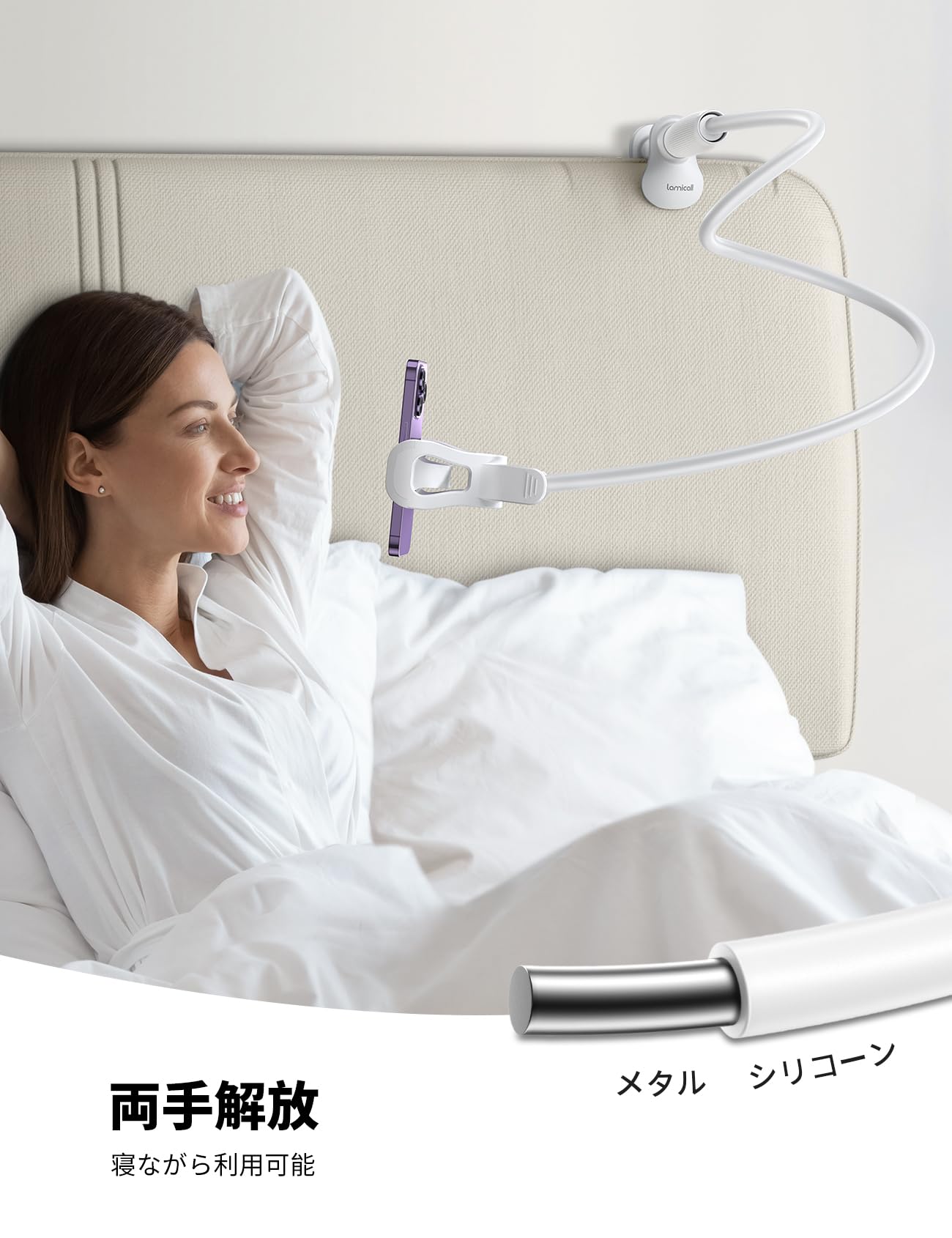 【360°回転】 Lamicall 寝ながら スマホアームスタンド : シリコーン製 携帯 すまほ フレキシブル アーム スタンド 卓上 スマホ ベット ホルダー けいたい デスク ごろ寝 机 iPhone 17e 17 Air 16e 16 15 14 plus pro promax 13 mini 12 se Huawei Xperia android アイホン アンドロイド に対応 白