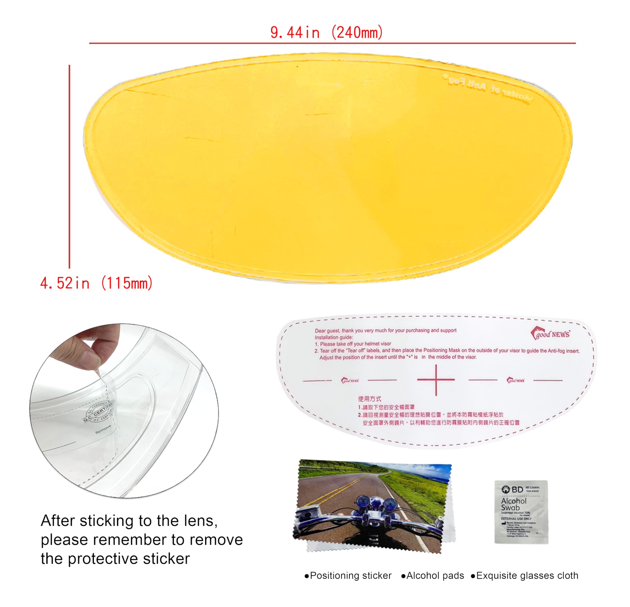 GOOD NEWS Mater of Anti-FogProduct Name: Master of Anti-FogAnti-fog Visor Insert for Full Face HelmetHeavy humidity/high temperature differences in rainy daysare the causes of fogging inside the helmet visor, whichaffects the safety of driving on road and the driver’s line of vision.The Master of Anti-Fog give the riders the clearest andthe safest riding vision.Eight EffectsWaterproofAnti-smudgeAnti-fogAnti-scratchAnti-glareAnti-reflectiondustproofHigh-definitionCautionBefore pastingPlease confirm the position of the anti-fog insert and the helmet visor, and the distance between the anti-fog insert and the eyes.Check if the insert pasting tightly with the helmet visor after hard pressingRepeatedly removal of the insert is not recommended after the pasting whichThe removal process will cause the glue on the anti-fog insert to remain on the helmet visor.It may weaken the structure of the anti-fog insert or lead to pasting defects which makesthe middle air layer unable to be fully vacuumed, resulting in fogging.