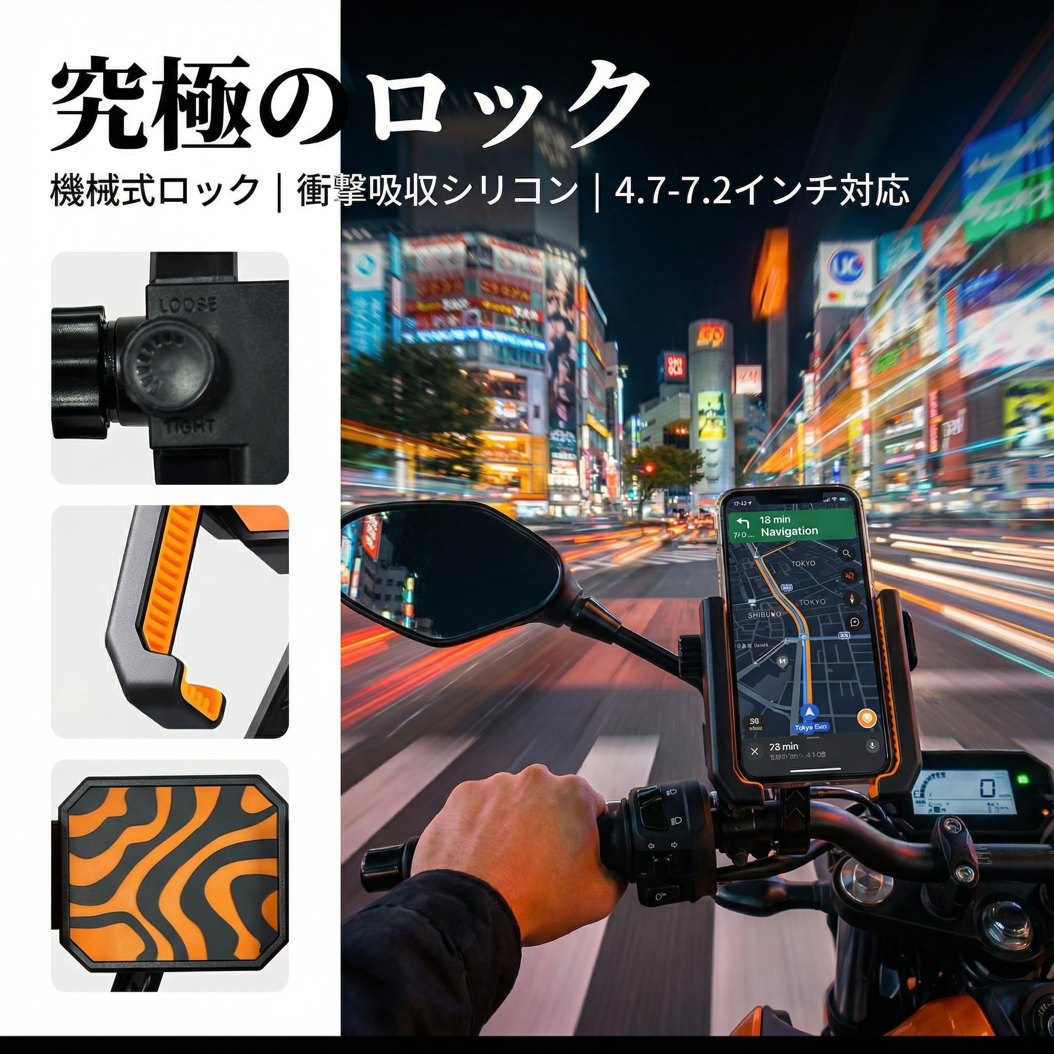 バイク用スマホホルダー バイク スマホスタンド クイック取付 原付 オートバイ 携帯ホルダー 片手操作 落下防止 360°回転 取付簡単 iPhone 17 16 15 14 Pro Max Plus Android 4.7-7インチ 多機種対応 厚手ケース対応 頑丈 (オレンジ)