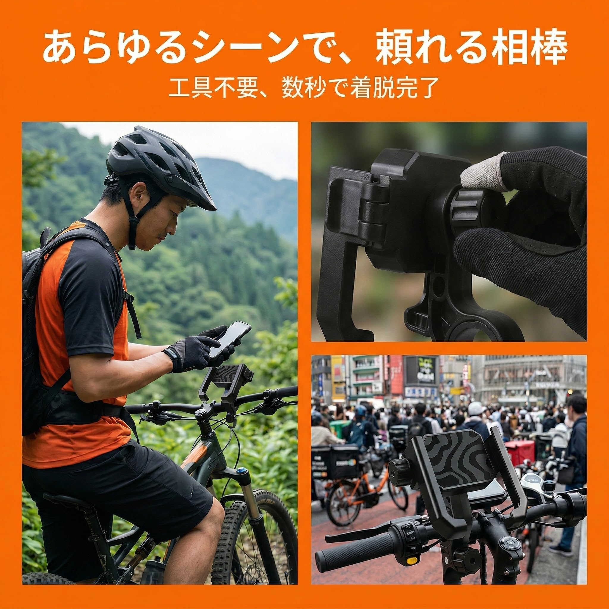 自転車用スマホホルダーは、回転式クランプアームにより工具不要で簡単に取り付けられ、強力な固定力で悪路でもガタつかずスマホを守ります。 初回設定時は右側ロックを閉じ、ダイヤルで幅を調整するだけで簡単に固定。 以降はワンタッチロックで素早くスマホの着脱が可能で、忙しい朝の通勤・通学にも最適です。 360° 無段階回転機能により、縦向き・横向きなど自由に角度調整ができ、ナビゲーションや音楽操作がしやすくなります。 クランプ内径は 75mm~95mm に対応し、4.7 インチ以上の多くのスマホ機種に対応。 カメラ部分を遮らない設計なので、撮影の邪魔になりません。 コンパクトなサイズ(14×10×9.5cm)で使い勝手が良く、自転車通勤者、通学者、サイクリング愛好家、配達業務の方など、幅広い層におすすめです。 安定性・利便性・機能性を兼ね備えた、自転車アクセサリーの必需品です。