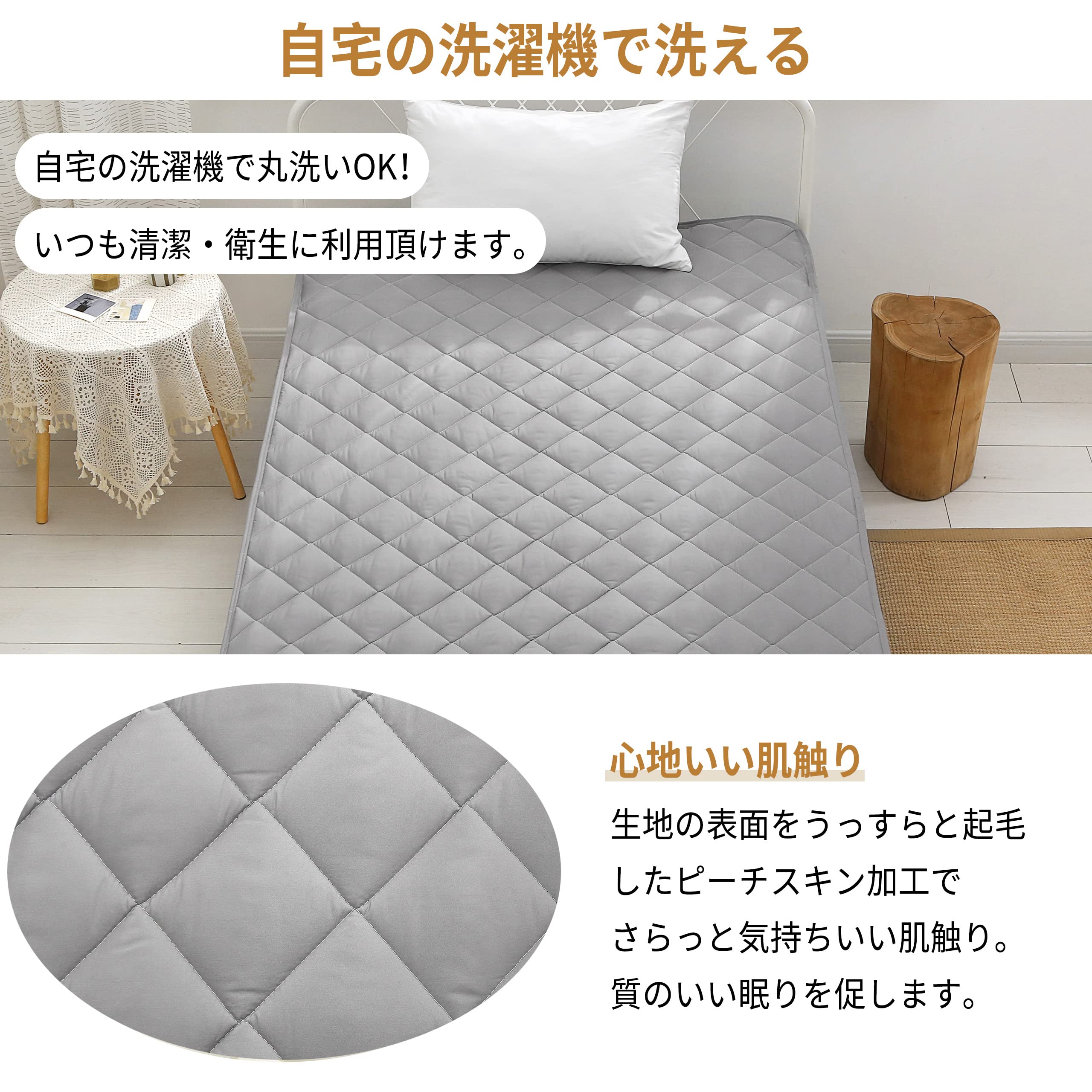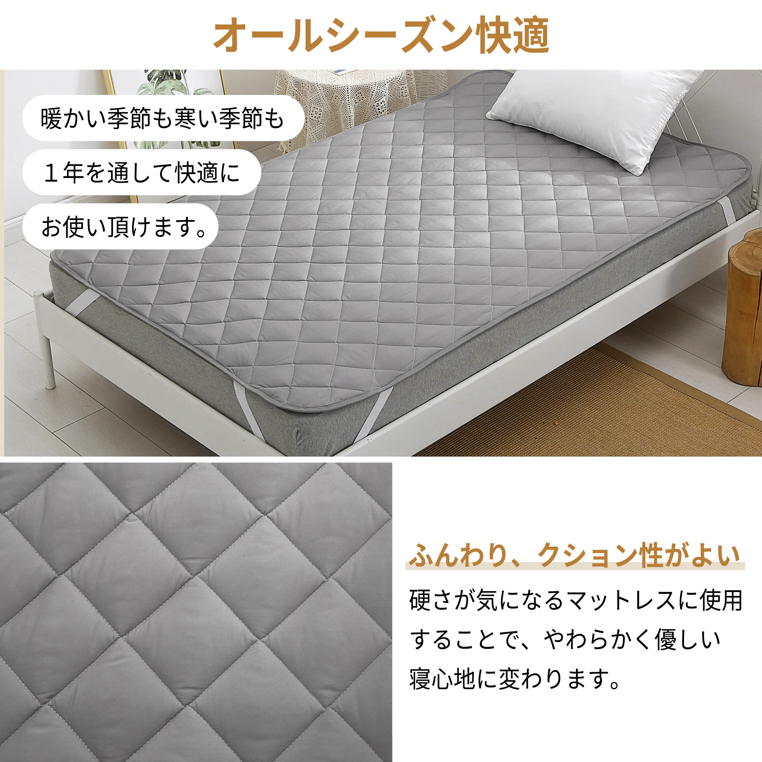 ベッドパッド ベッドパッドとは、ベッドシーツとマットレスの間に敷き、肌に直接触れない敷寝具です。 「コレが無いと、ものすごく困る!」ということはありませんが、マットレスをご利用なら敷いておいたほうが良いアイテムです。 マットレスを汚さず、永くキレイにご使用するにはベッドパッドがとても役に立ちます。マットレスは基本的に洗う事ができません。洗うことができるマットレスもありますが、手軽に洗えるものではないですよね。 人は寝ているとき、体温調節のために寝汗をかきます。 ベッドパッドを敷くことで、寝汗からマットレスを守ってくれるのです。ご家庭での洗濯が可能なものであれば、普段のお手入れも面倒なくできます。 また、ベッドパッドに使用されている中材によってクッション性が上がり、寝心地がより良くなります。体にマットレスのコイルが当たる感覚の軽減や、ゴロンと寝そべった時の寝心地をお好みにあったものに調整できます。 さらに、マットレスにかかる負荷を軽減出来るので、マットレス自体のヘタリ防止もできるんです。 ベッドパッドは優しく体を支えてくれて、マットレスも守ってくれる優れものなんです! ベッドパッドには薄手の汗取りタイプと厚手の寝心地調整タイプに大別されますが、Anminharuのベッドパッドはちょうどいい中厚なので両対応です。どちらを選べばいいか迷ったときにはピッタリです。