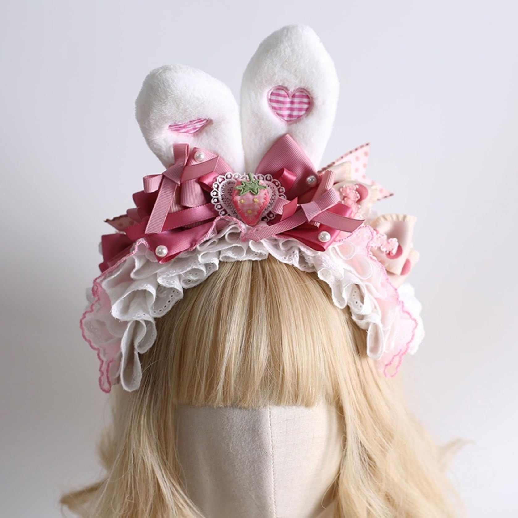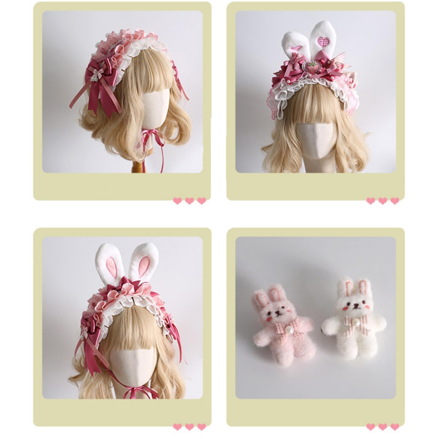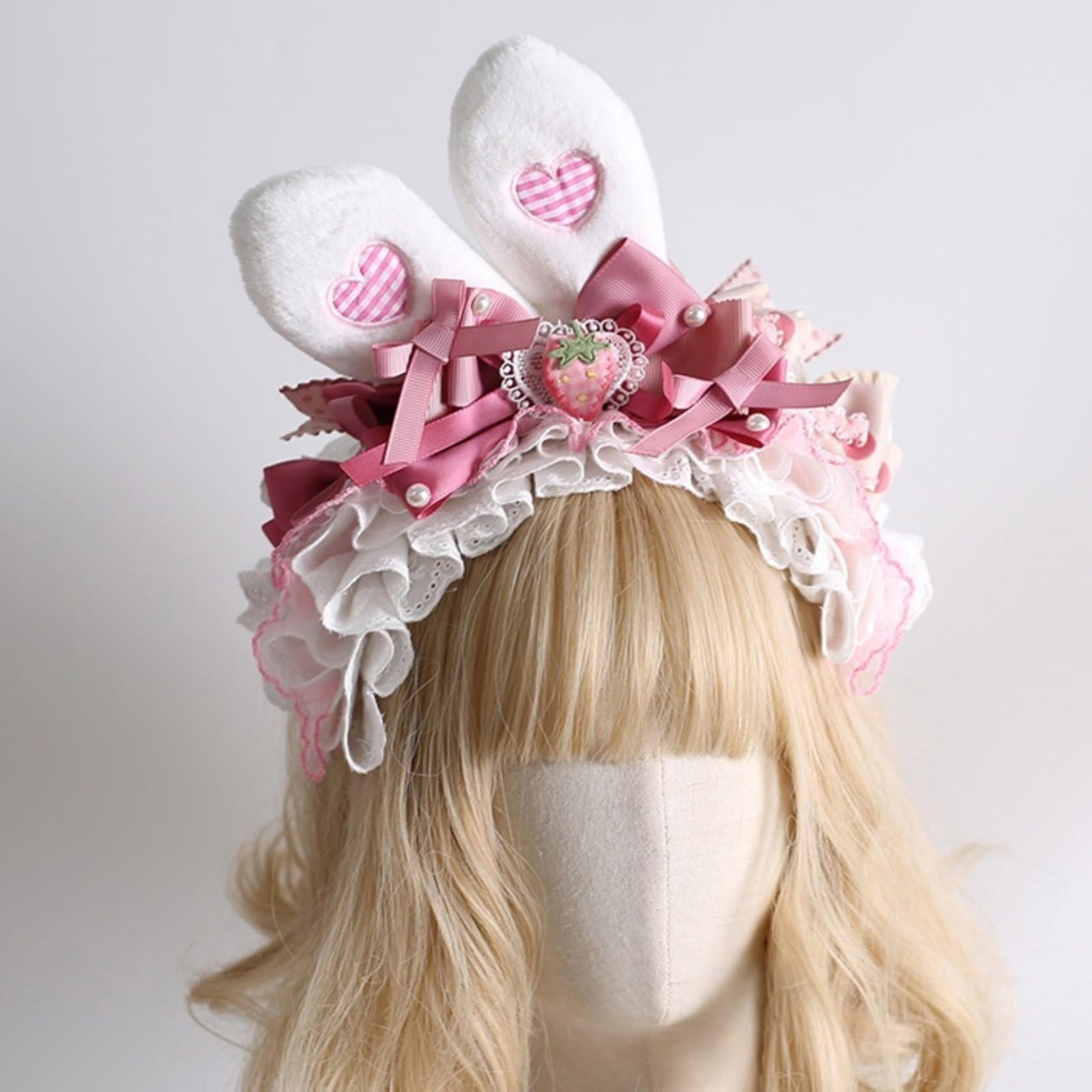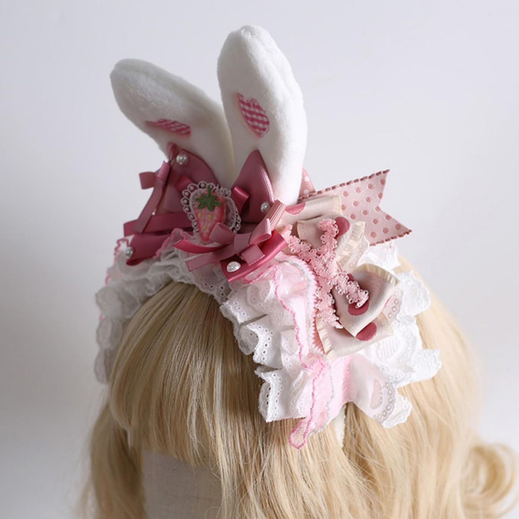 [ボズとガルヤ] 兎耳 髪飾り カチューシャ ロリータ 可愛い ピング ウサギ 姫系 リボン レース フリル コスプレ 蝶結び もこもこ パール ヘアアクセサリー おしゃれ 女の子 茶話会 パーティー 甘ロリ 華麗 学園祭