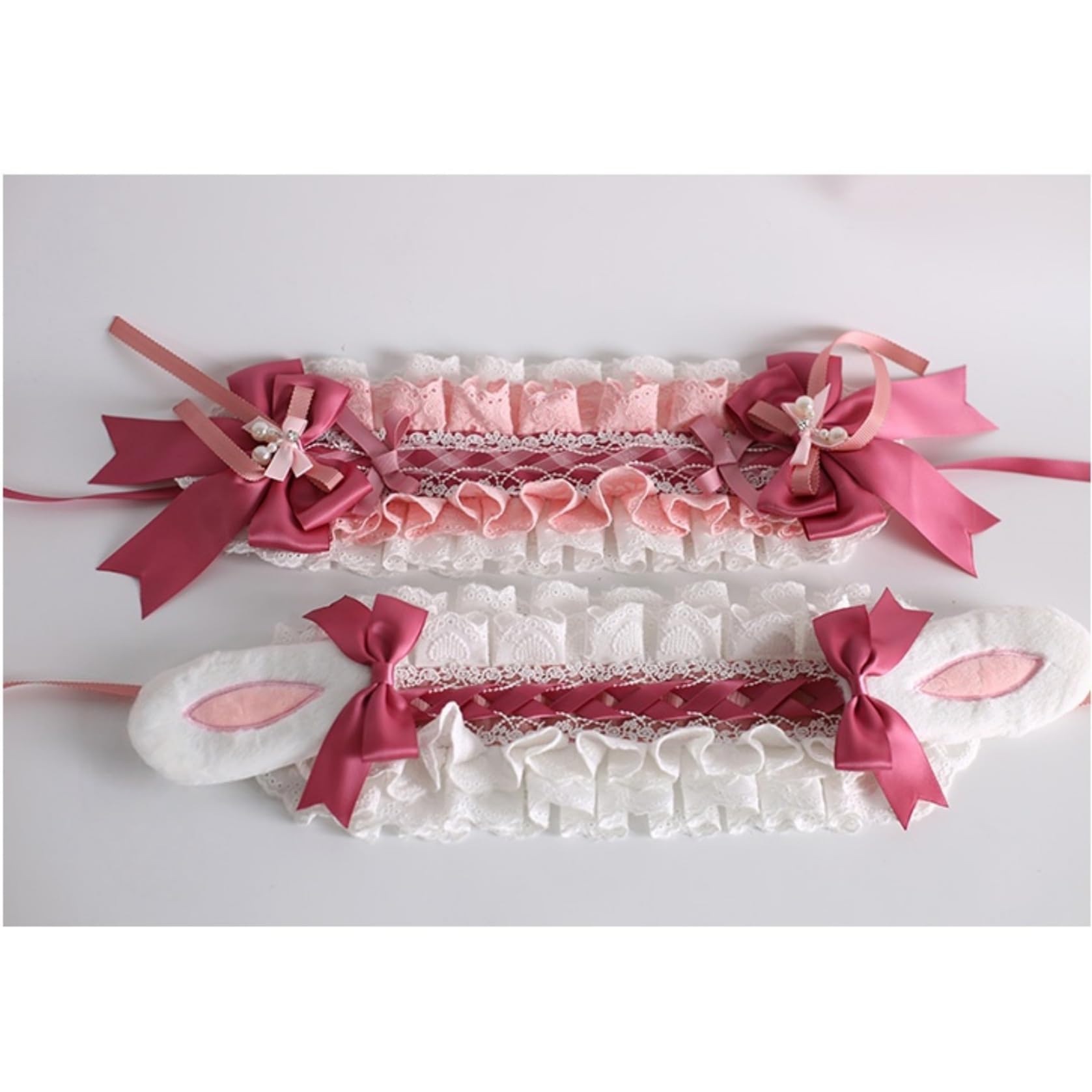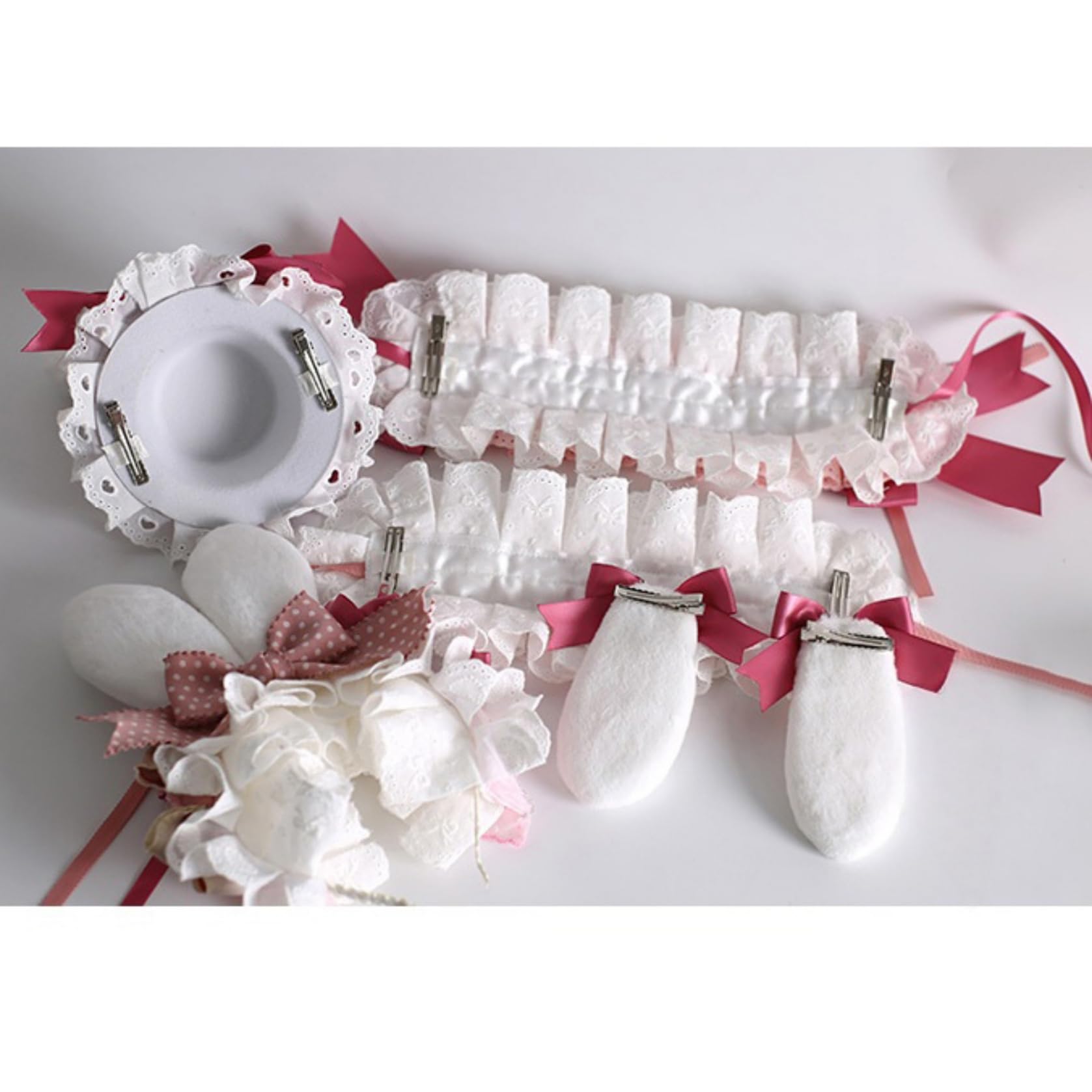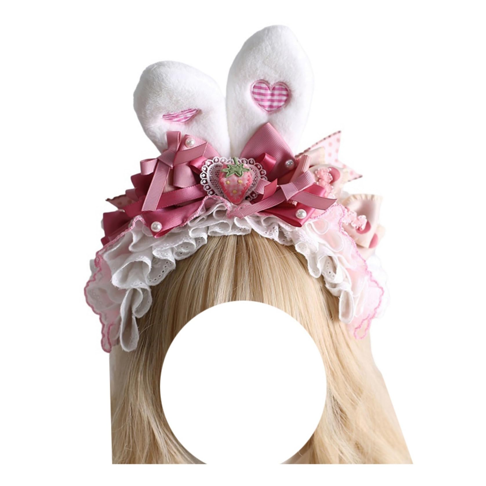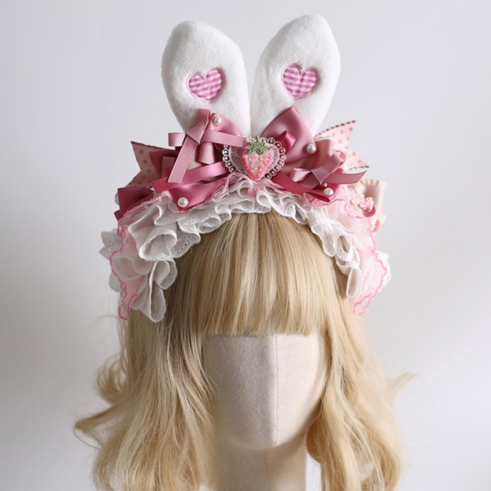 [ボズとガルヤ] 兎耳 髪飾り カチューシャ ロリータ 可愛い ピング ウサギ 姫系 リボン レース フリル コスプレ 蝶結び もこもこ パール ヘアアクセサリー おしゃれ 女の子 茶話会 パーティー 甘ロリ 華麗 学園祭