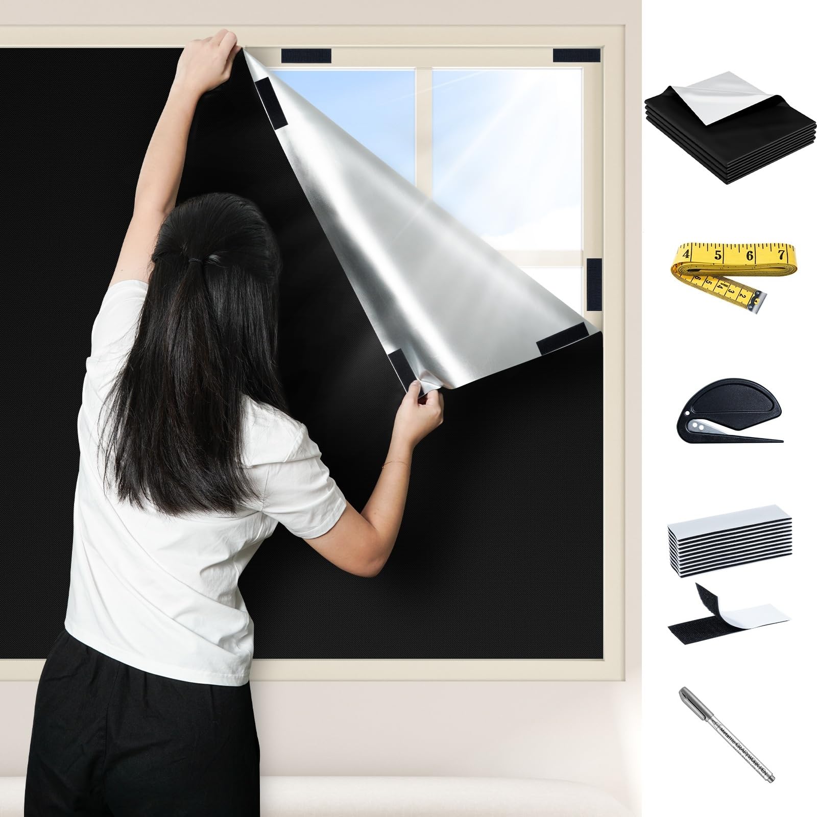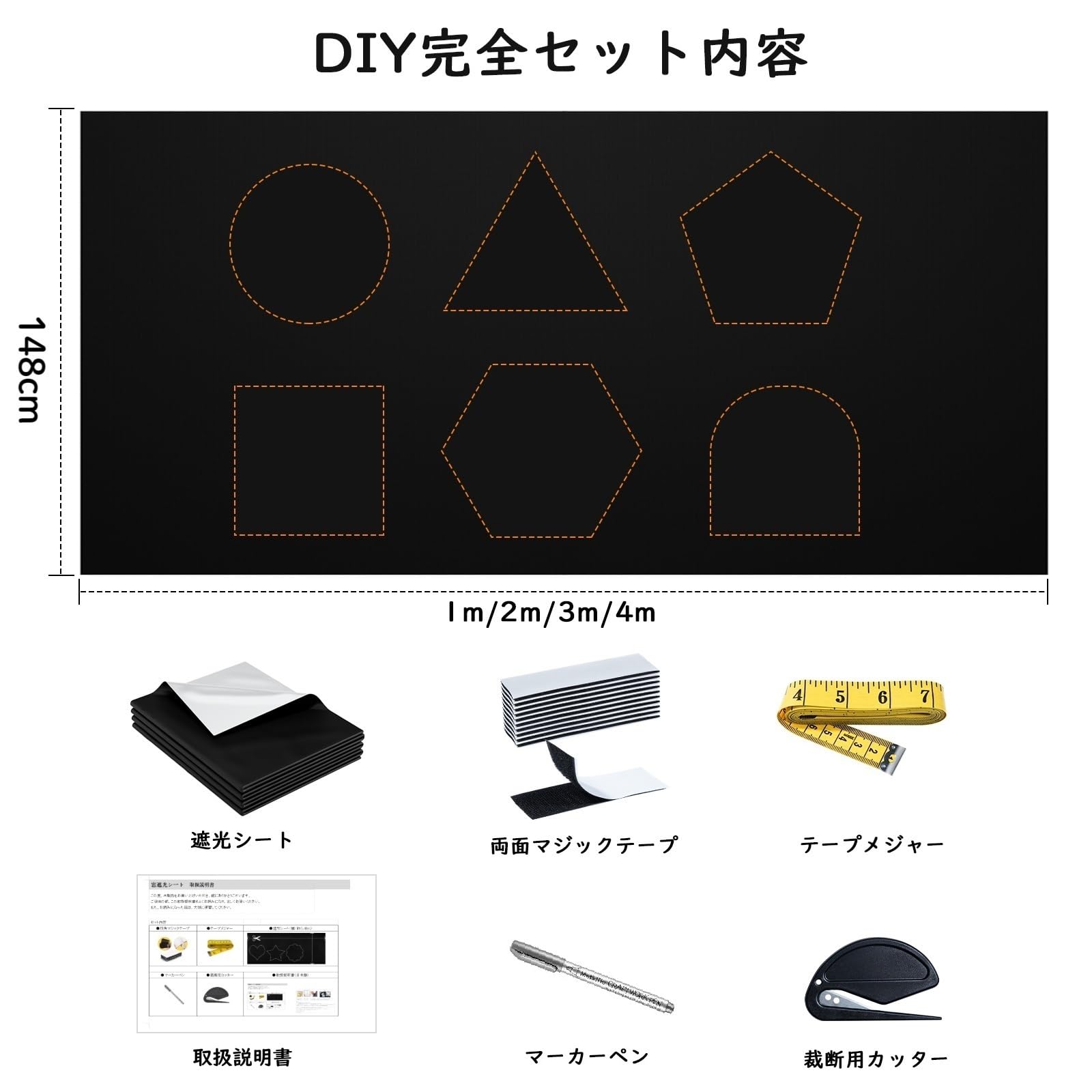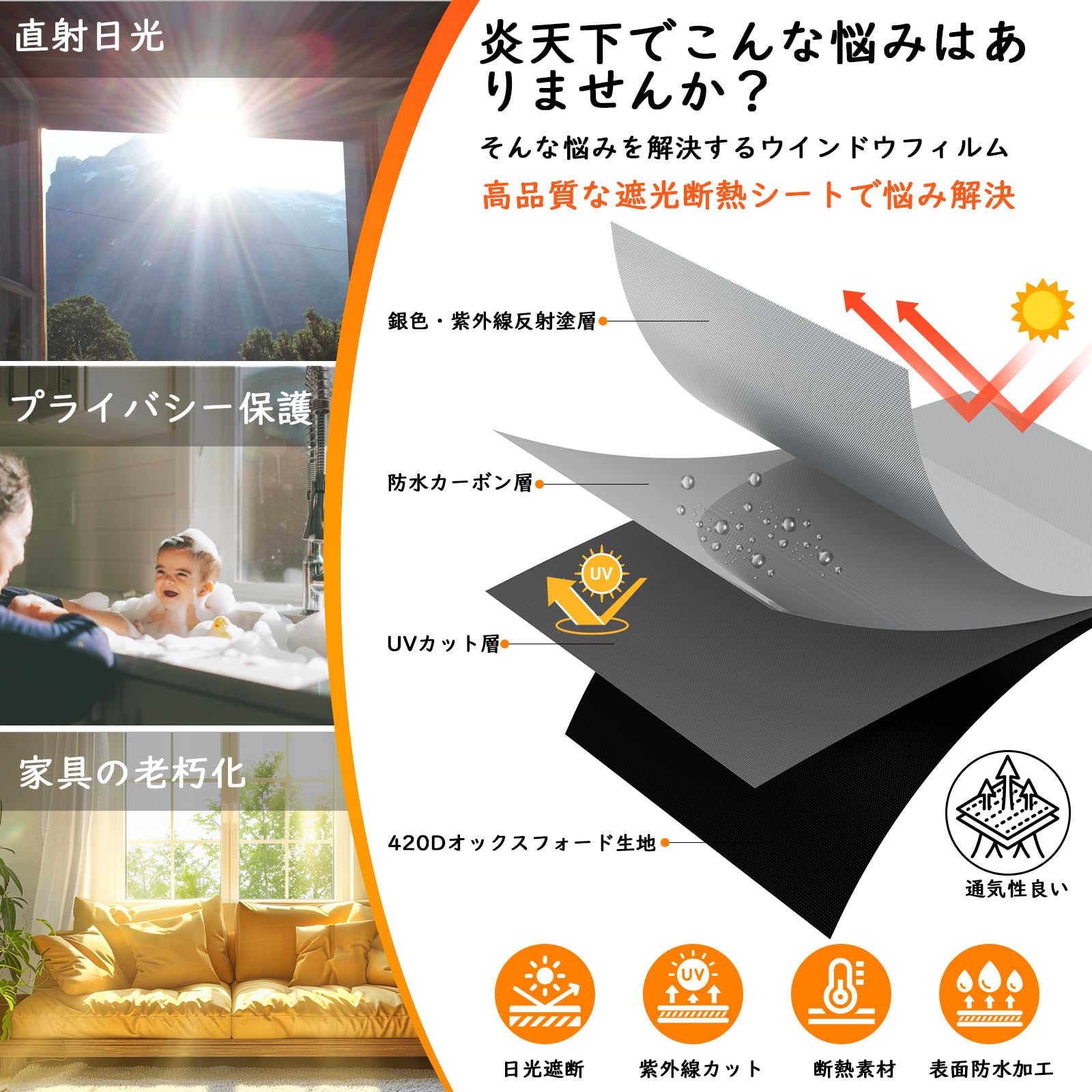 遮光シート 窓断熱シート 紫外線遮断 UVカット 420dオックスフォード 窓ガラス 遮光断熱シート 日除け 目隠し 西日対策 窓 布 カーテン 防水 貼付簡単 浴室 風呂場 寝室 (2M*148cm, DIY完全セット, 1)