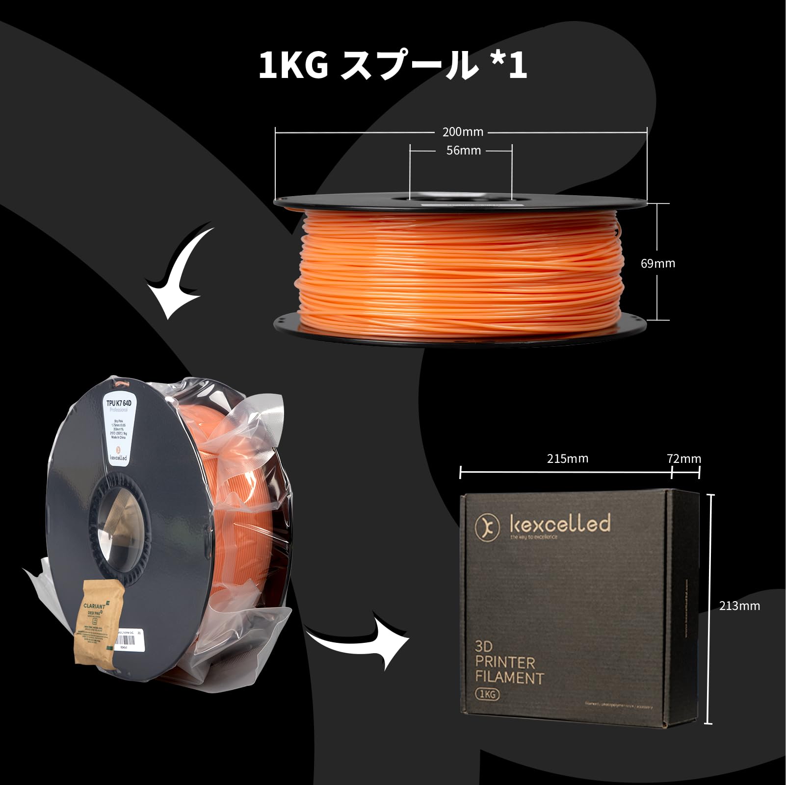 kexcelled 3Dプリンター TPUフィラメント 64D 1.75mm径 正味量1KG(2.2LB) 寸法精度+/-0.05mm 柔軟性も耐久性も優れる新型素材 フジ