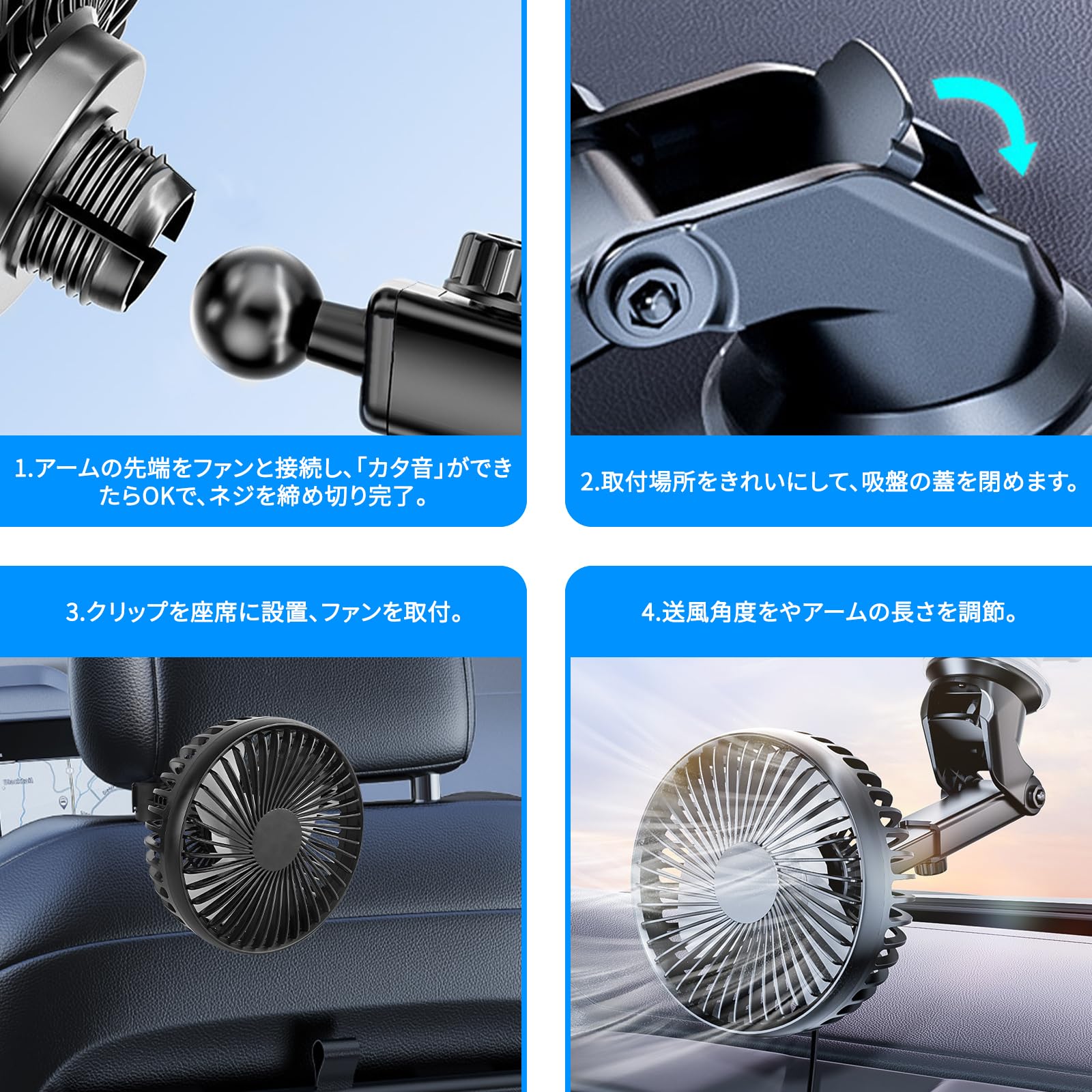 車 扇風機 USB給電 2WAY設置 3段階風量調節 車用ファン 吸盤 クリップ式 60度調整可能 伸縮アーム ダッシュボード 後部座席用 (1)