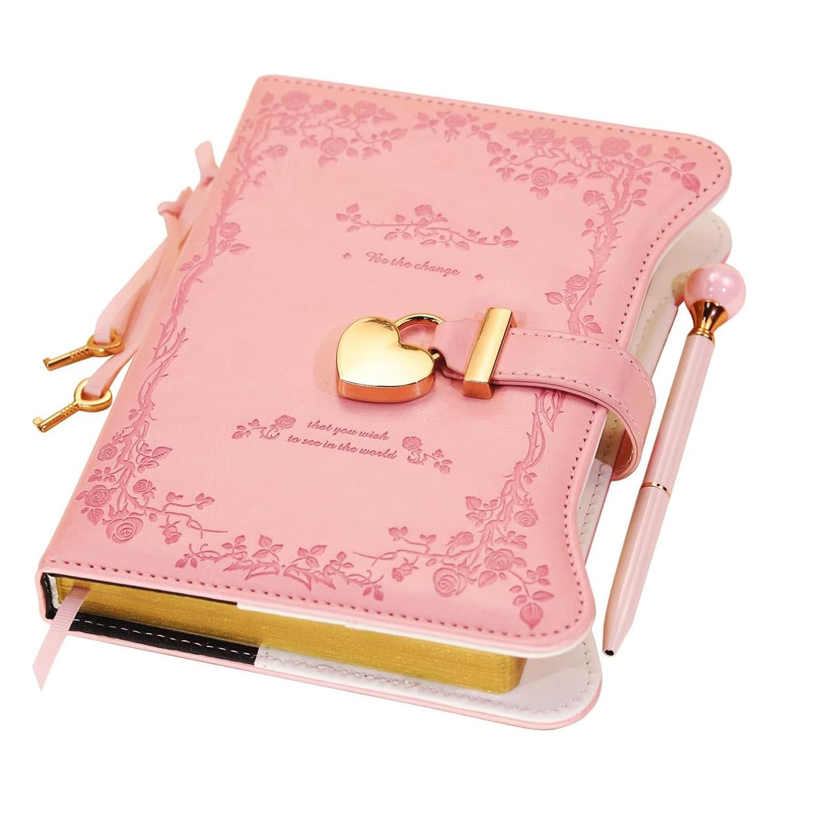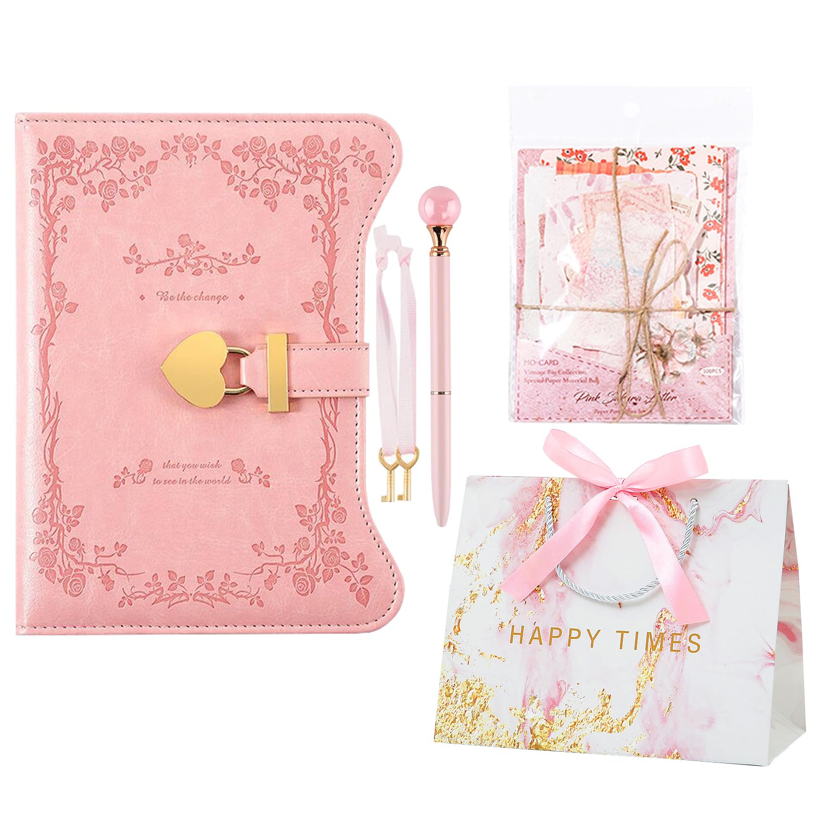 ELECTRO-WEIDEWORLD 鍵付きノート セット 日記帳 鍵付き 日記 B6 詰め替え可能 横罫 小学生 日記 鍵付き日記帳 ジャーナル diary PUレザー ラッピング袋付き 小学生 秘密 交換日記 プレゼント 誕生日 文房具 (ピンク)
