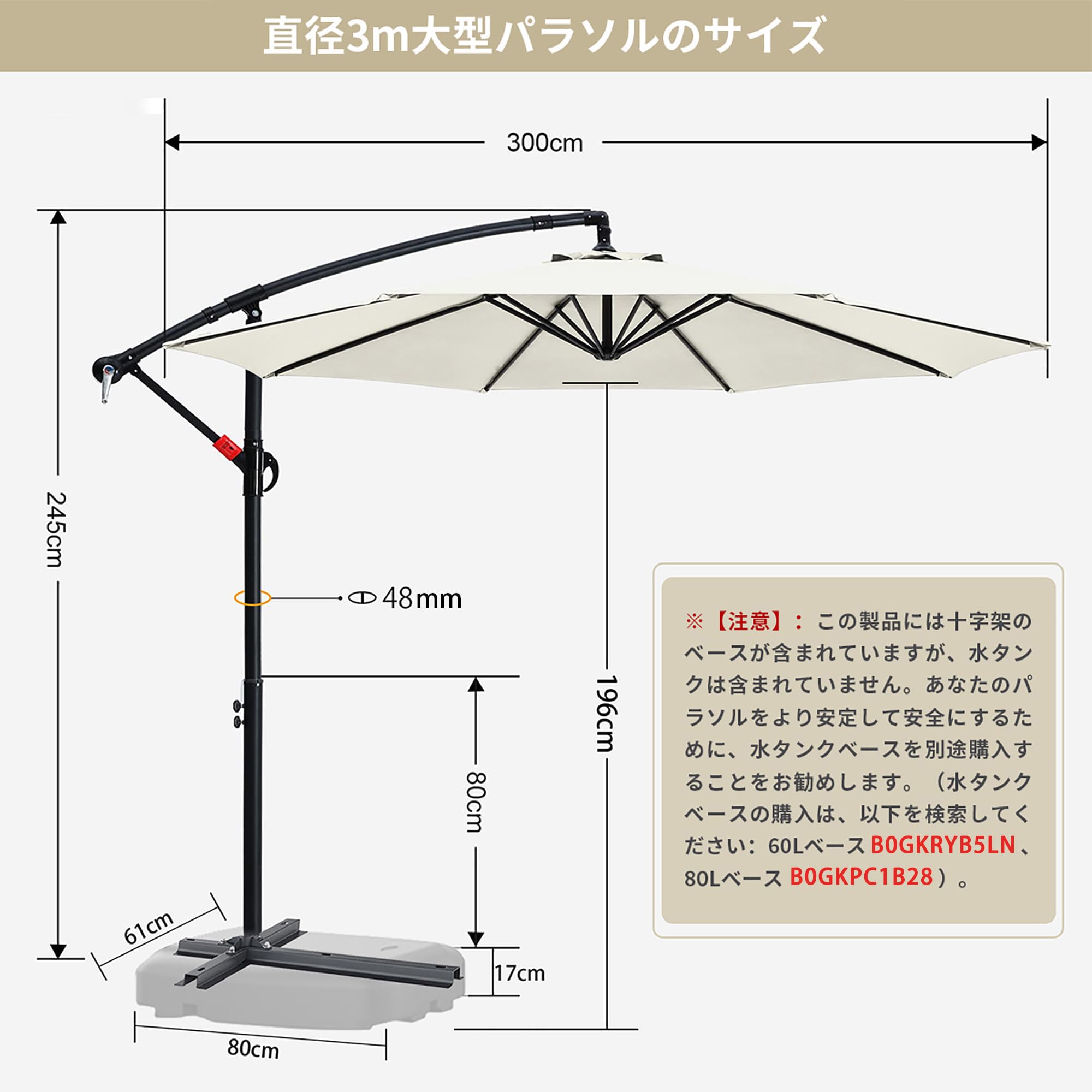 ViCoopZim ガーデンパラソル 大型 ハンギング 直径300cm UVカット 撥水 風に強い 角度調整 クランク式 自立式 屋外用 パラソルカバー付き