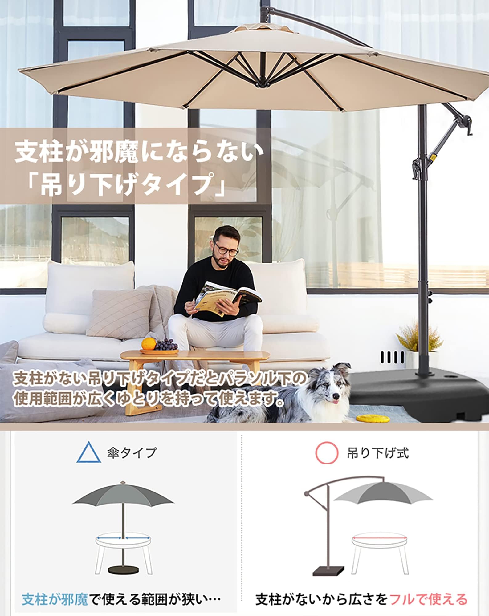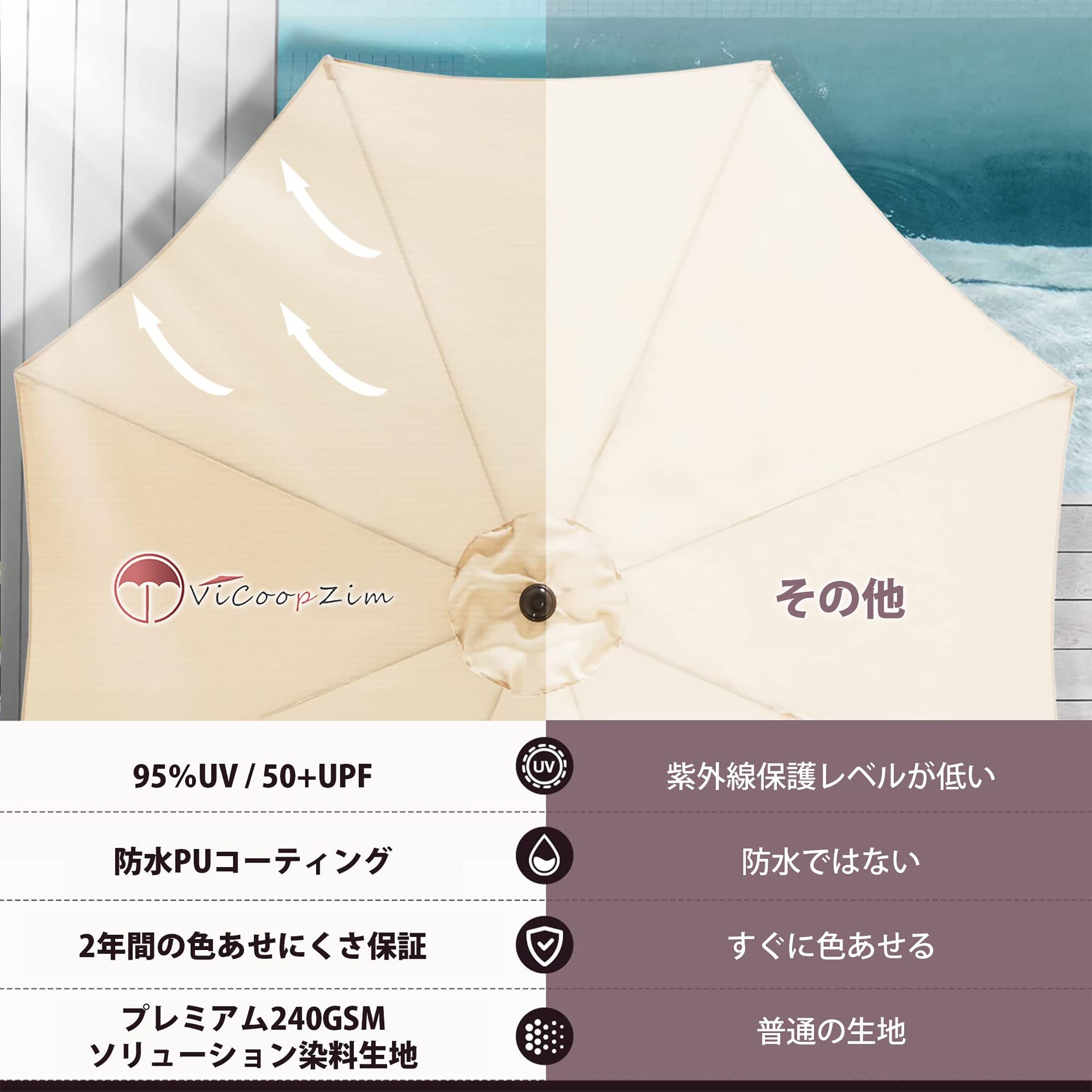 ViCoopZim ガーデンパラソル 大型 ハンギング 直径300cm UVカット 撥水 風に強い 角度調整 クランク式 自立式 屋外用 パラソルカバー付き