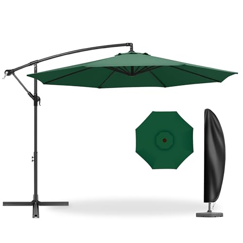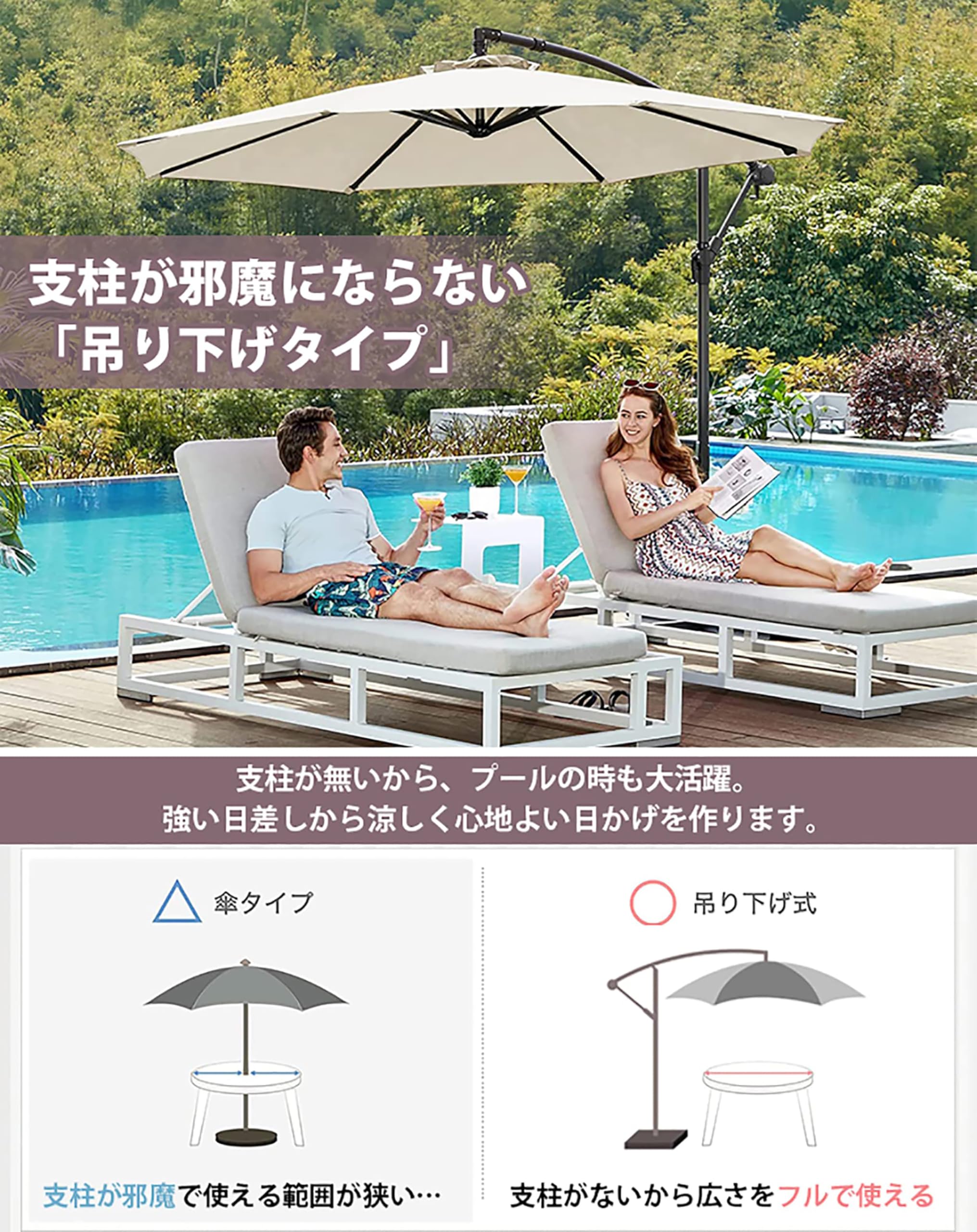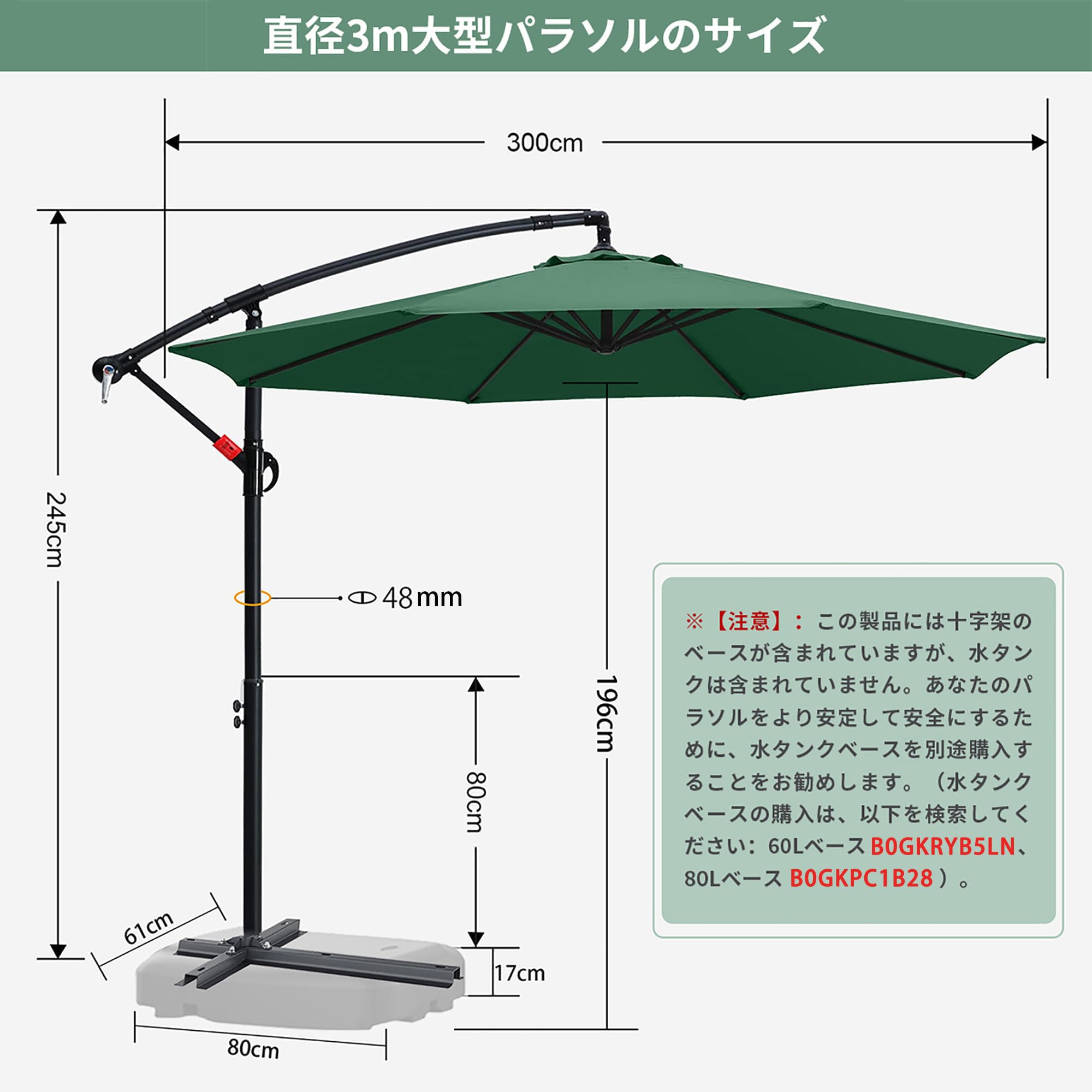 ViCoopZim ガーデンパラソル 大型 ハンギング 直径300cm UVカット 撥水 風に強い 角度調整 クランク式 自立式 屋外用 パラソルカバー付き