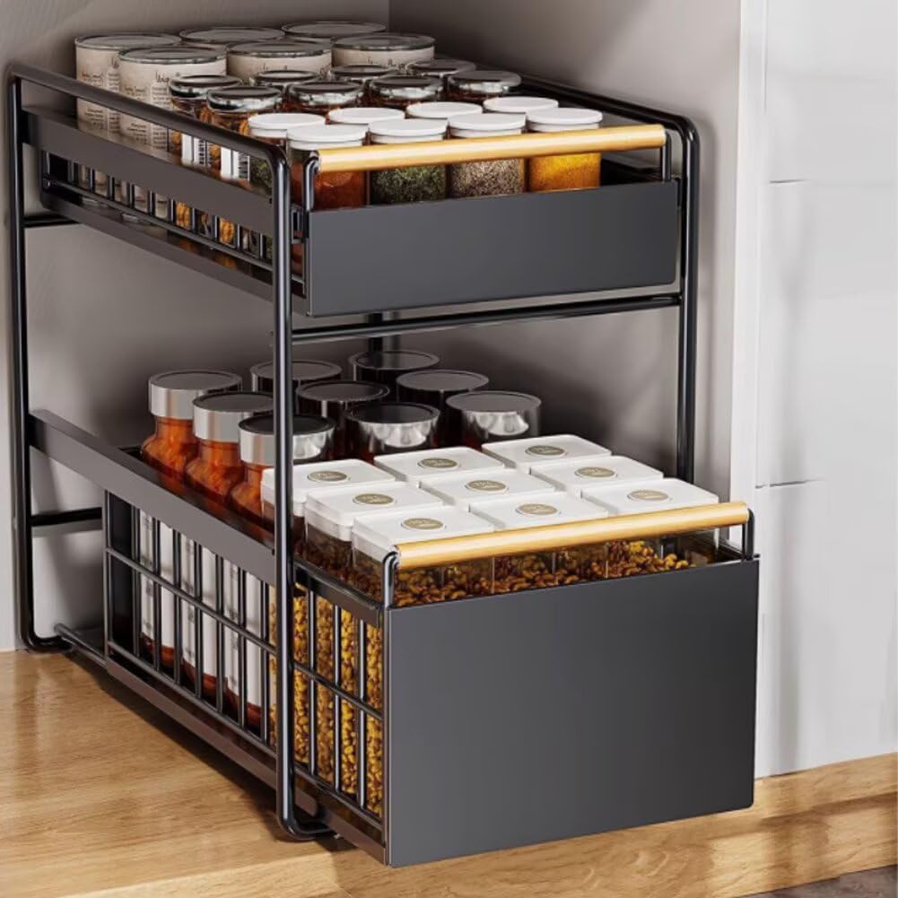 TATIU シンク下 収納 スライド式 シンク下収納ラック 2段 引き出し キッチン収納 洗面台下 洗面所 調味料 収納 金属製 高さ調節可能 大容量 耐荷重 組立簡単 省スペース キッチン/バスルーム/ランドリールーム ブラック