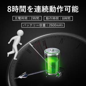 2600mAhの大容量バッテリーが内蔵され、一度フル充電すれば、約8時間動作可能です。USB充電ケーブル付属付、パソコン、モバイルバッテリー、車載USB充電器などのUSBポートに差し込むだけの簡単操作で充電できます。